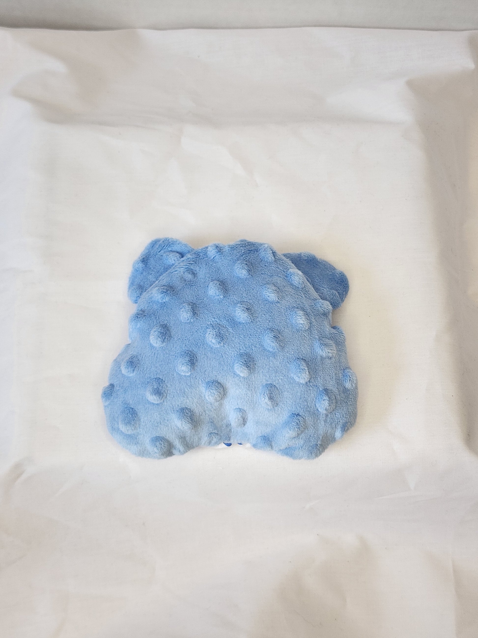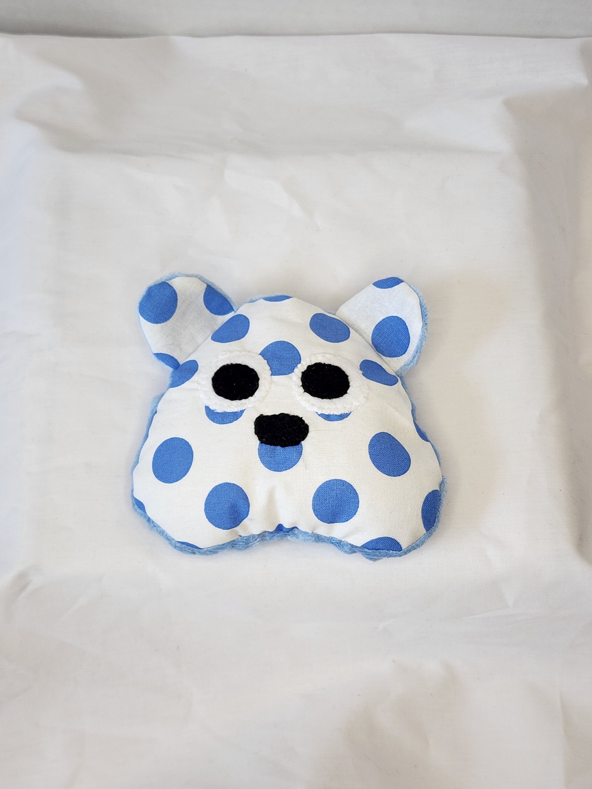 This is a custom, handmade one-of-a-kind Bear Head Handheld fidget. It is made with ble polka dot cotton front, with light blue Dimple Dot backing. This one has Crinkle material in both of the ears. It is filled with plastic beads in a separate pouch for some movement. Perfect for all ages, it offers a plush and cozy feel with some added noise.