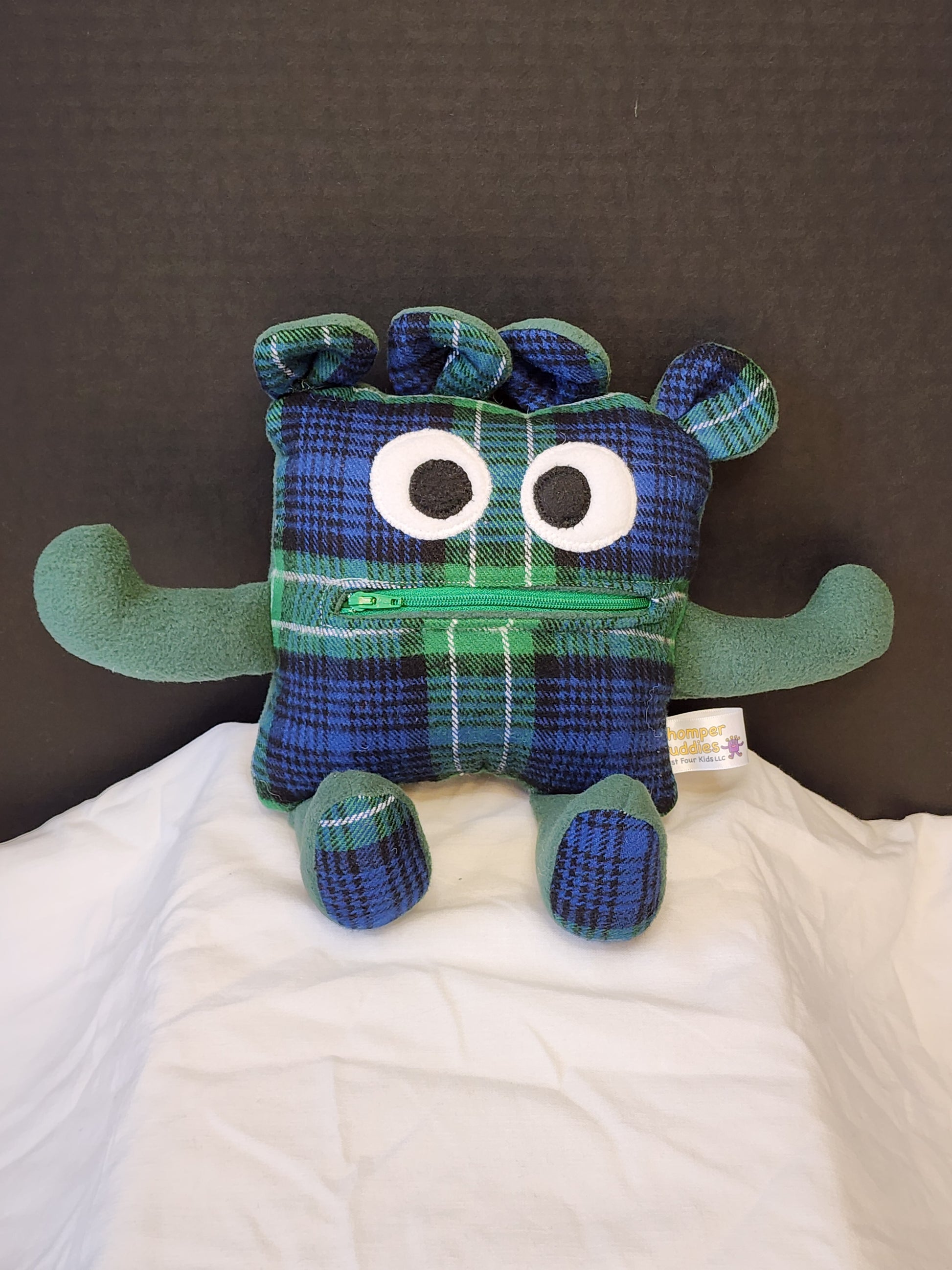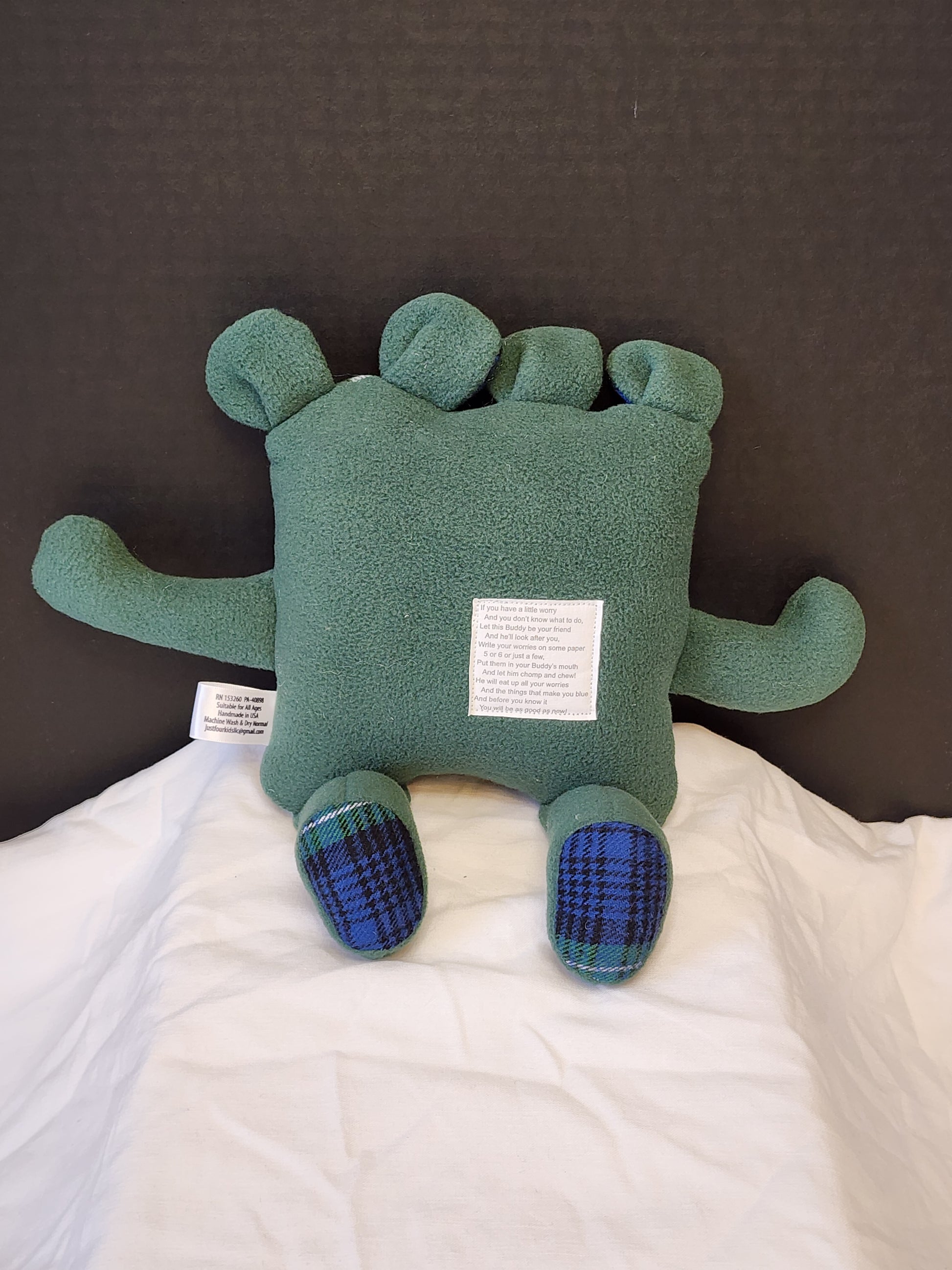 This custom, one-of-a-kind Chomper Buddy is Green plaid and solid green fleece with plaid lining is ready to chomp any anxieties or worries away! Once you write or draw your worries on paper, you can feed your worries to the Chomper. Lose a tooth, put it in the Chompers mouth for the Tooth Fairy or even a Christmas list for Santa to take out of the zipper mouth. Perfect for all ages, it offers a plush and cozy feel with superior durability for tons of hugs and cuddles.