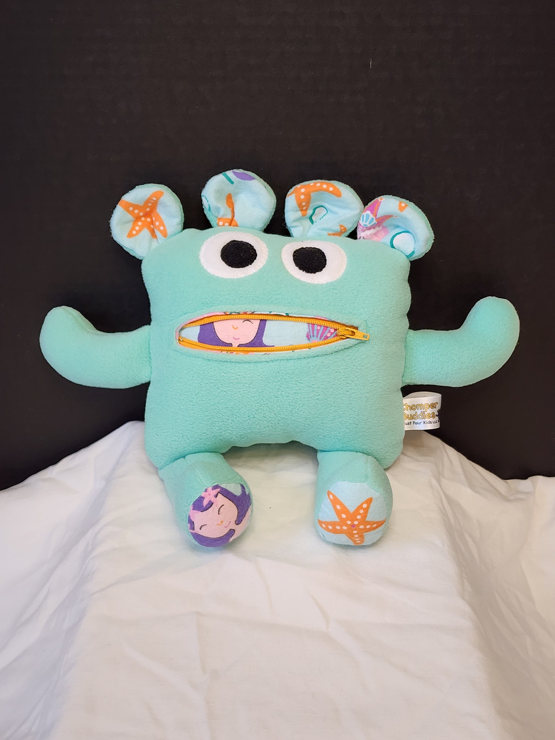 This custom, one-of-a-kind Chomper Buddy is teal fleece with mermaid lining is ready to chomp any anxieties or worries away! Once you write or draw your worries on paper, you can feed your worries to the Chomper. Lose a tooth, put it in the Chompers mouth for the Tooth Fairy or even a Christmas list for Santa to take out of the zipper mouth. Perfect for all ages, it offers a plush and cozy feel with superior durability for tons of hugs and cuddles.