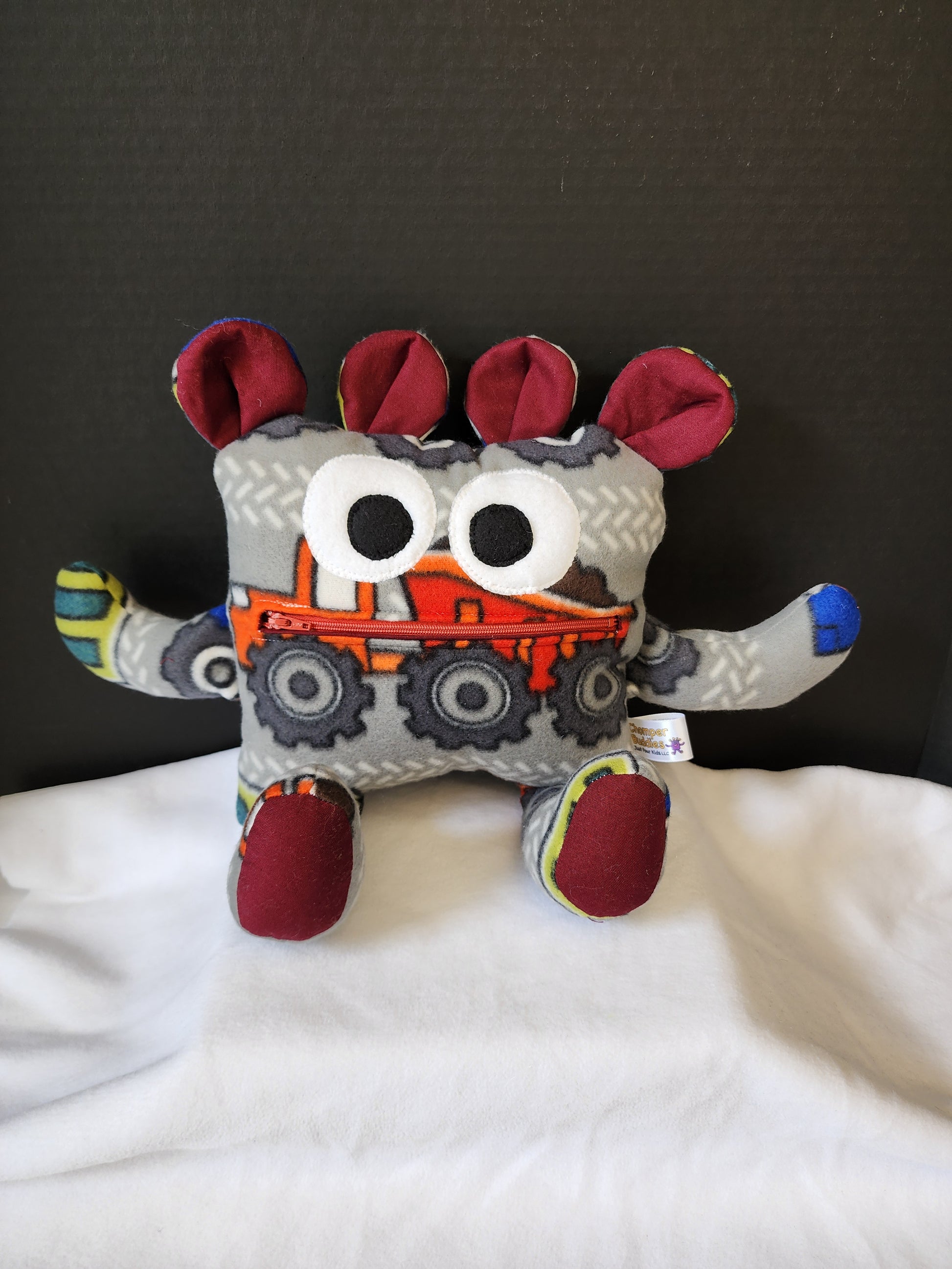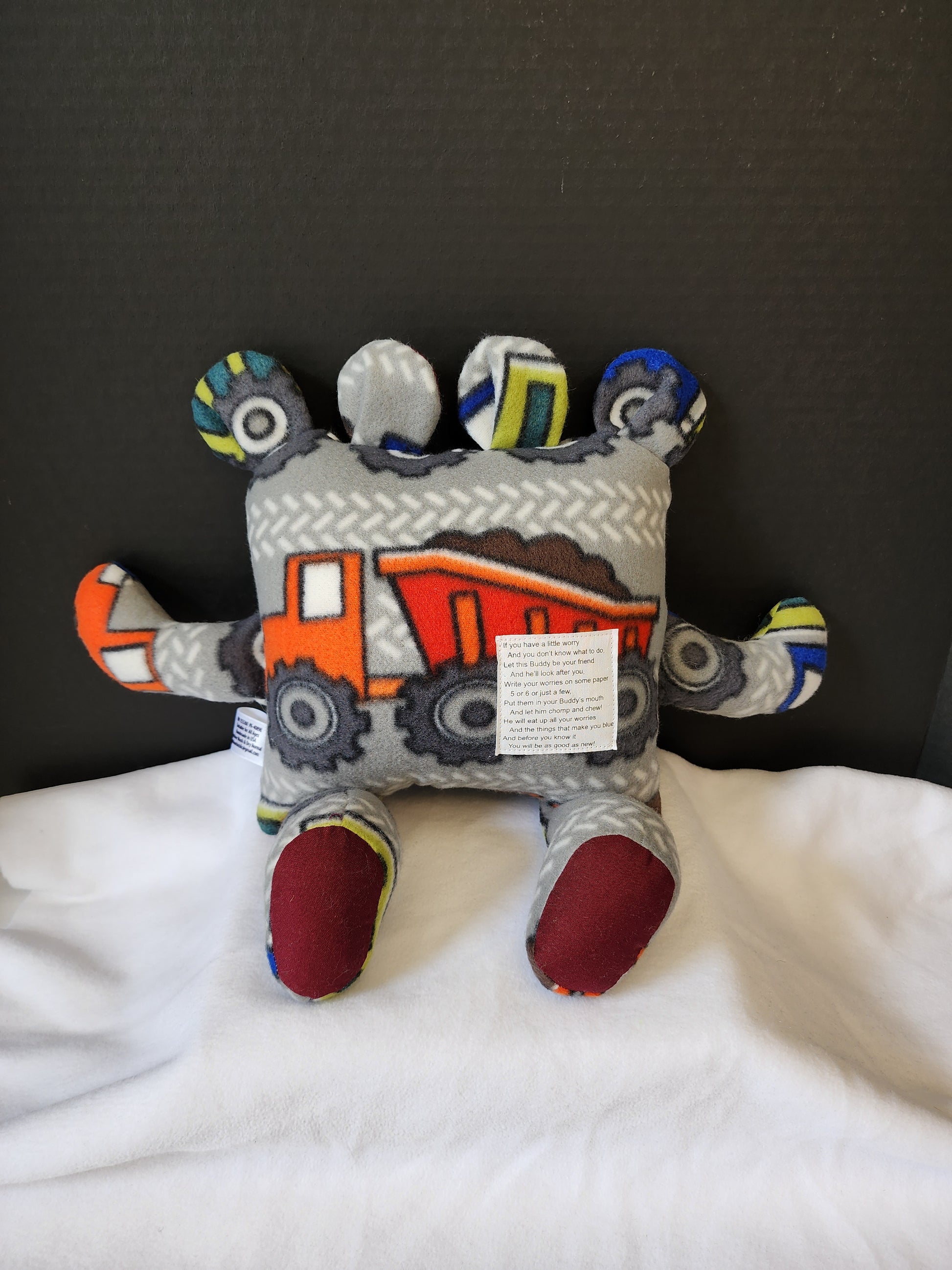 This custom, one-of-a-kind Chomper Buddy is excavator and dump truck fleece with burgundy lining and ready to chomp any anxieties or worries away! Once you write or draw your worries on paper, you can feed your worries to the Chomper. Lose a tooth, put it in the Chompers mouth for the Tooth Fairy or even a Christmas list for Santa to take out of the zipper mouth. Perfect for all ages, it offers a plush and cozy feel with superior durability for tons of hugs and cuddles.