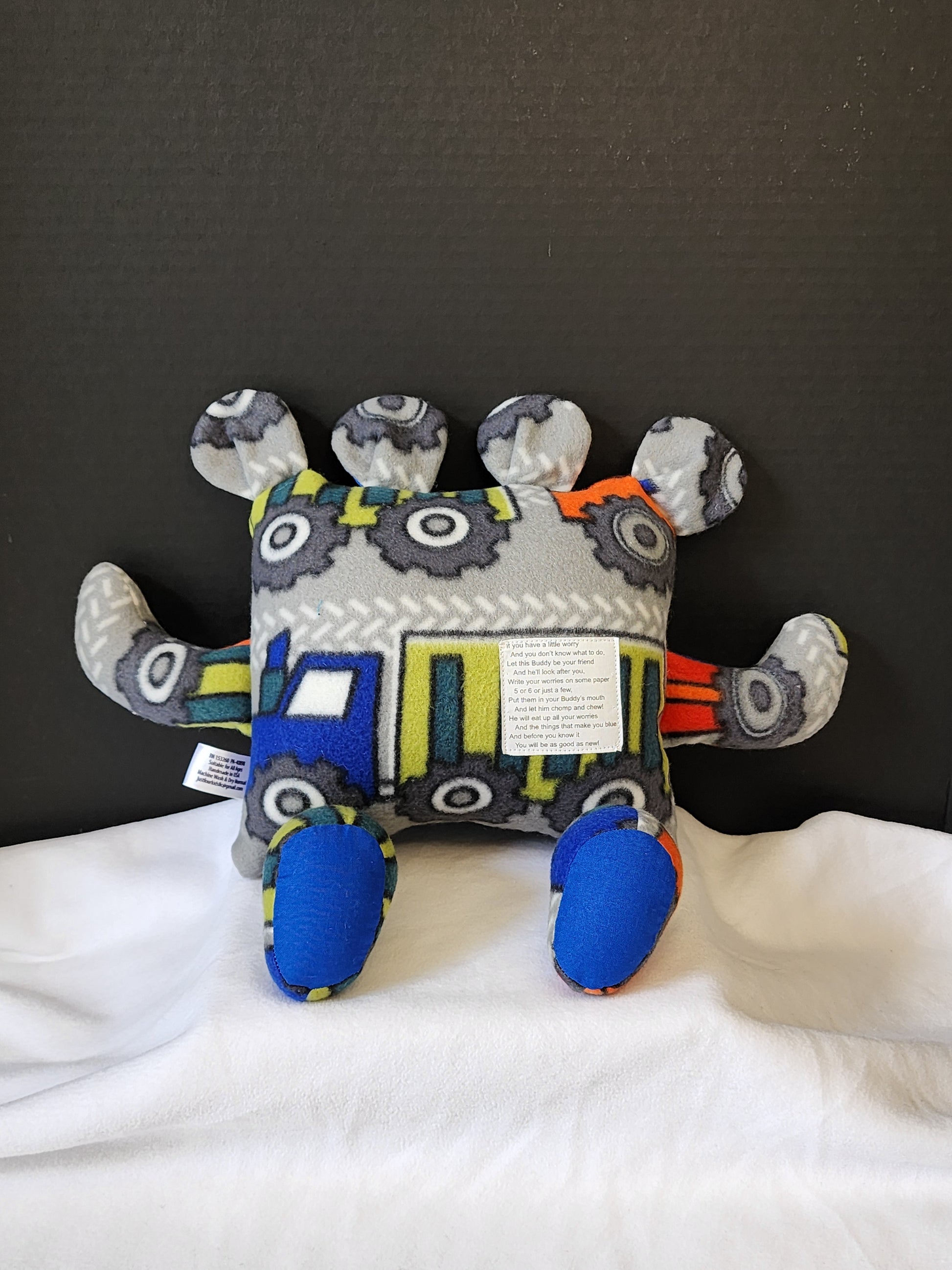 This custom, one-of-a-kind Chomper Buddy is excavator and dump truck fleece with bright blue lining and ready to chomp any anxieties or worries away! Once you write or draw your worries on paper, you can feed your worries to the Chomper. Lose a tooth, put it in the Chompers mouth for the Tooth Fairy or even a Christmas list for Santa to take out of the zipper mouth. Perfect for all ages, it offers a plush and cozy feel with superior durability for tons of hugs and cuddles.