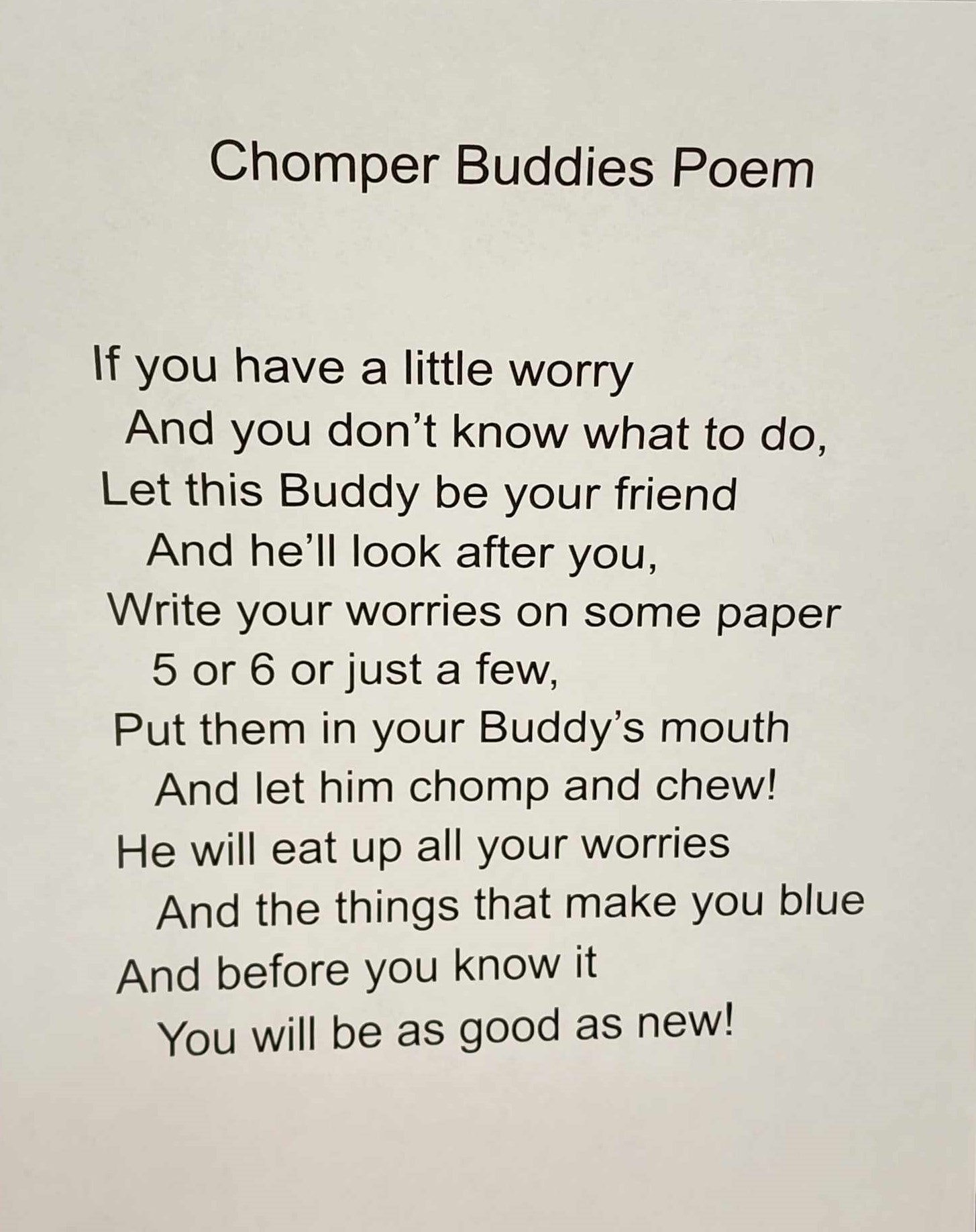 This custom, one-of-a-kind Chomper Buddy is light blue fleece with water pattern lining and ready to chomp any anxieties or worries away! Once you write or draw your worries on paper, you can feed your worries to the Chomper. Lose a tooth, put it in the Chompers mouth for the Tooth Fairy or even a Christmas list for Santa to take out of the zipper mouth. Perfect for all ages, it offers a plush and cozy feel with superior durability for tons of hugs and cuddles.