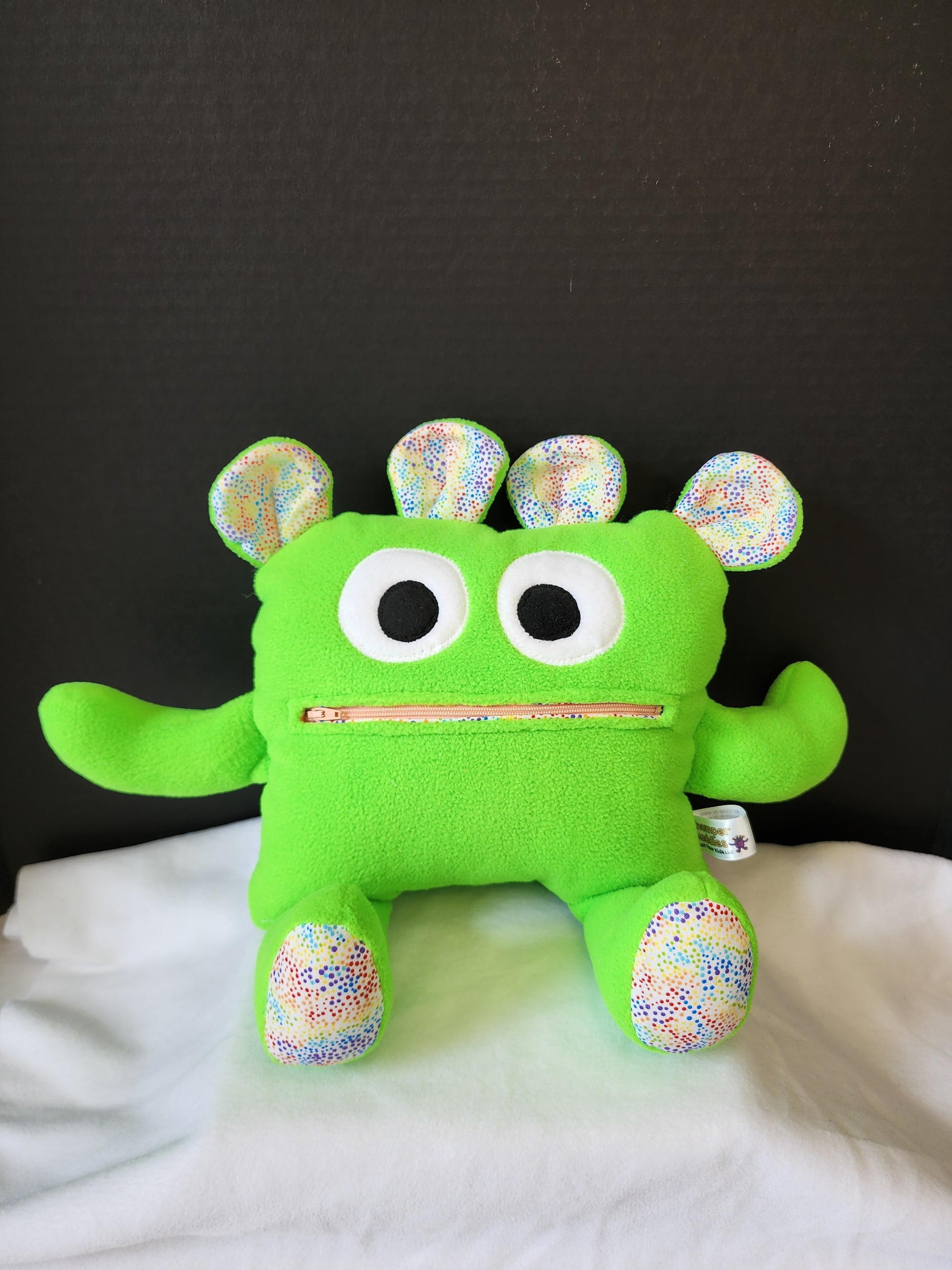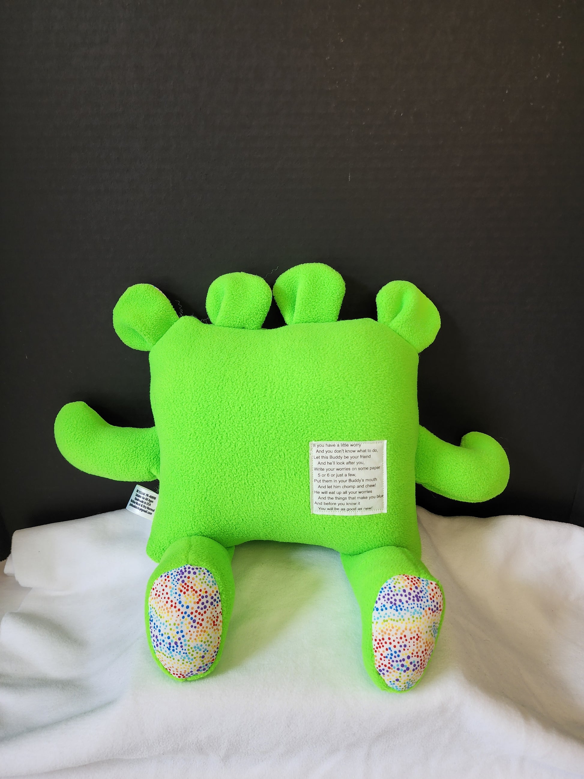 This custom, one-of-a-kind Chomper Buddy is neon green fleece with rainbow dots lining and ready to chomp any anxieties or worries away! Once you write or draw your worries on paper, you can feed your worries to the Chomper. Lose a tooth, put it in the Chompers mouth for the Tooth Fairy or even a Christmas list for Santa to take out of the zipper mouth. Perfect for all ages, it offers a plush and cozy feel with superior durability for tons of hugs and cuddles.