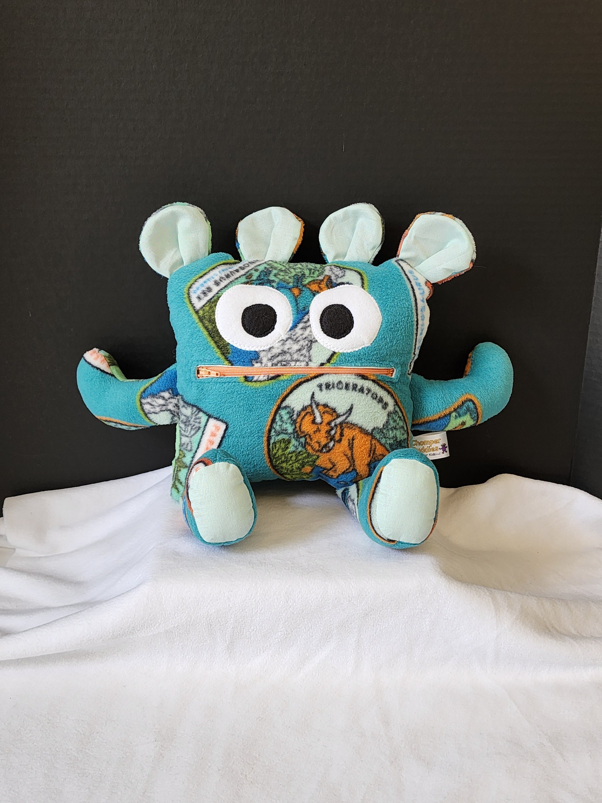 This custom, one-of-a-kind Chomper Buddy is teal with dinosaurs fleece with mint lining and ready to chomp any anxieties or worries away! Once you write or draw your worries on paper, you can feed your worries to the Chomper. Lose a tooth, put it in the Chompers mouth for the Tooth Fairy or even a Christmas list for Santa to take out of the zipper mouth. Perfect for all ages, it offers a plush and cozy feel with superior durability for tons of hugs and cuddles.