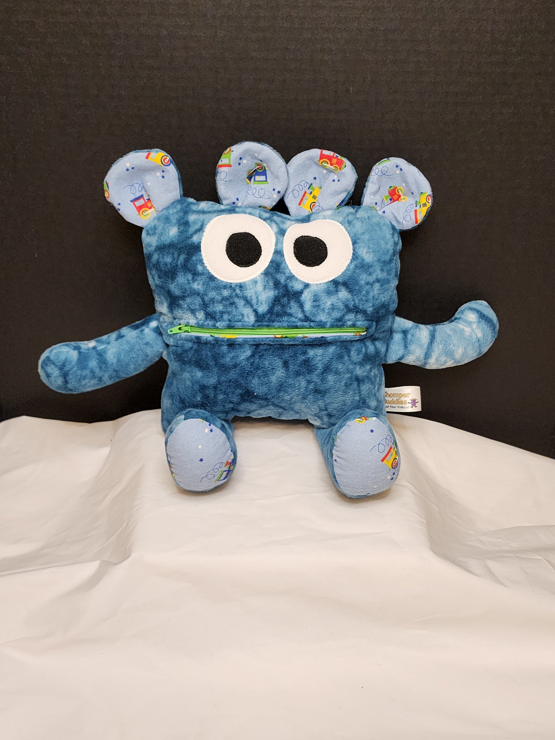 This custom, one-of-a-kind Chomper Buddy is blue swirl fleece with choo choo train lining is ready to chomp any anxieties or worries away! Once you write or draw your worries on paper, you can feed your worries to the Chomper. Lose a tooth, put it in the Chompers mouth for the Tooth Fairy or even a Christmas list for Santa to take out of the zipper mouth. Perfect for all ages, it offers a plush and cozy feel with superior durability for tons of hugs and cuddles.