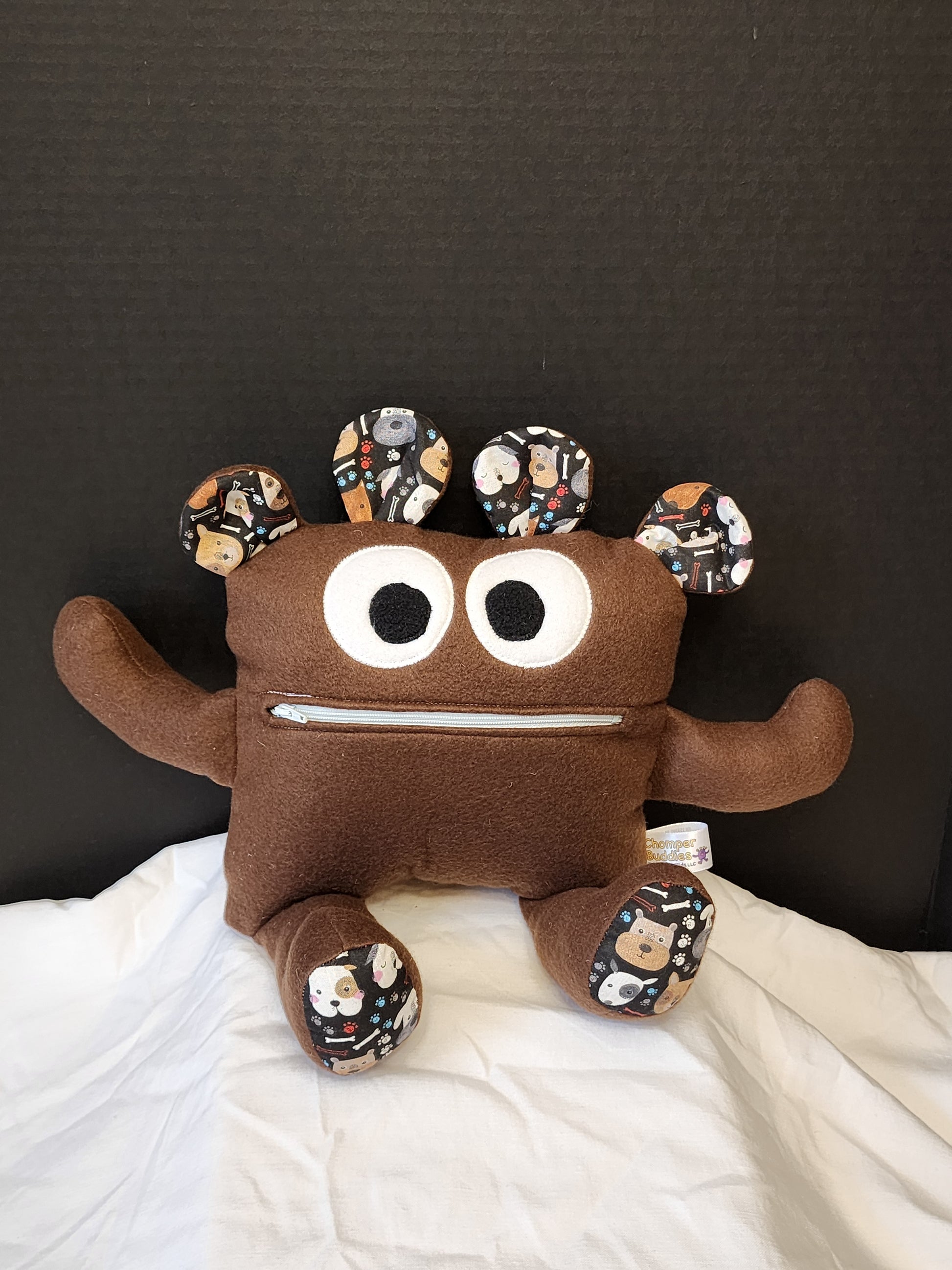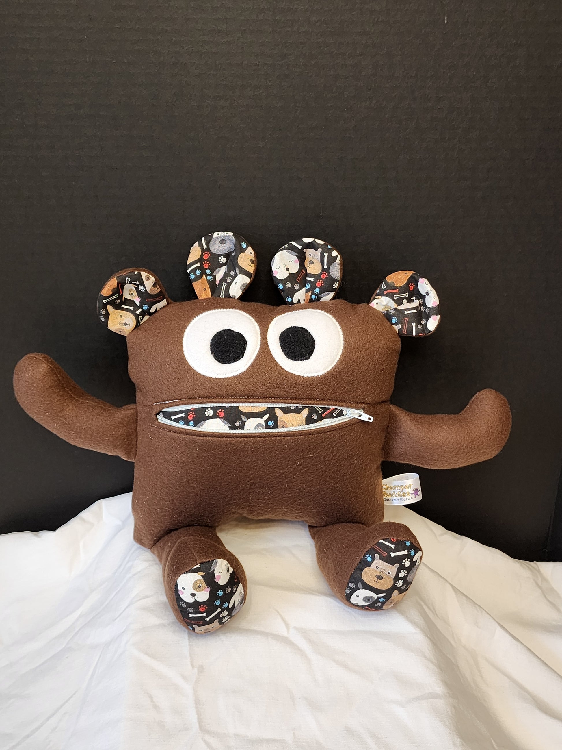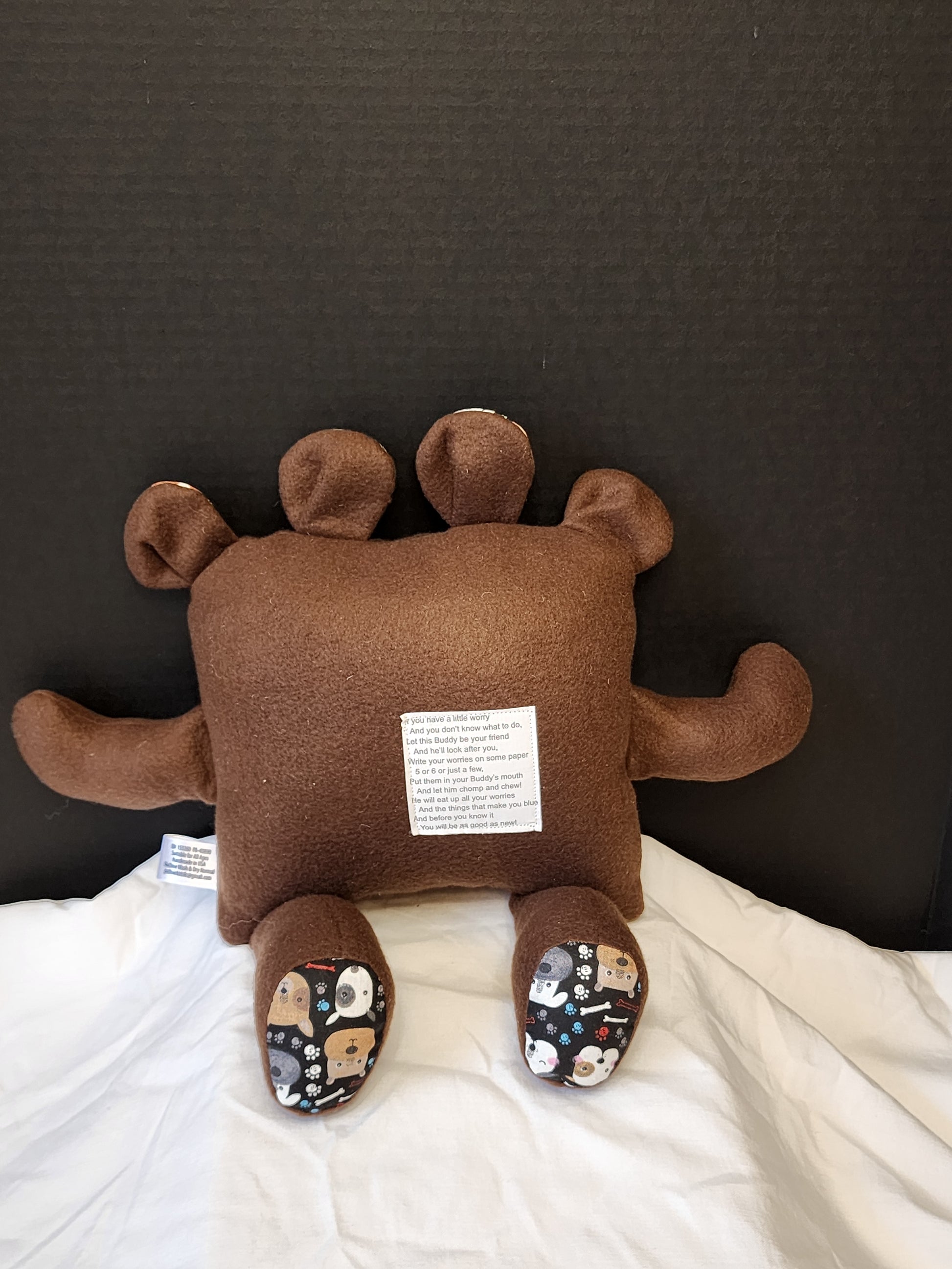 This custom, one-of-a-kind Chomper Buddy is brown fleece with dogs lining is ready to chomp any anxieties or worries away! Once you write or draw your worries on paper, you can feed your worries to the Chomper. Lose a tooth, put it in the Chompers mouth for the Tooth Fairy or even a Christmas list for Santa to take out of the zipper mouth. Perfect for all ages, it offers a plush and cozy feel with superior durability for tons of hugs and cuddles.