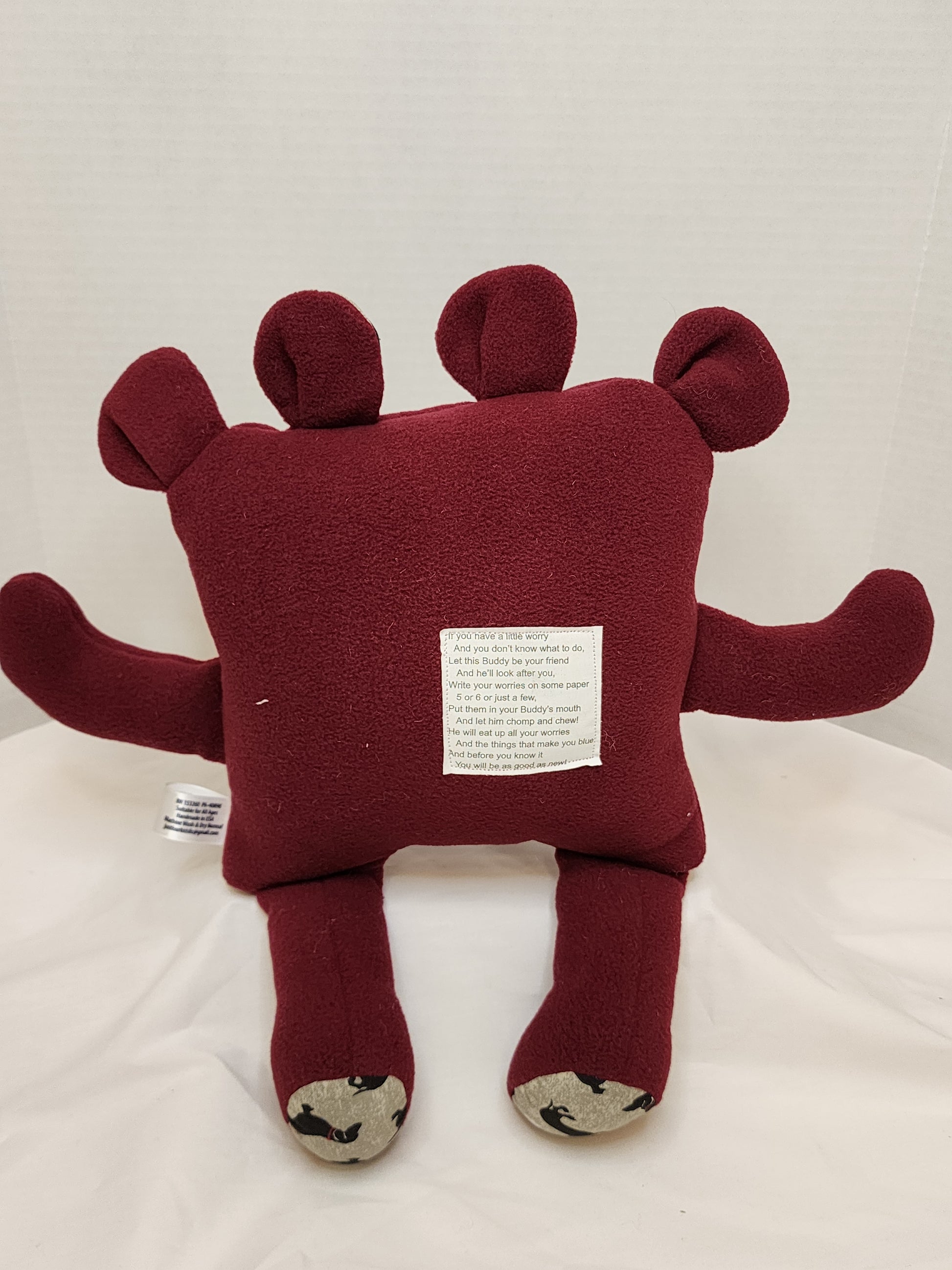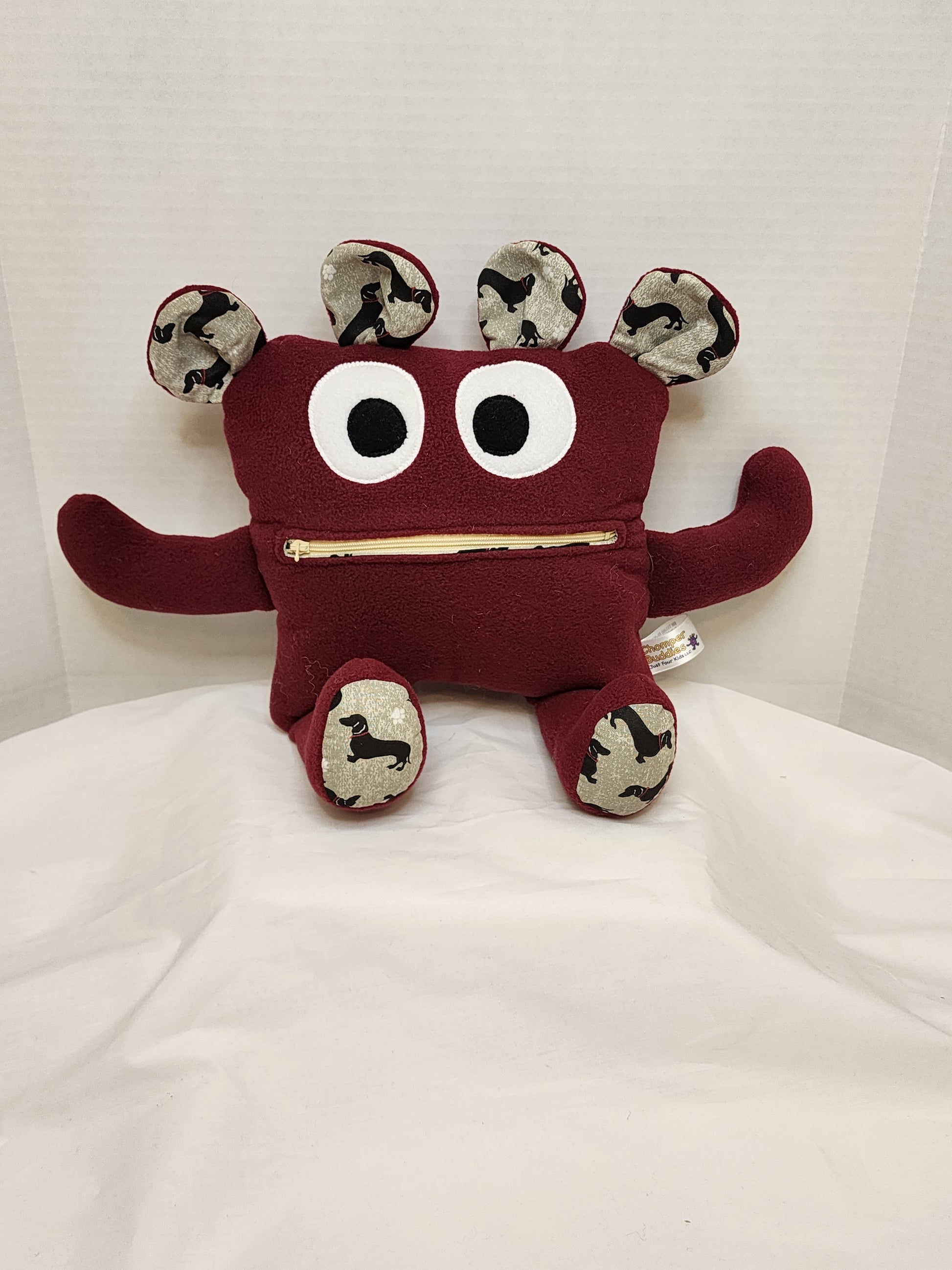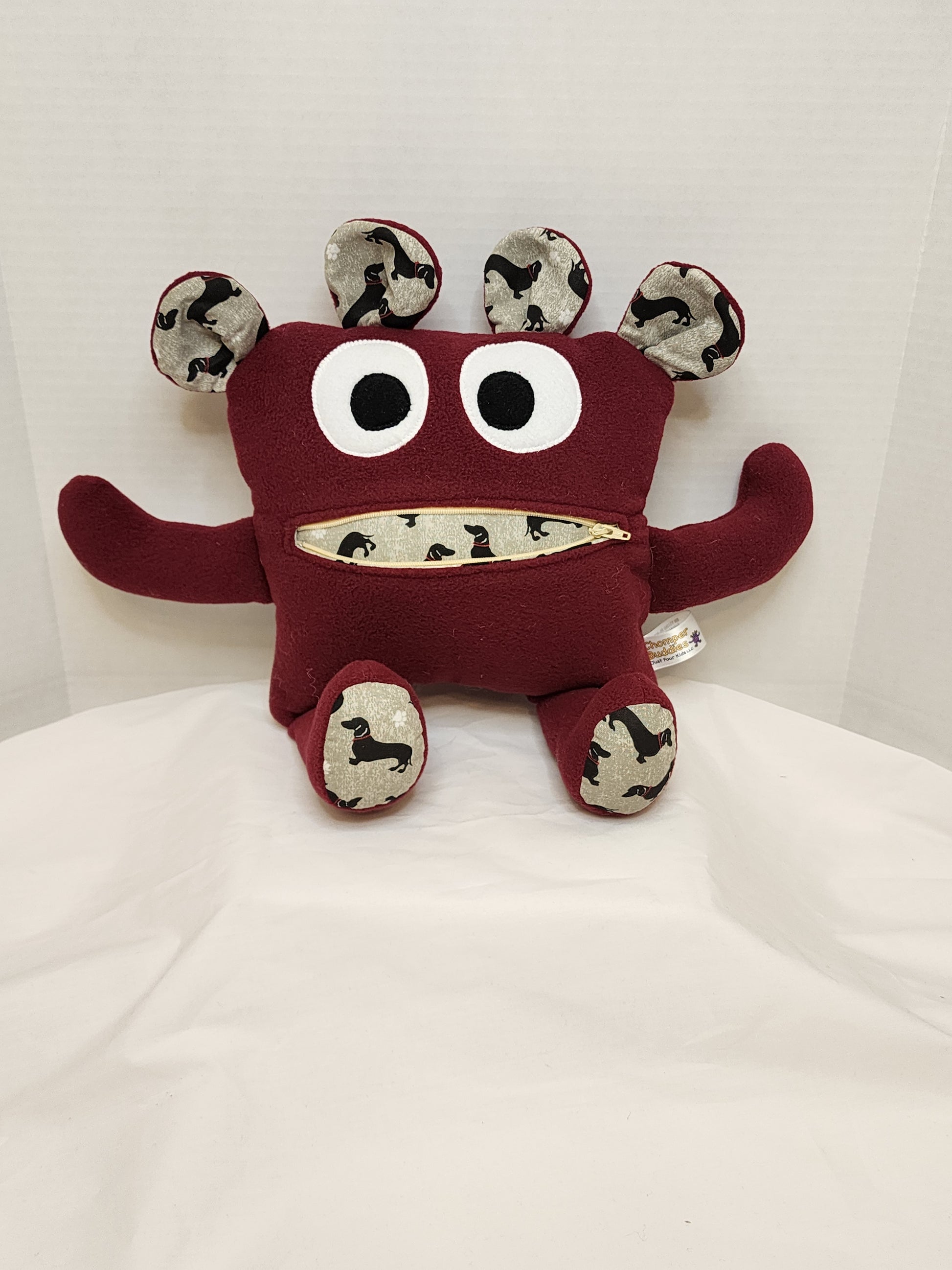This custom, one-of-a-kind Chomper Buddy is burgundy fleece with dachshund lining is ready to chomp any anxieties or worries away! Once you write or draw your worries on paper, you can feed your worries to the Chomper. Lose a tooth, put it in the Chompers mouth for the Tooth Fairy or even a Christmas list for Santa to take out of the zipper mouth. Perfect for all ages, it offers a plush and cozy feel with superior durability for tons of hugs and cuddles.