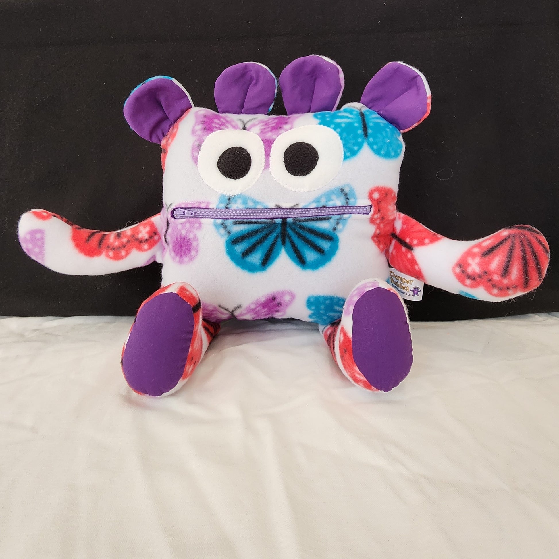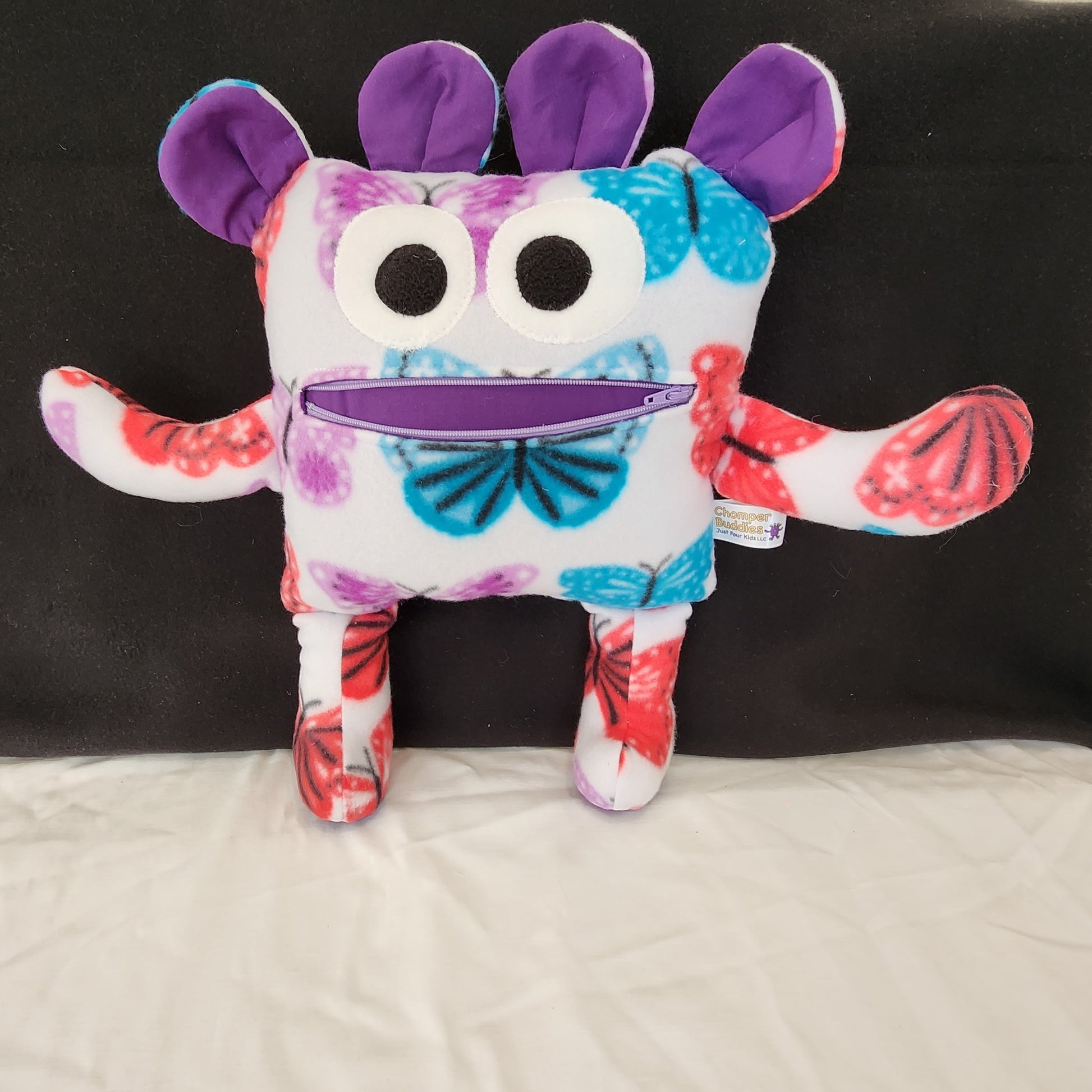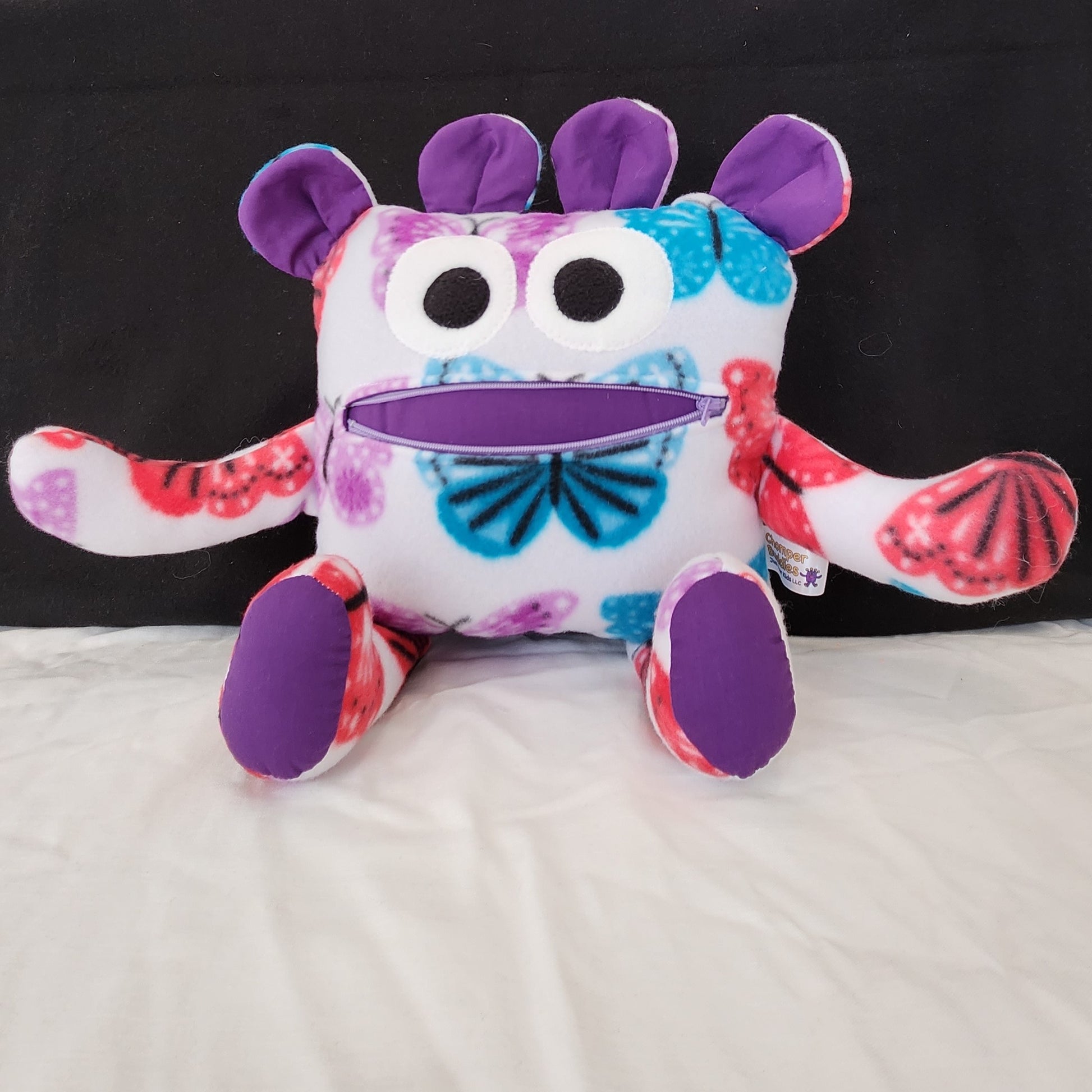 This custom, one-of-a-kind Chomper Buddy is white with multi-colored butterflies fleece with purple lining and ready to chomp any anxieties or worries away! Once you write or draw your worries on paper, you can feed your worries to the Chomper. Lose a tooth, put it in the Chompers mouth for the Tooth Fairy or even a Christmas list for Santa to take out of the zipper mouth. Perfect for all ages, it offers a plush and cozy feel with superior durability for tons of hugs and cuddles.