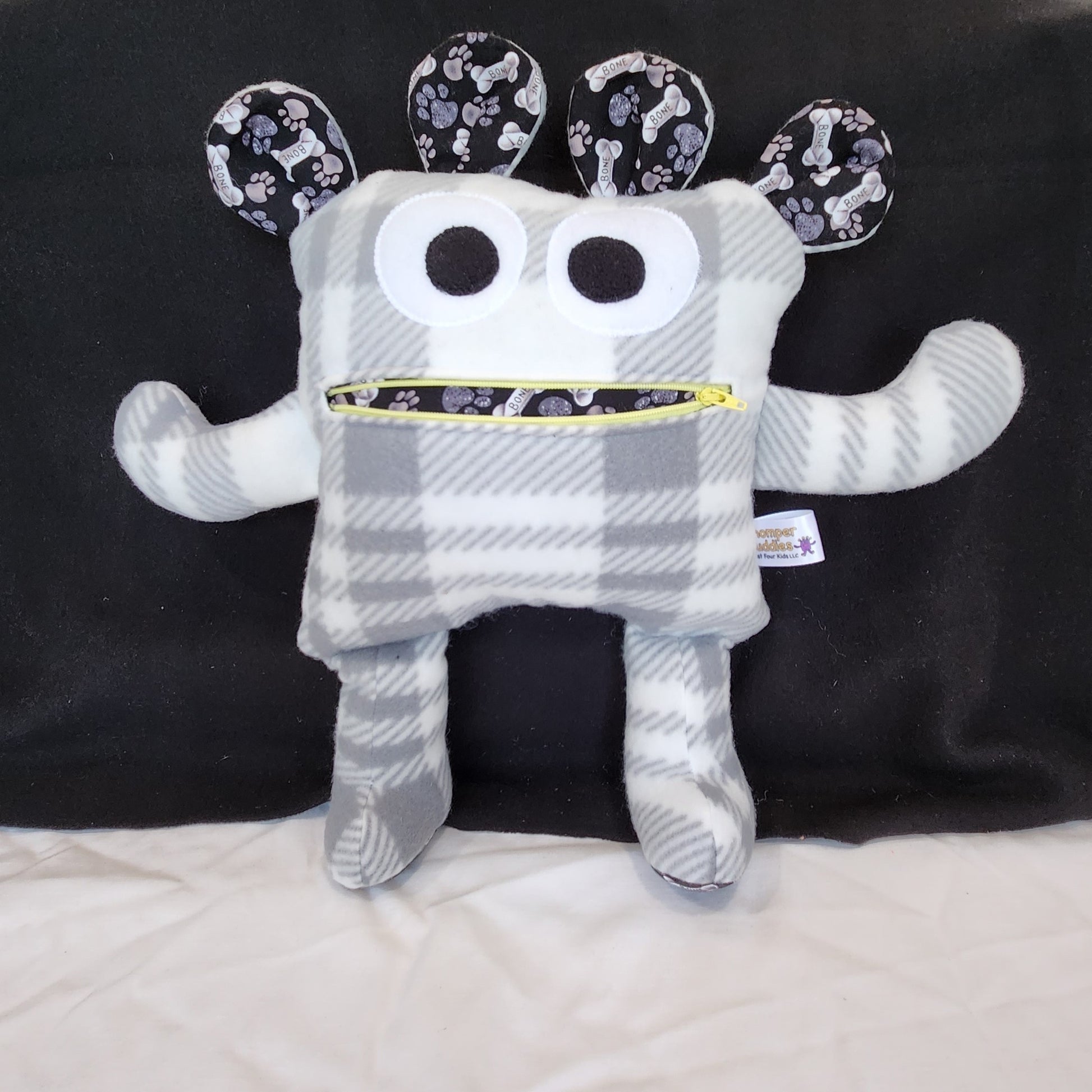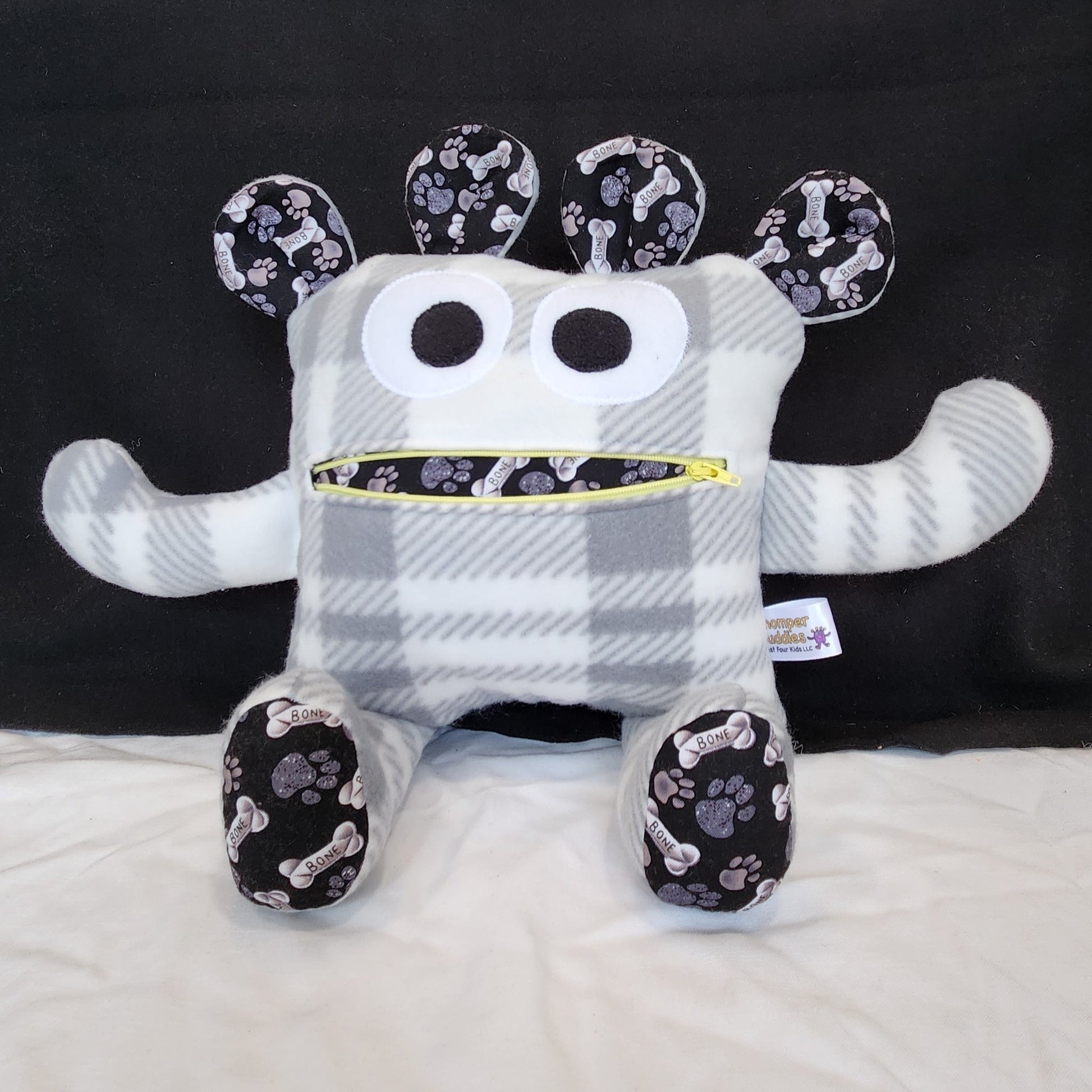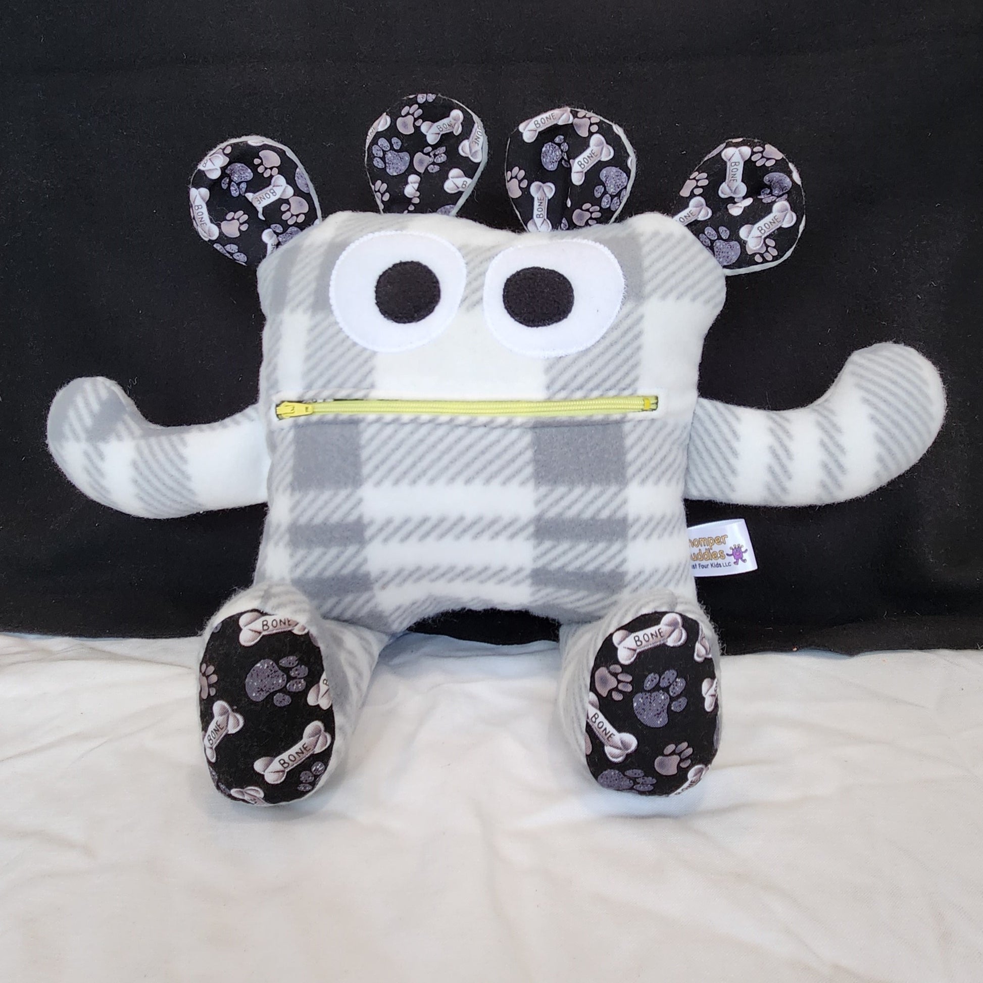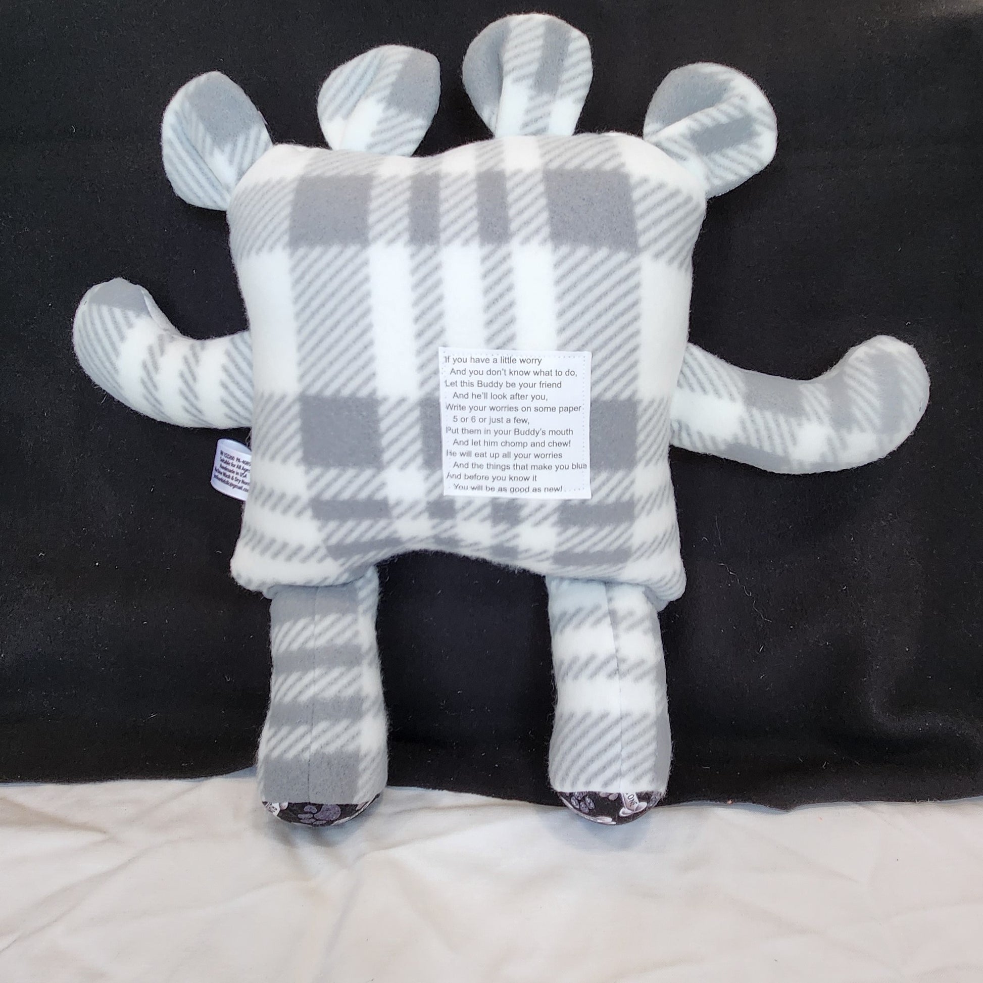 This custom, one-of-a-kind Chomper Buddy is gray plaid fleece with black and gray dog bones lining and is ready to chomp any anxieties or worries away! Once you write or draw your worries on paper, you can feed your worries to the Chomper. Lose a tooth, put it in the Chompers mouth for the Tooth Fairy or even a Christmas list for Santa to take out of the zipper mouth. Perfect for all ages, it offers a plush and cozy feel with superior durability for tons of hugs and cuddles.