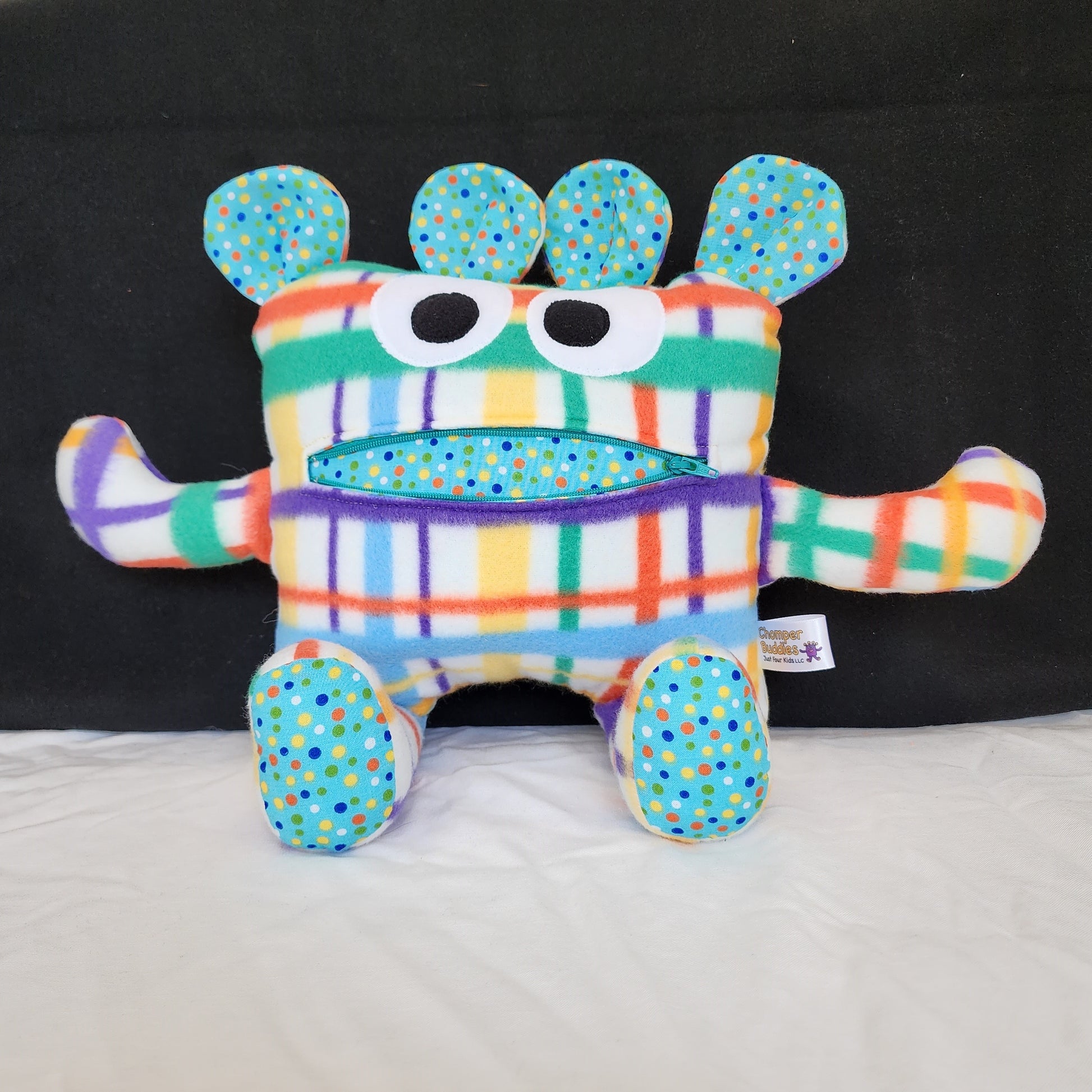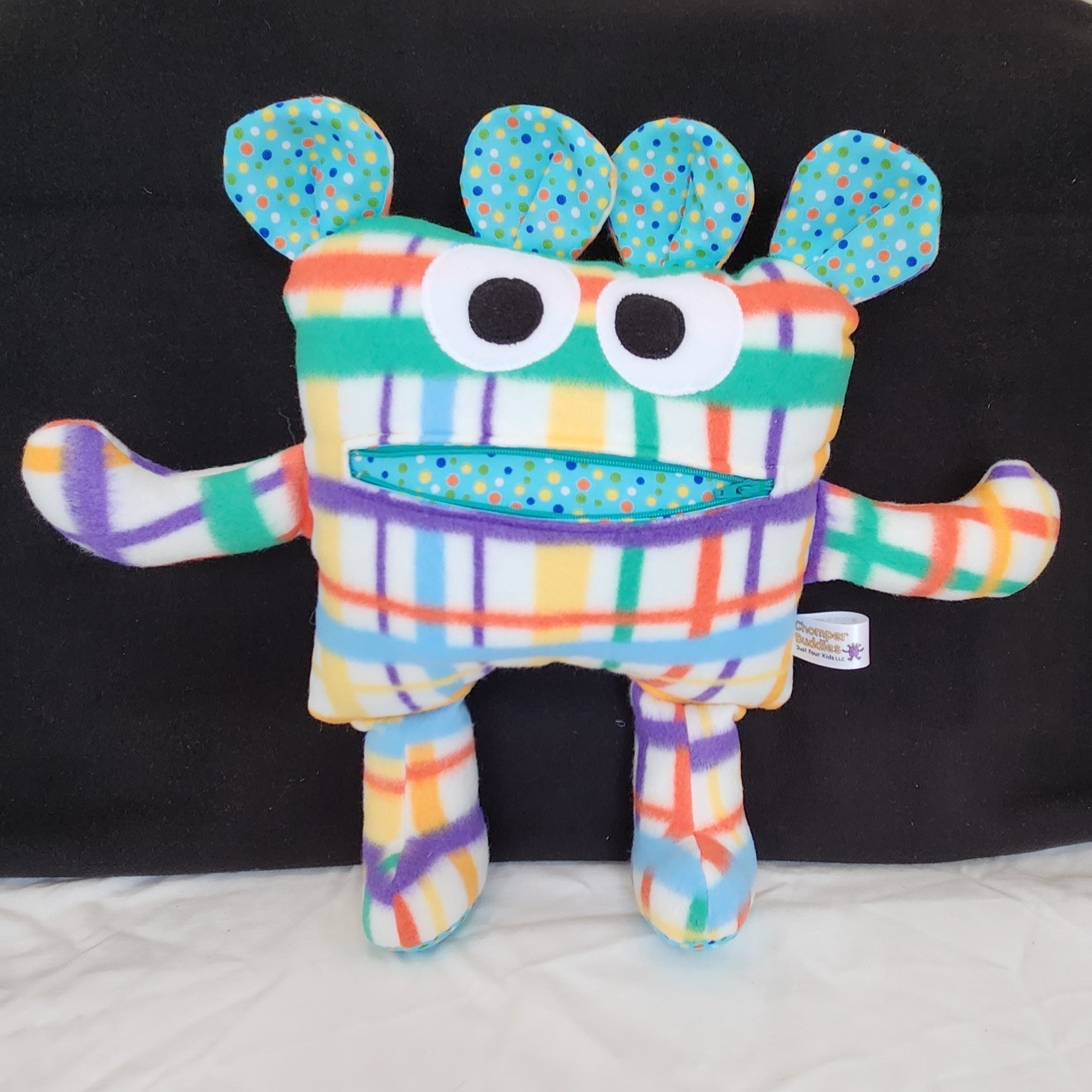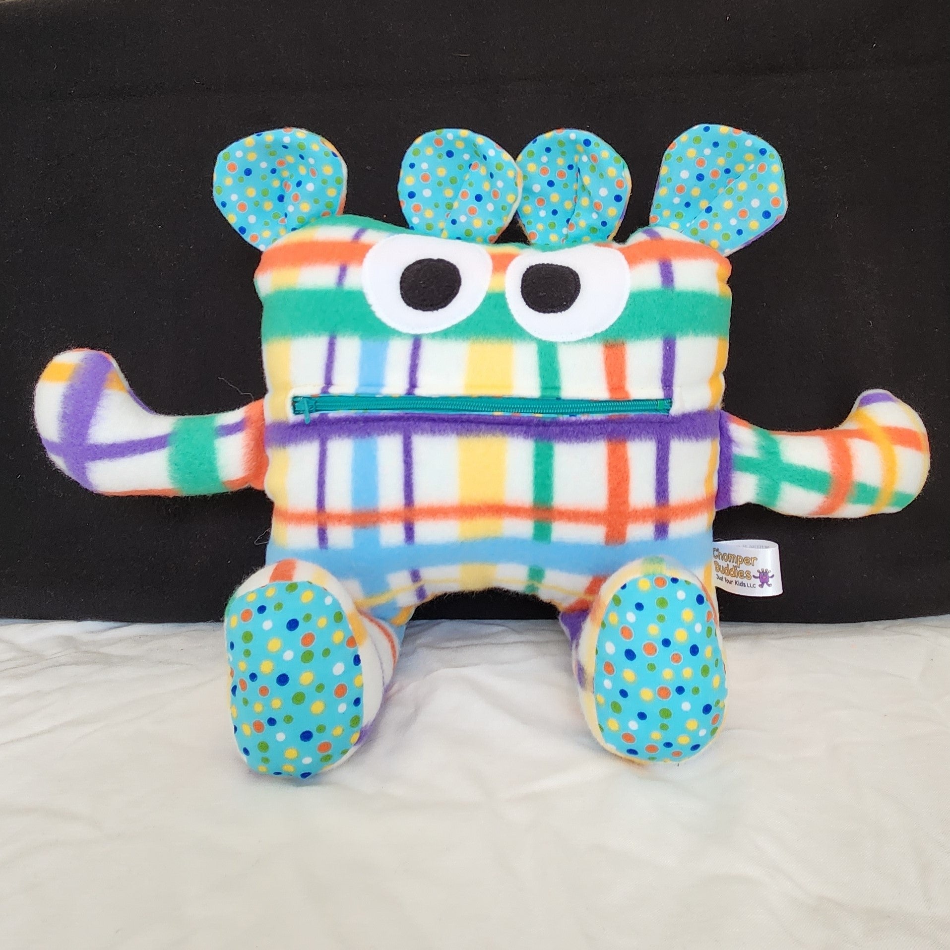 This custom, one-of-a-kind Chomper Buddy is White plaid multi-color fleece with baby blue and multi-color dots lining is ready to chomp any anxieties or worries away! Once you write or draw your worries on paper, you can feed your worries to the Chomper. Lose a tooth, put it in the Chompers mouth for the Tooth Fairy or even a Christmas list for Santa to take out of the zipper mouth. Perfect for all ages, it offers a plush and cozy feel with superior durability for tons of hugs and cuddles.