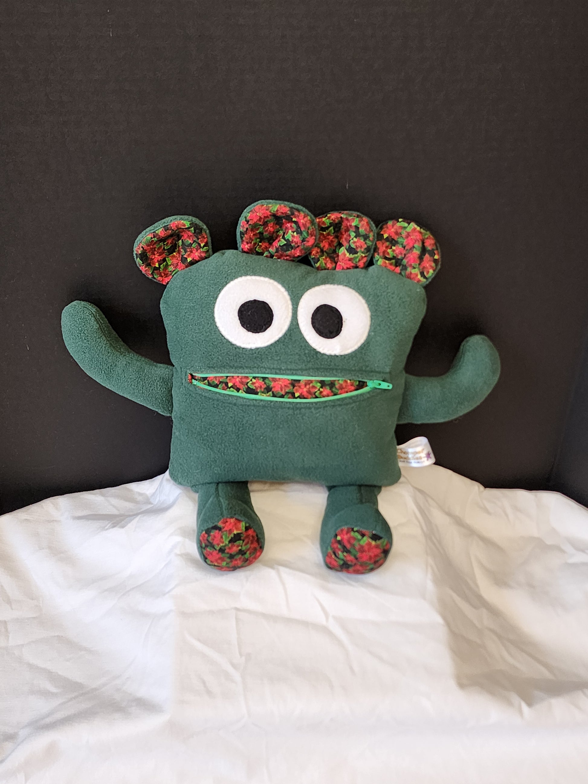 This custom, one-of-a-kind Chomper Buddy is green fleece with poinsettia lining is ready to chomp any anxieties or worries away! Once you write or draw your worries on paper, you can feed your worries to the Chomper. Lose a tooth, put it in the Chompers mouth for the Tooth Fairy or even a Christmas list for Santa to take out of the zipper mouth. Perfect for all ages, it offers a plush and cozy feel with superior durability for tons of hugs and cuddles.