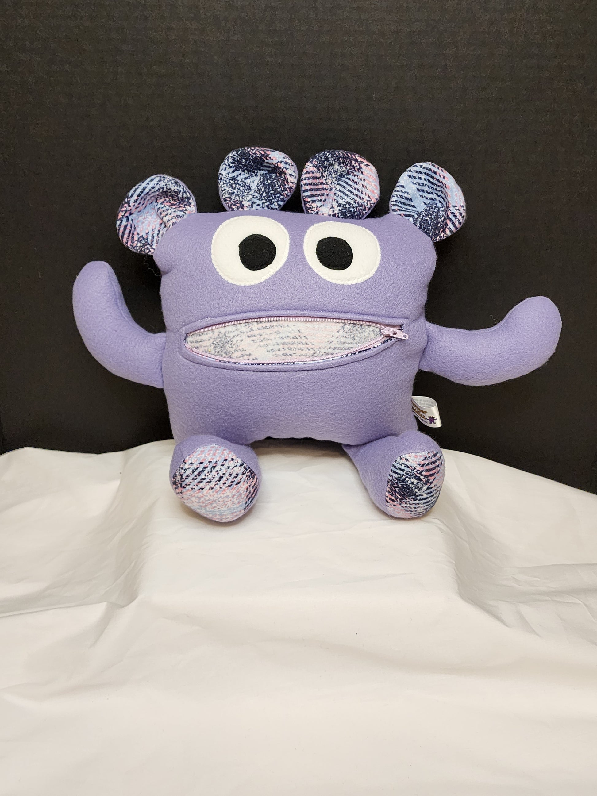This custom, one-of-a-kind Chomper Buddy is lavender fleece with mixed lining is ready to chomp any anxieties or worries away! Once you write or draw your worries on paper, you can feed your worries to the Chomper. Lose a tooth, put it in the Chompers mouth for the Tooth Fairy or even a Christmas list for Santa to take out of the zipper mouth. Perfect for all ages, it offers a plush and cozy feel with superior durability for tons of hugs and cuddles.
