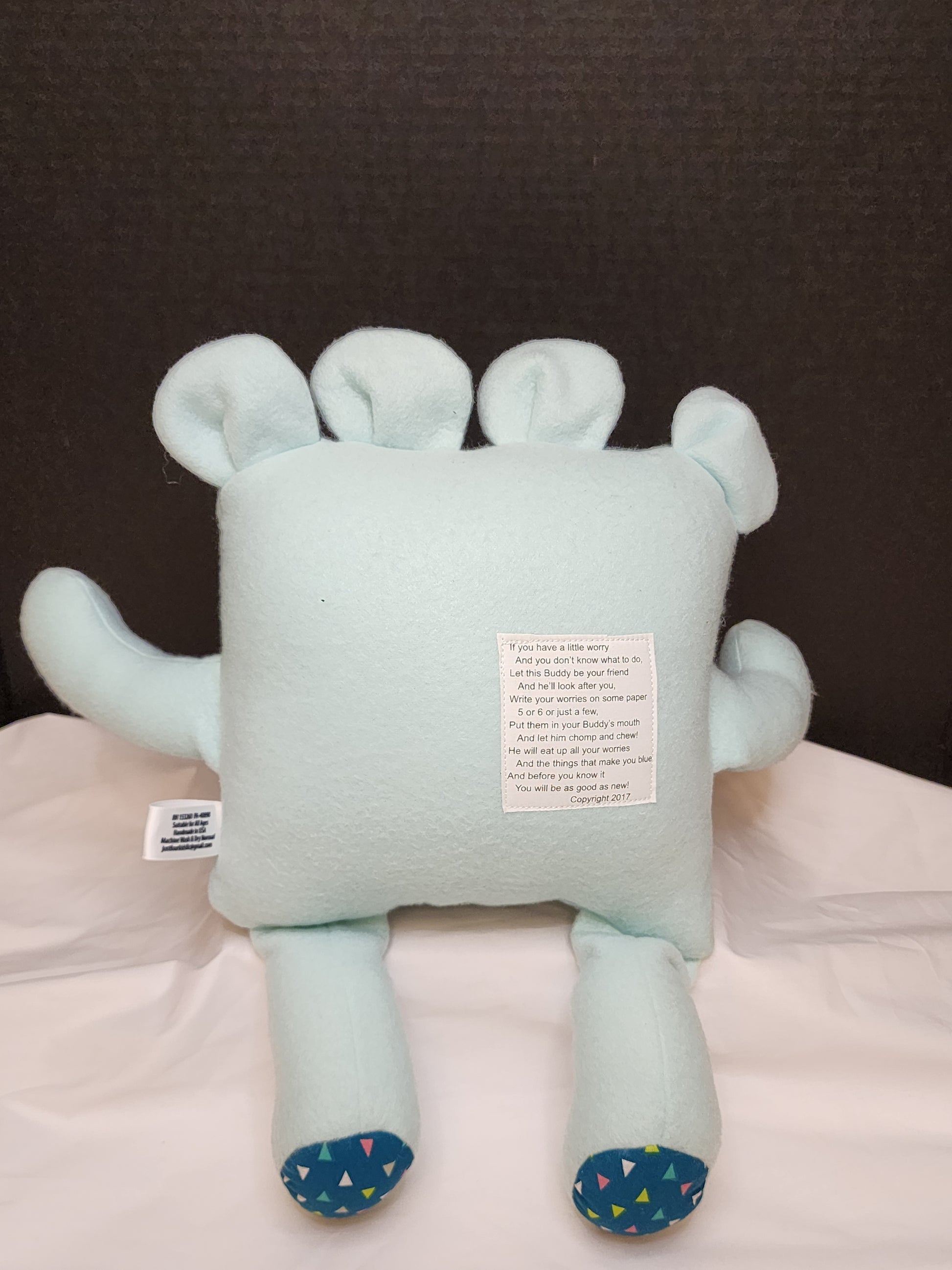 This custom, one-of-a-kind Chomper Buddy is light teal fleece with dark teal and multicolor triangle lining is ready to chomp any anxieties or worries away! Once you write or draw your worries on paper, you can feed your worries to the Chomper. Lose a tooth, put it in the Chompers mouth for the Tooth Fairy or even a Christmas list for Santa to take out of the zipper mouth. Perfect for all ages, it offers a plush and cozy feel with superior durability for tons of hugs and cuddles.