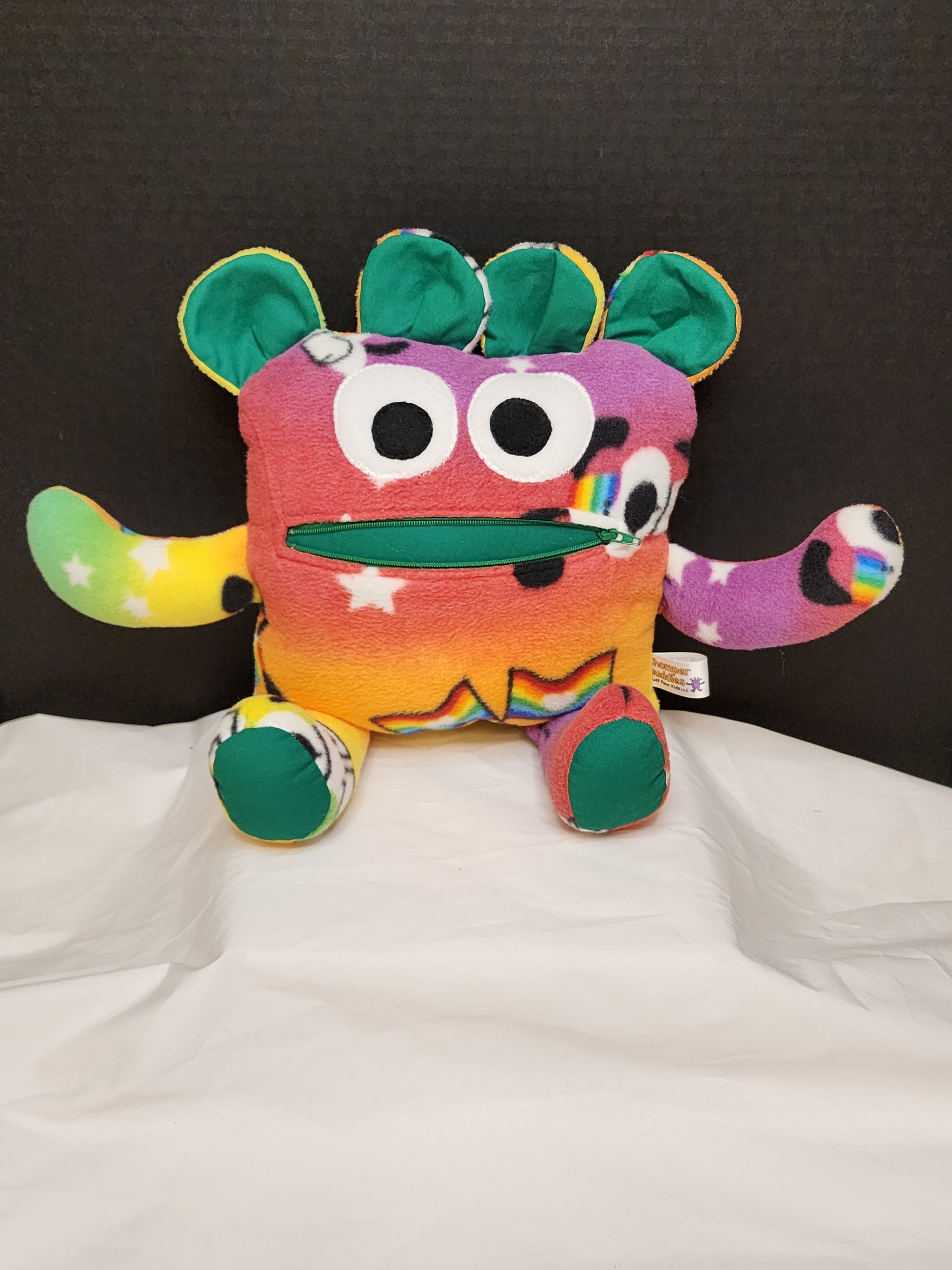This custom, one-of-a-kind Chomper Buddy is puppy dog with rainbow flag fleece with green lining is ready to chomp any anxieties or worries away! Once you write or draw your worries on paper, you can feed your worries to the Chomper. Lose a tooth, put it in the Chompers mouth for the Tooth Fairy or even a Christmas list for Santa to take out of the zipper mouth. Perfect for all ages, it offers a plush and cozy feel with superior durability for tons of hugs and cuddles.