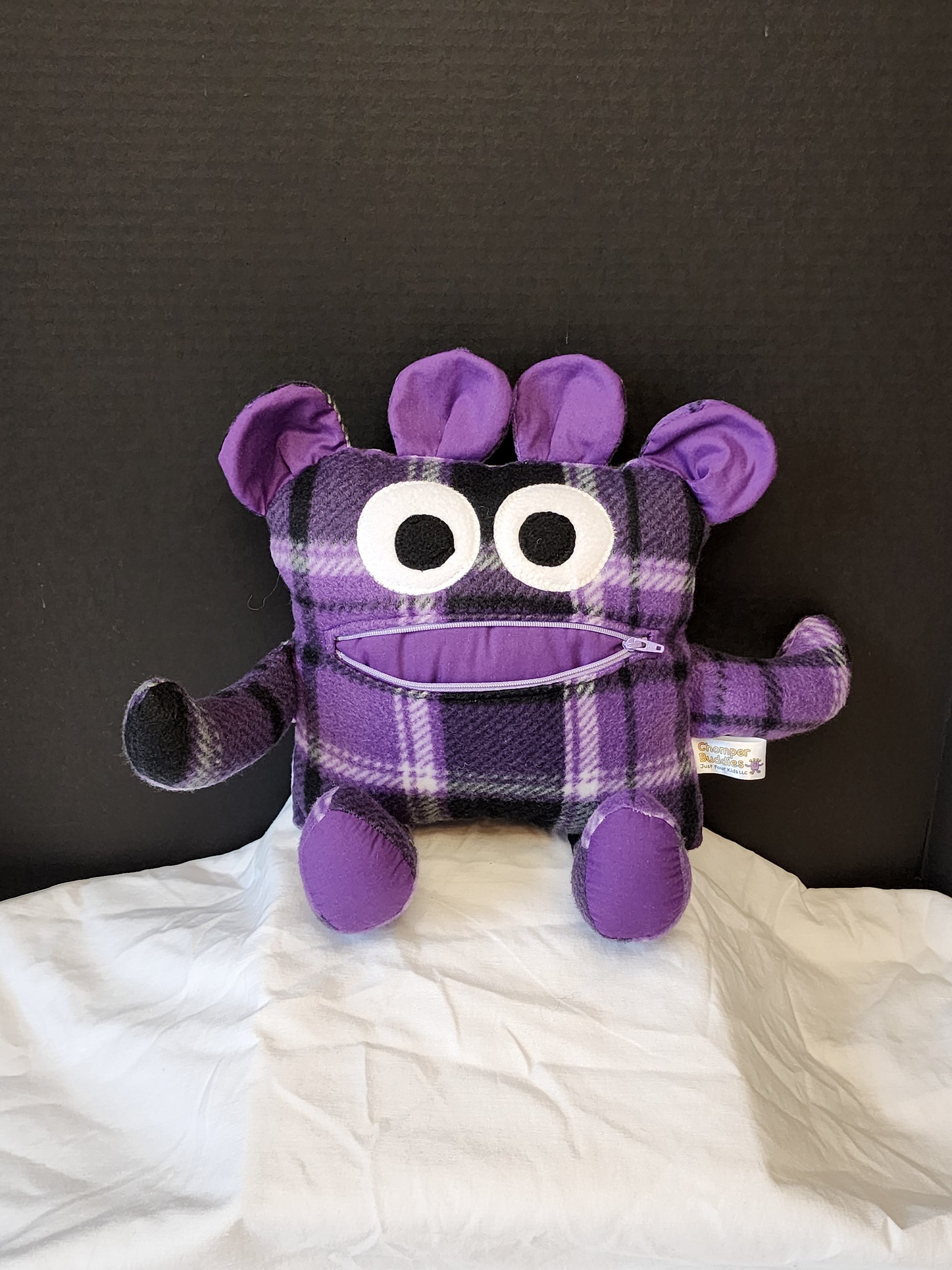 This custom, one-of-a-kind Chomper Buddy is purple plaid fleece with purple lining is ready to chomp any anxieties or worries away! Once you write or draw your worries on paper, you can feed your worries to the Chomper. Lose a tooth, put it in the Chompers mouth for the Tooth Fairy or even a Christmas list for Santa to take out of the zipper mouth. Perfect for all ages, it offers a plush and cozy feel with superior durability for tons of hugs and cuddles.