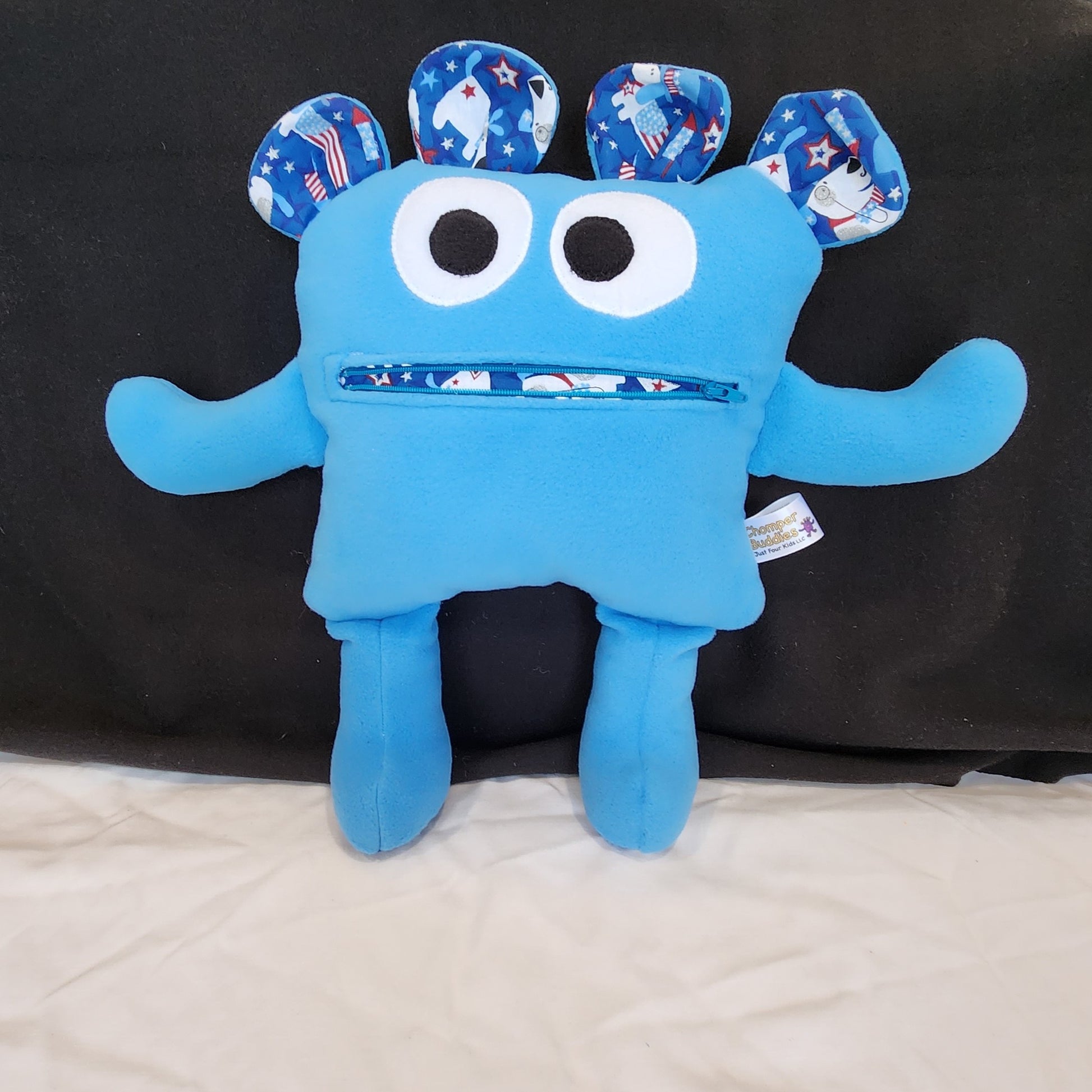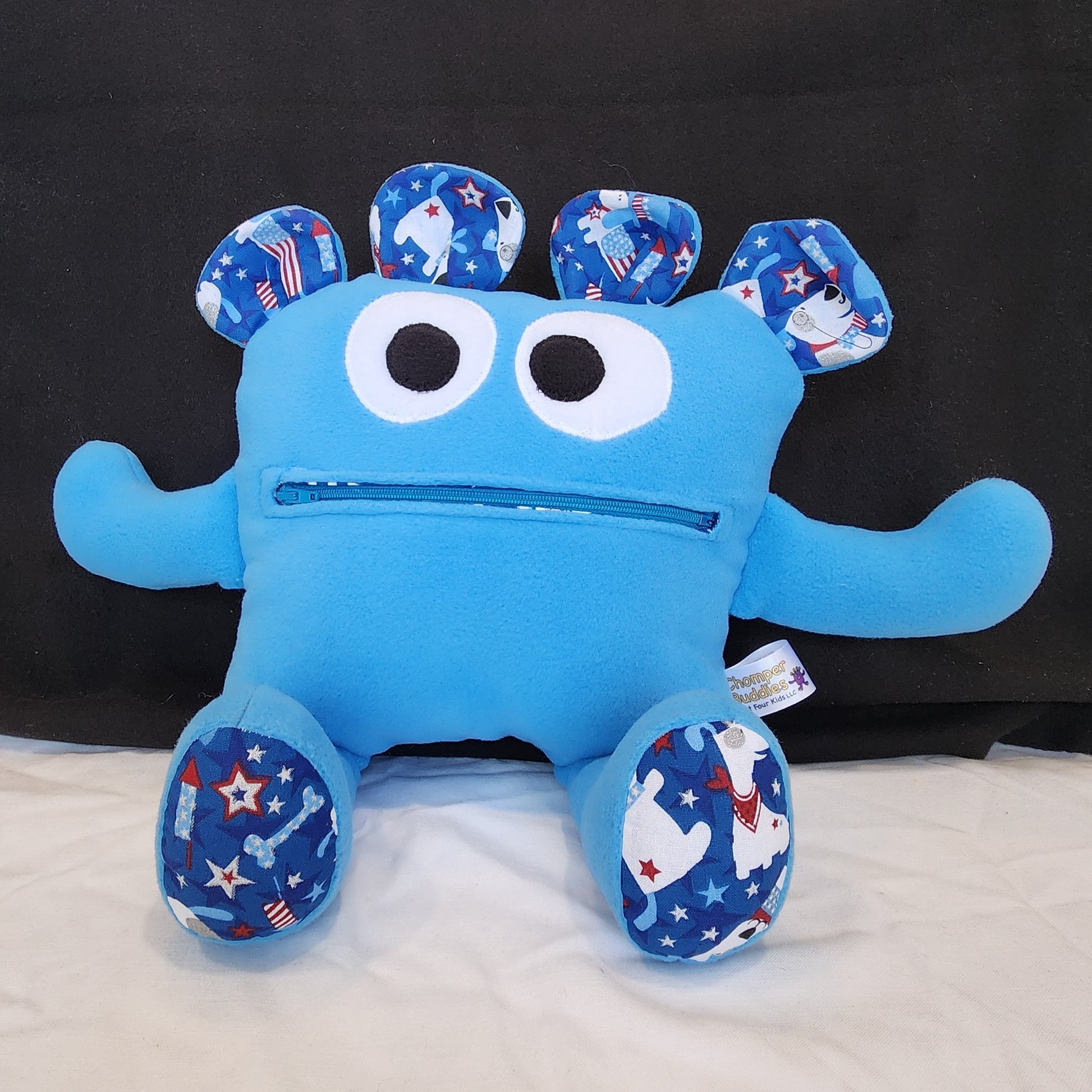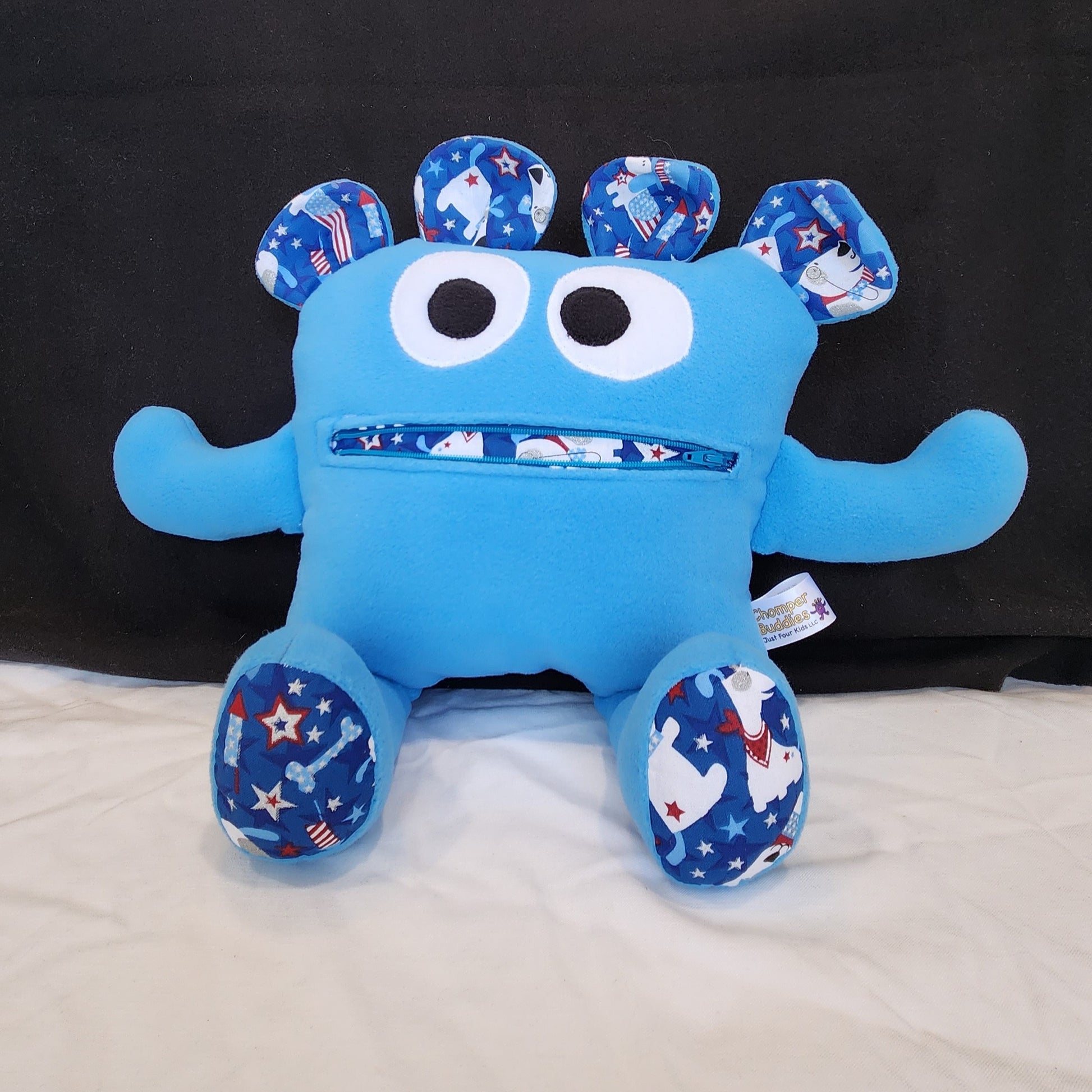This custom, one-of-a-kind festive Chomper Buddy has blue fleece with red, white and blue lining and is ready to chomp any anxieties or worries away! Once you write or draw your worries on paper, you can feed your worries to the Chomper. Lose a tooth, put it in the Chompers mouth for the Tooth Fairy or even a Christmas list for Santa to take out of the zipper mouth. Perfect for all ages, it offers a plush and cozy feel with superior durability for tons of hugs and cuddles.