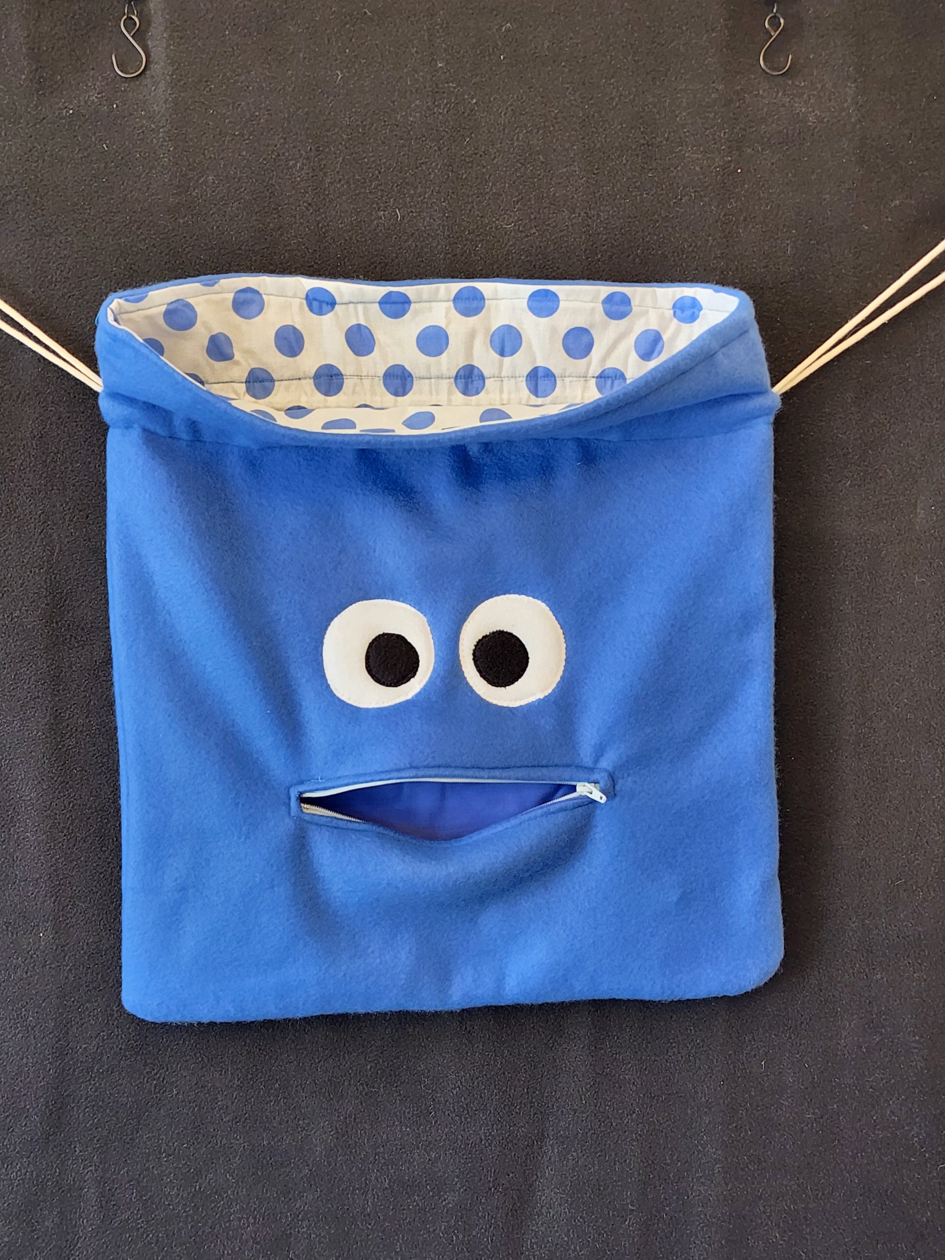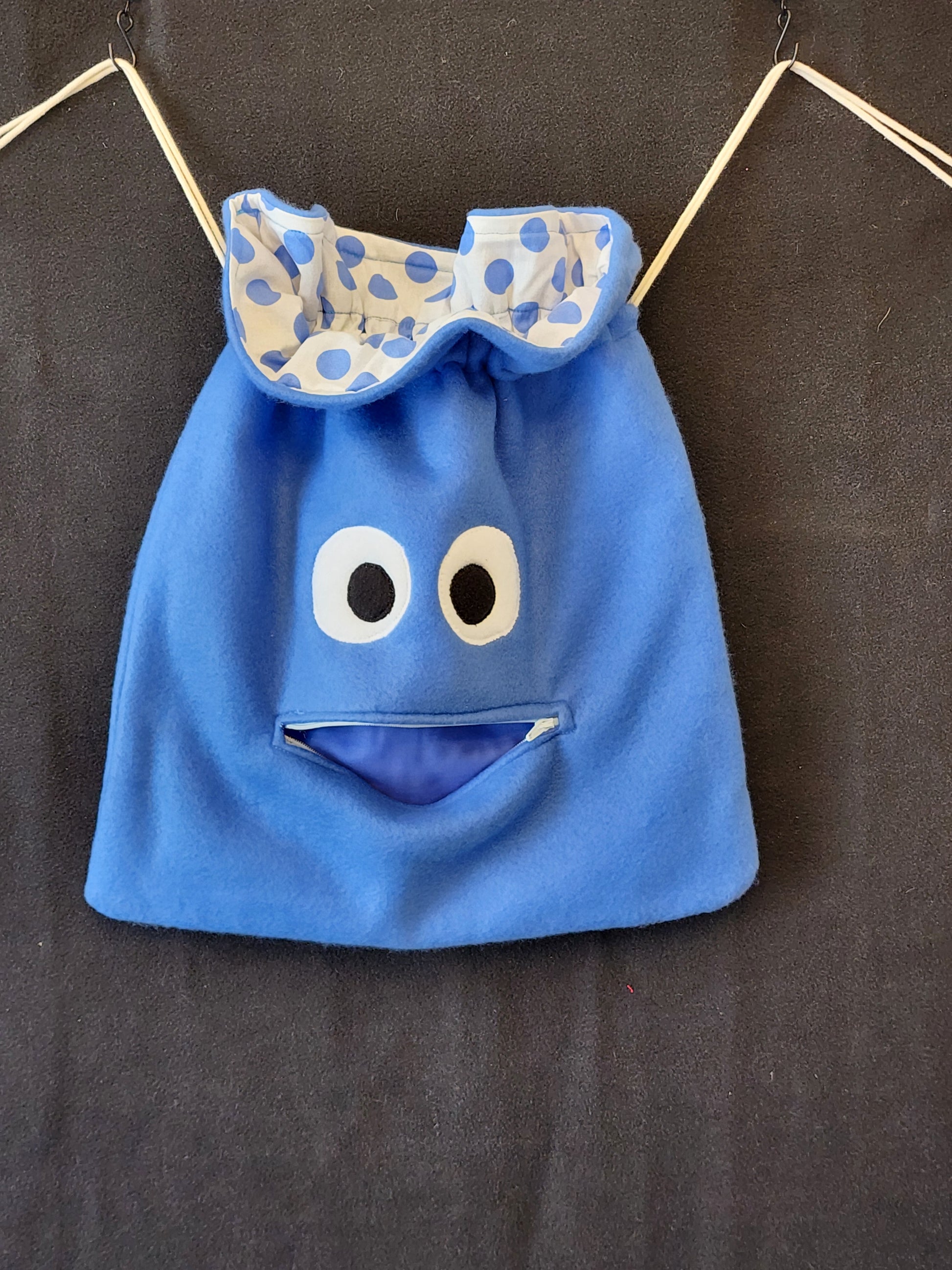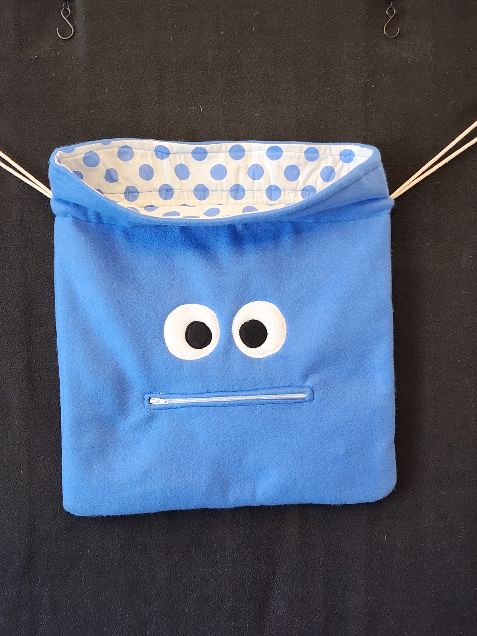 Chomper Buddy Drawstring bag, Slumber Bag, Dementia Alzheimer's, Blue fleece with Blue Dots lining