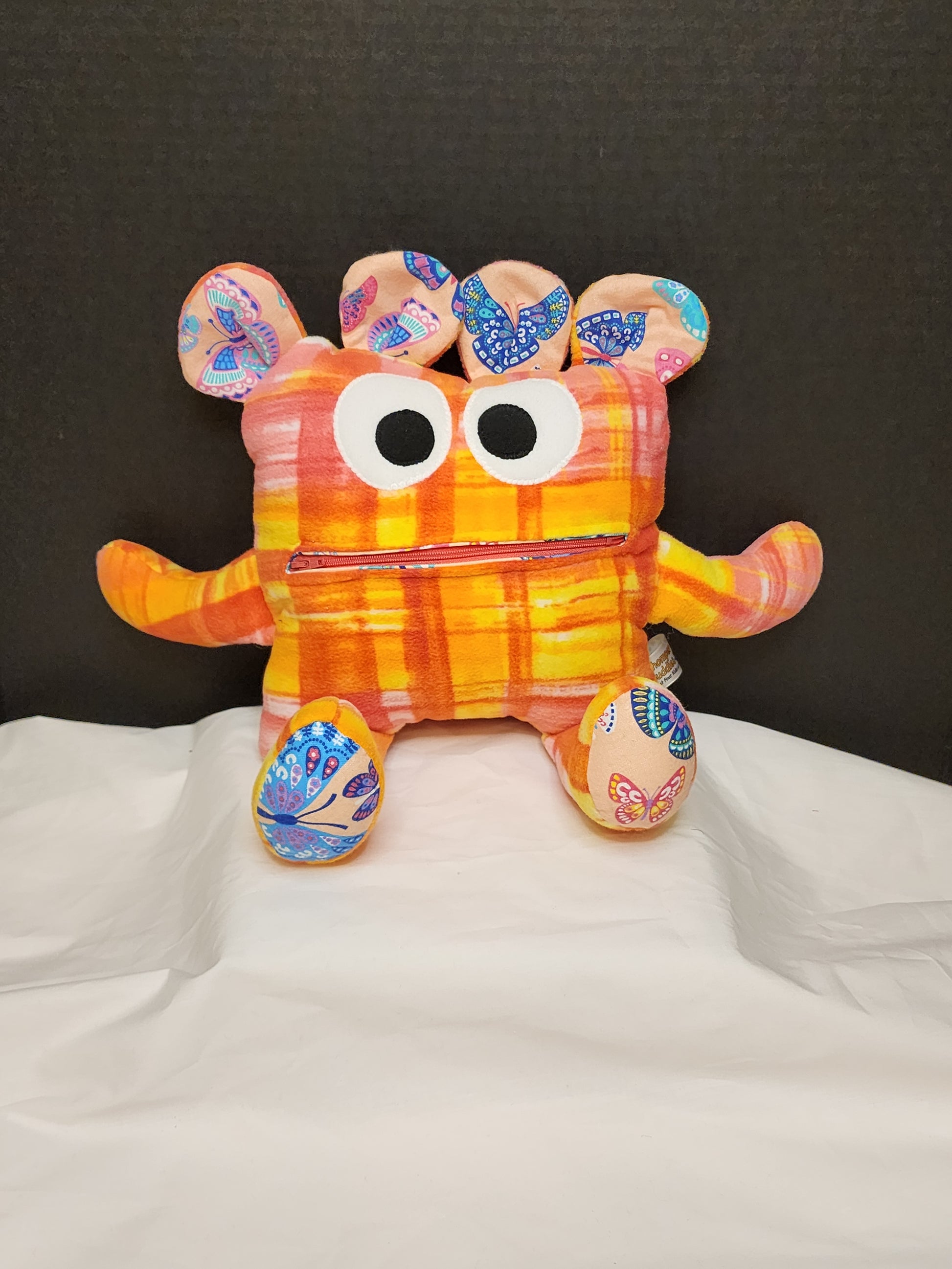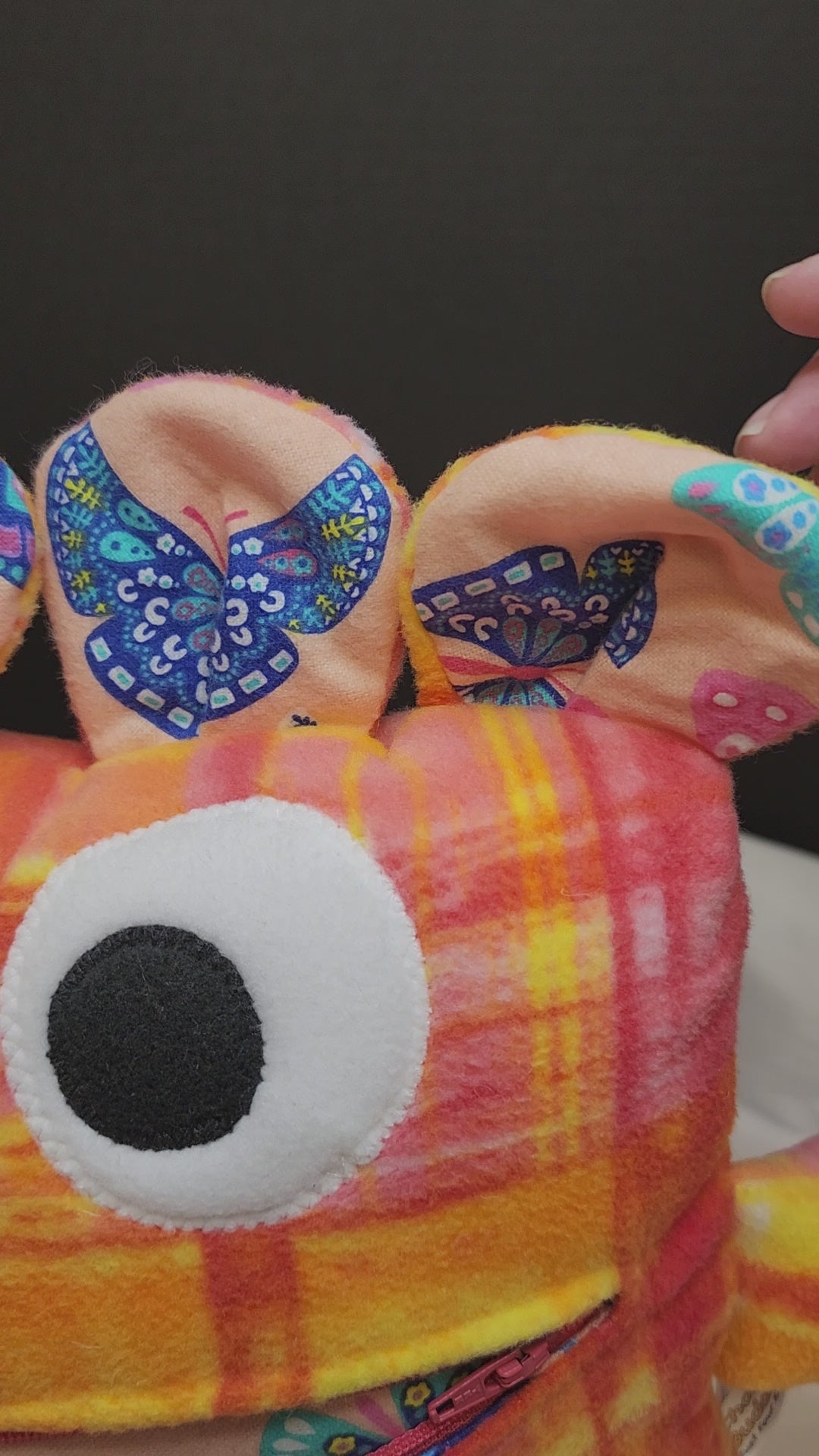 This custom, one-of-a-kind Chomper Buddy is sunset fleece with butterfly lining is ready to chomp any anxieties or worries away! This Chomper Buddy has crinkle material in the 2 outter ears. Once you write or draw your worries on paper, you can feed your worries to the Chomper. Lose a tooth, put it in the Chompers mouth for the Tooth Fairy or even a Christmas list for Santa to take out of the zipper mouth. Perfect for all ages, it offers a plush and cozy feel with superior durability for tons of hugs and cuddles.
