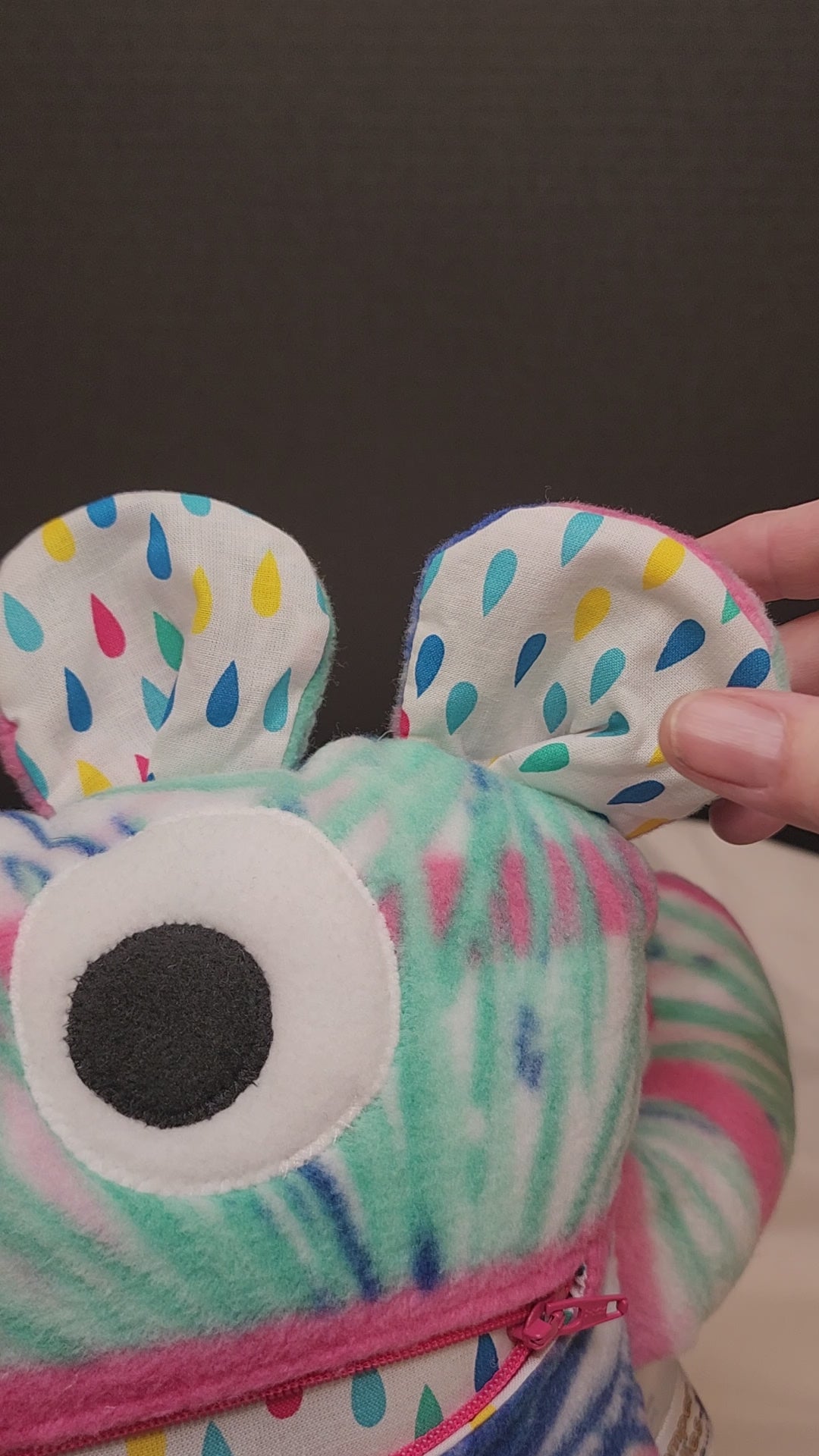 This custom, one-of-a-kind Chomper Buddy is tropical fleece with multicolor raindrop lining is ready to chomp any anxieties or worries away! This Buddy's outer 2 ears have the crinkle material to make some noise. Once you write or draw your worries on paper, you can feed your worries to the Chomper. Lose a tooth, put it in the Chompers mouth for the Tooth Fairy or even a Christmas list for Santa to take out of the zipper mouth. Perfect for all ages, it offers a plush and cozy feel with superior durability for tons of hugs and cuddles.