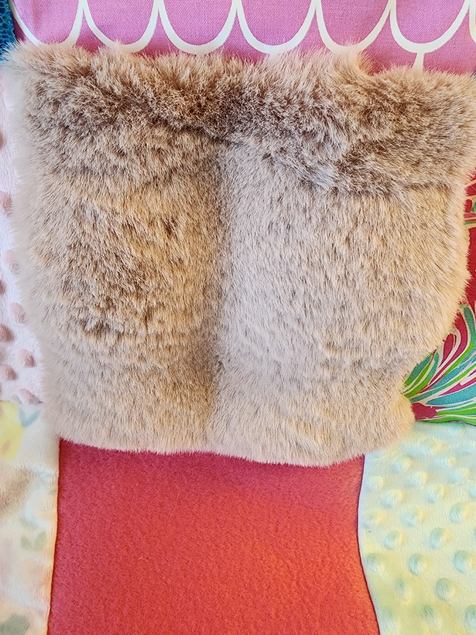 Hi everyone! This sensory blanket is perfect for all ages! It is approximately 21"x27" a perfect size for a lap. This blanket has blush thick faux fur, cotton candy color Faux fur, dimple dot minky, smooth lily P style smooth minkyl fabric, fully functional zipper pouch, fleece, cotton, shiny blue fabric. The back is a pink fleece.