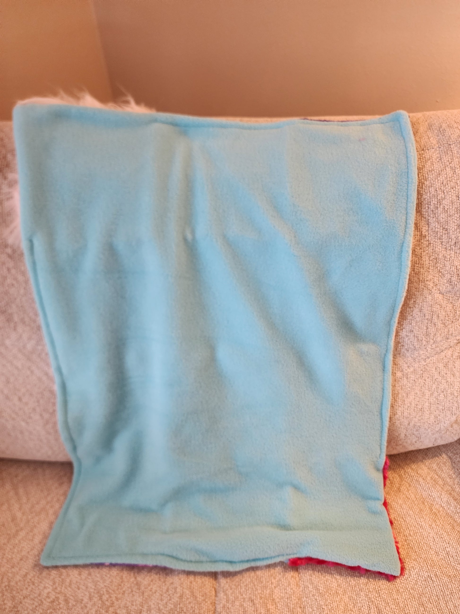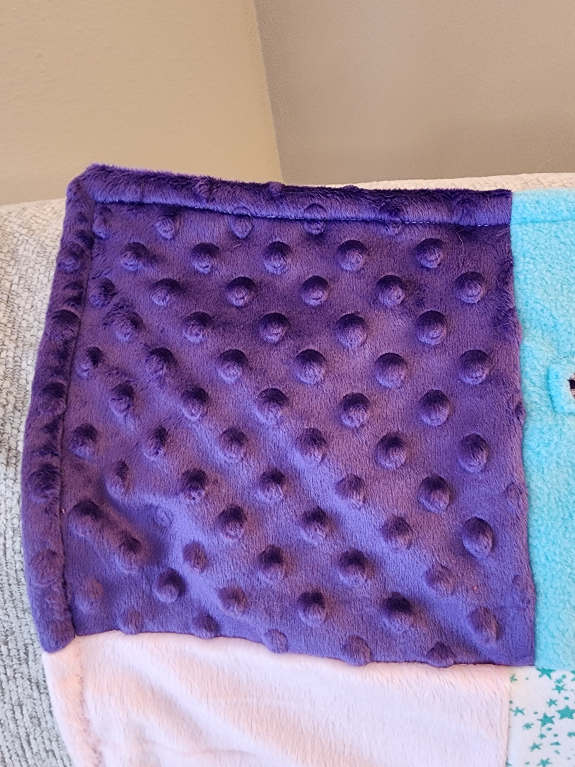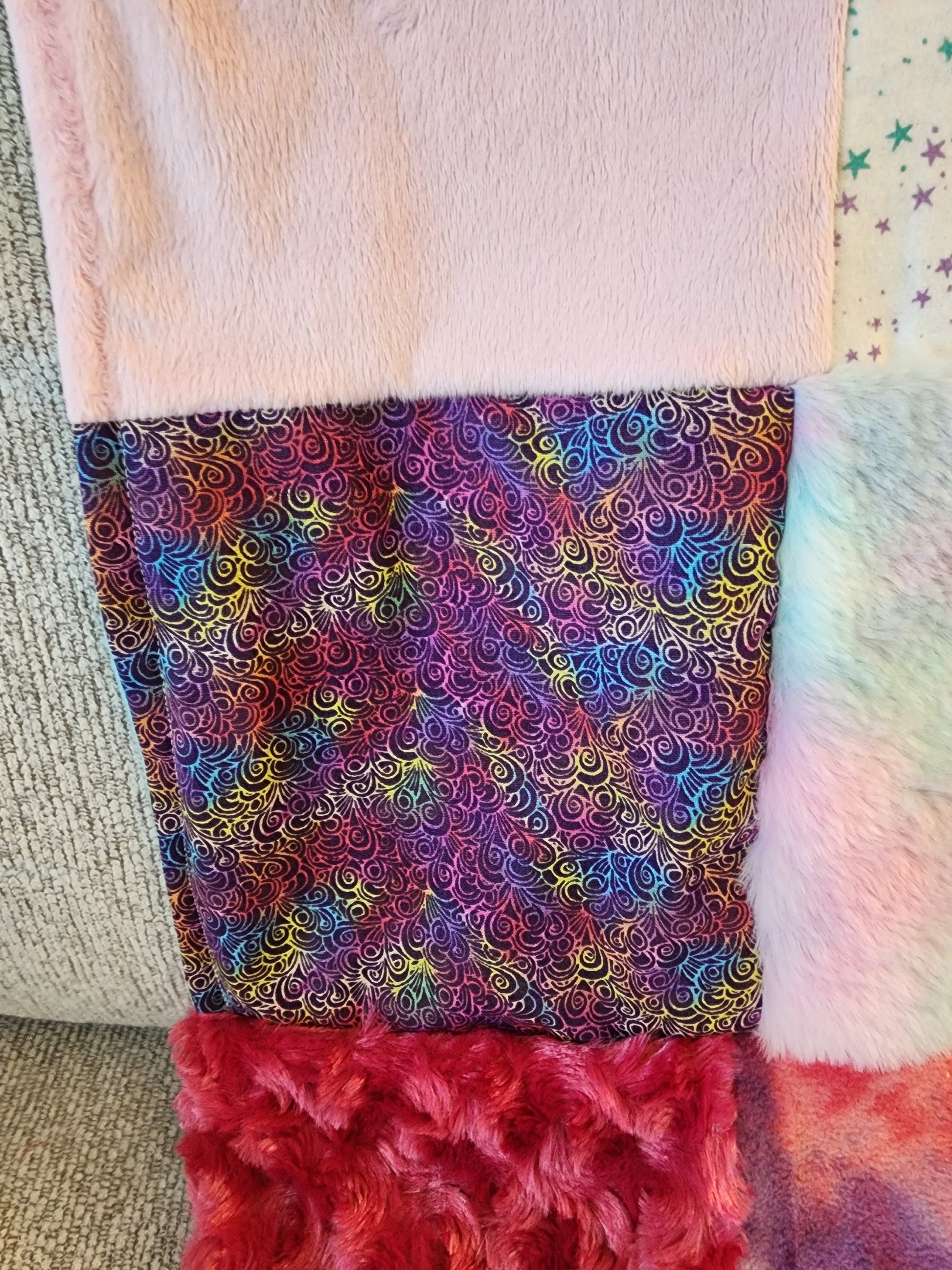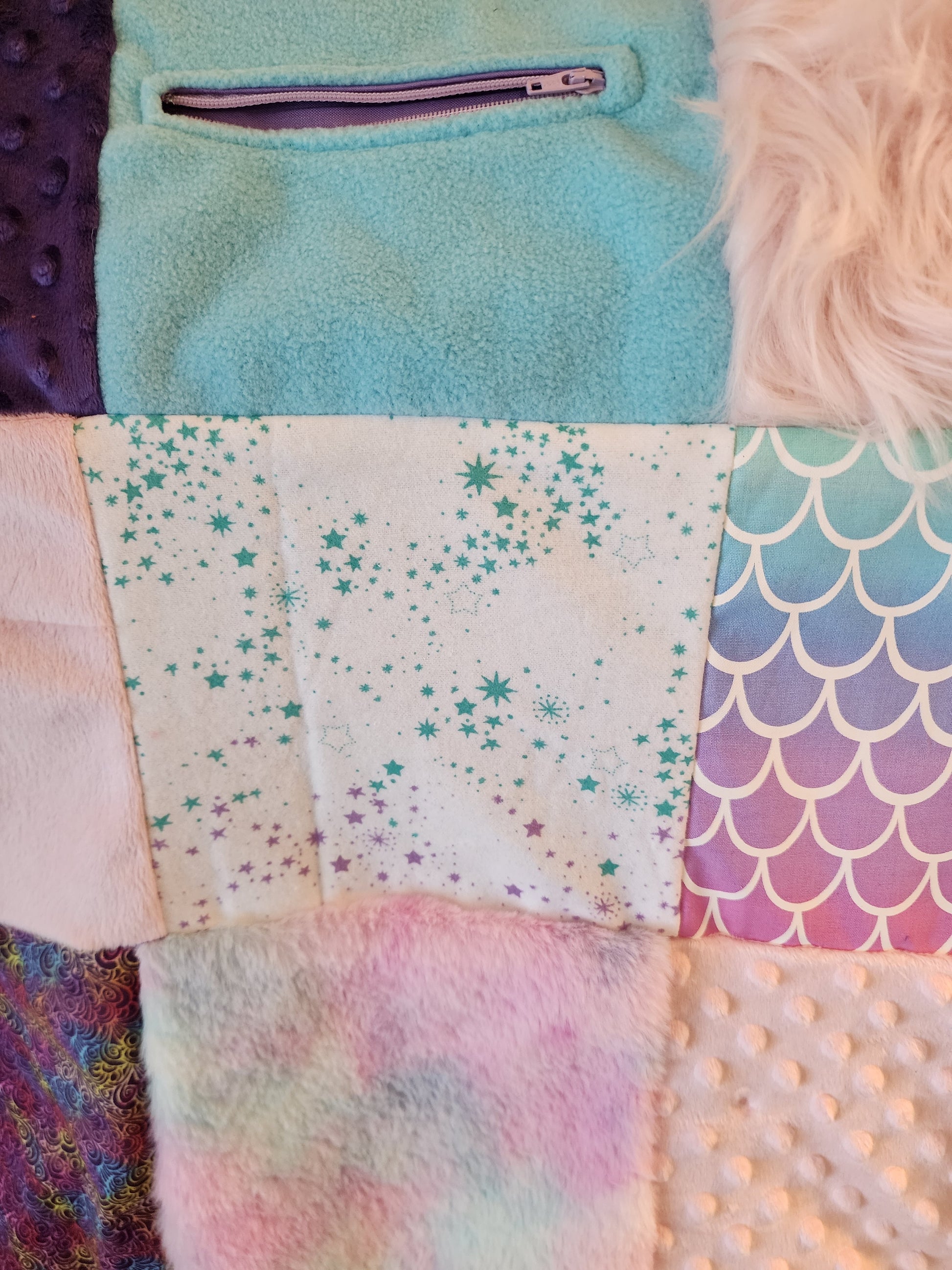 Hi everyone! This sensory blanket is perfect for all ages! It is approximately 21"x27" a perfect size for a lap. This blanket has light pink long faux fur, dimple dot minky, zipper pouch fully functional, pink rosebud fur, cotton candy color plush super soft fur, fleece, and cotton. The back is a turquoise fleece.