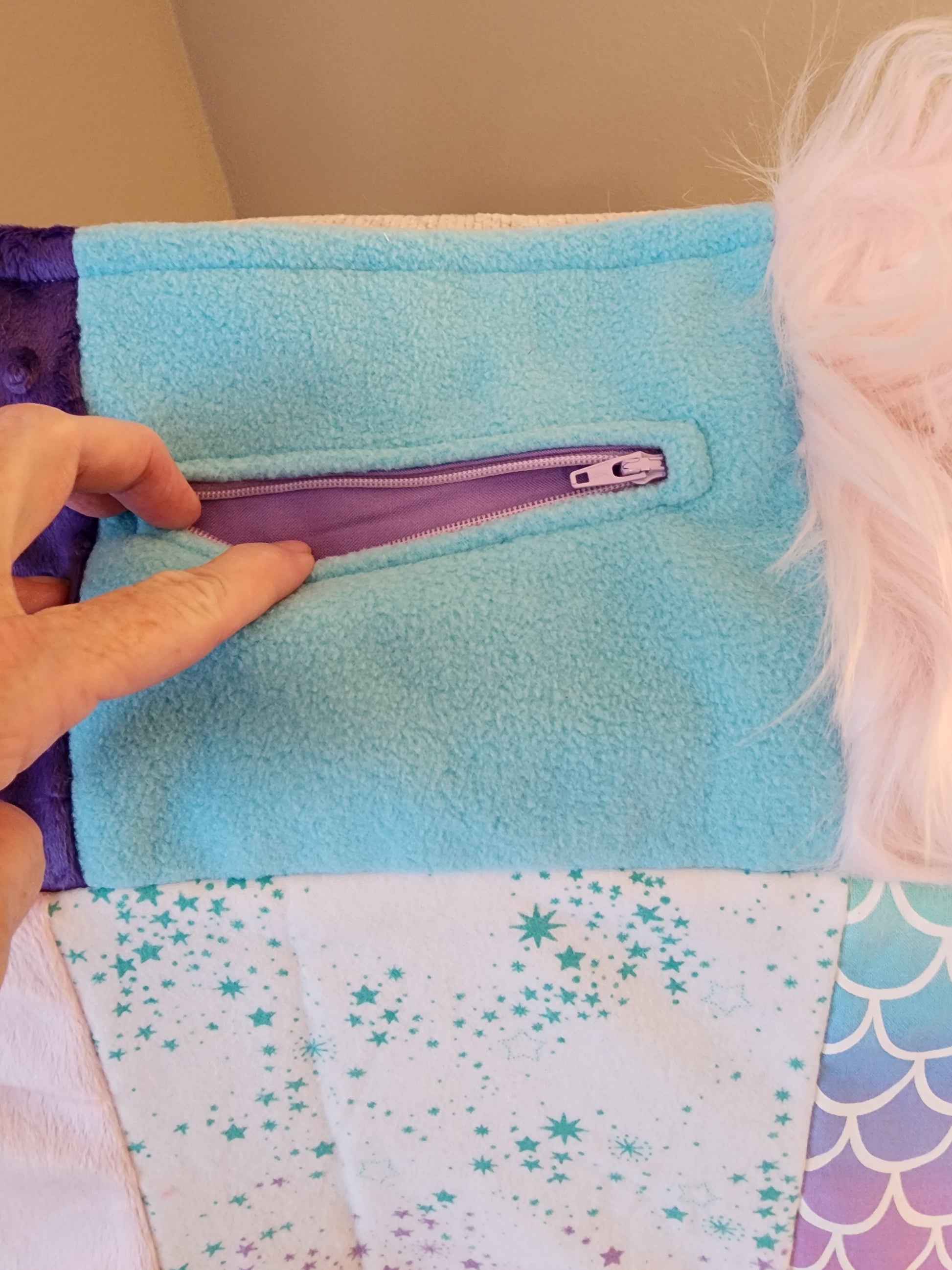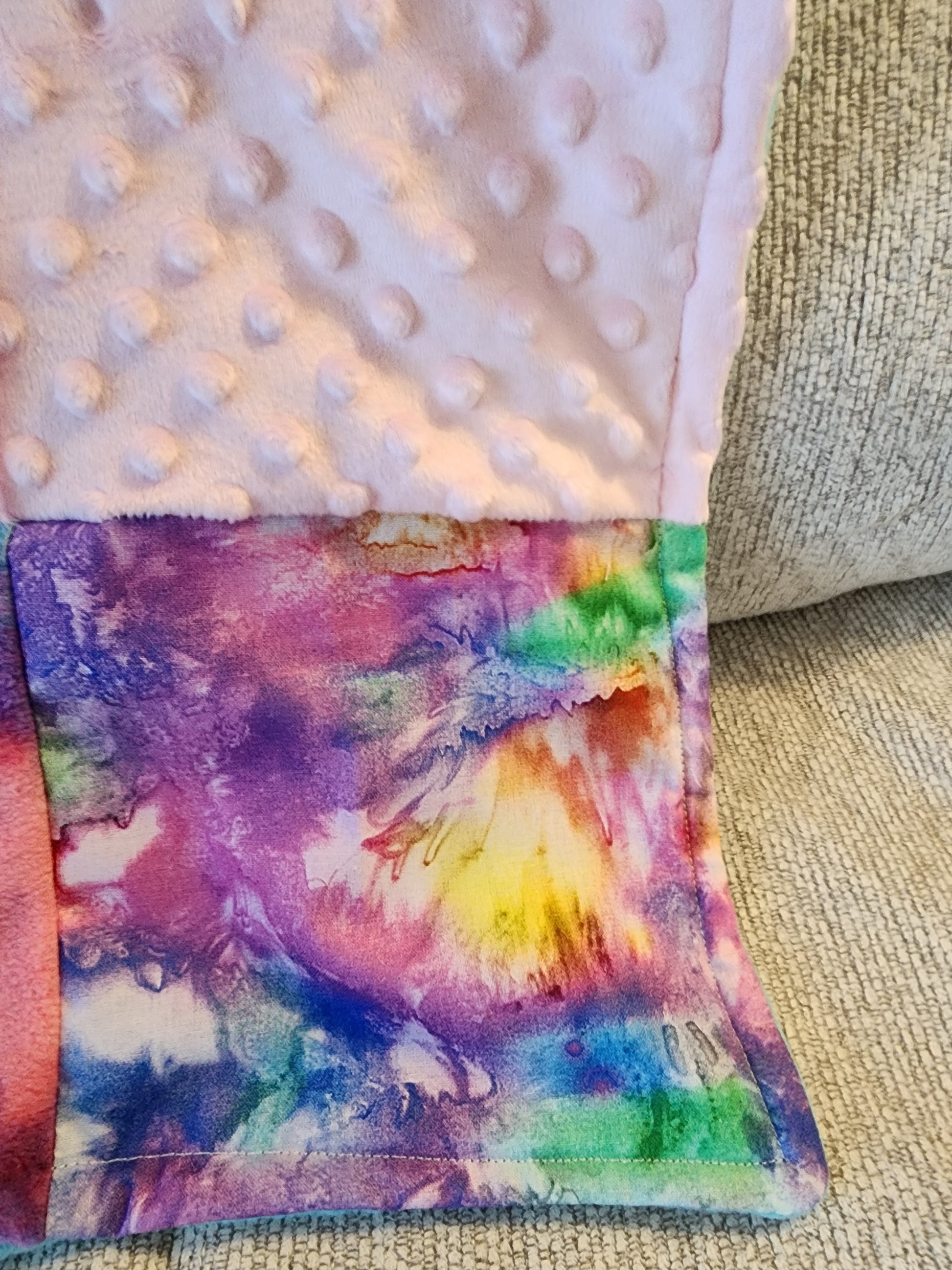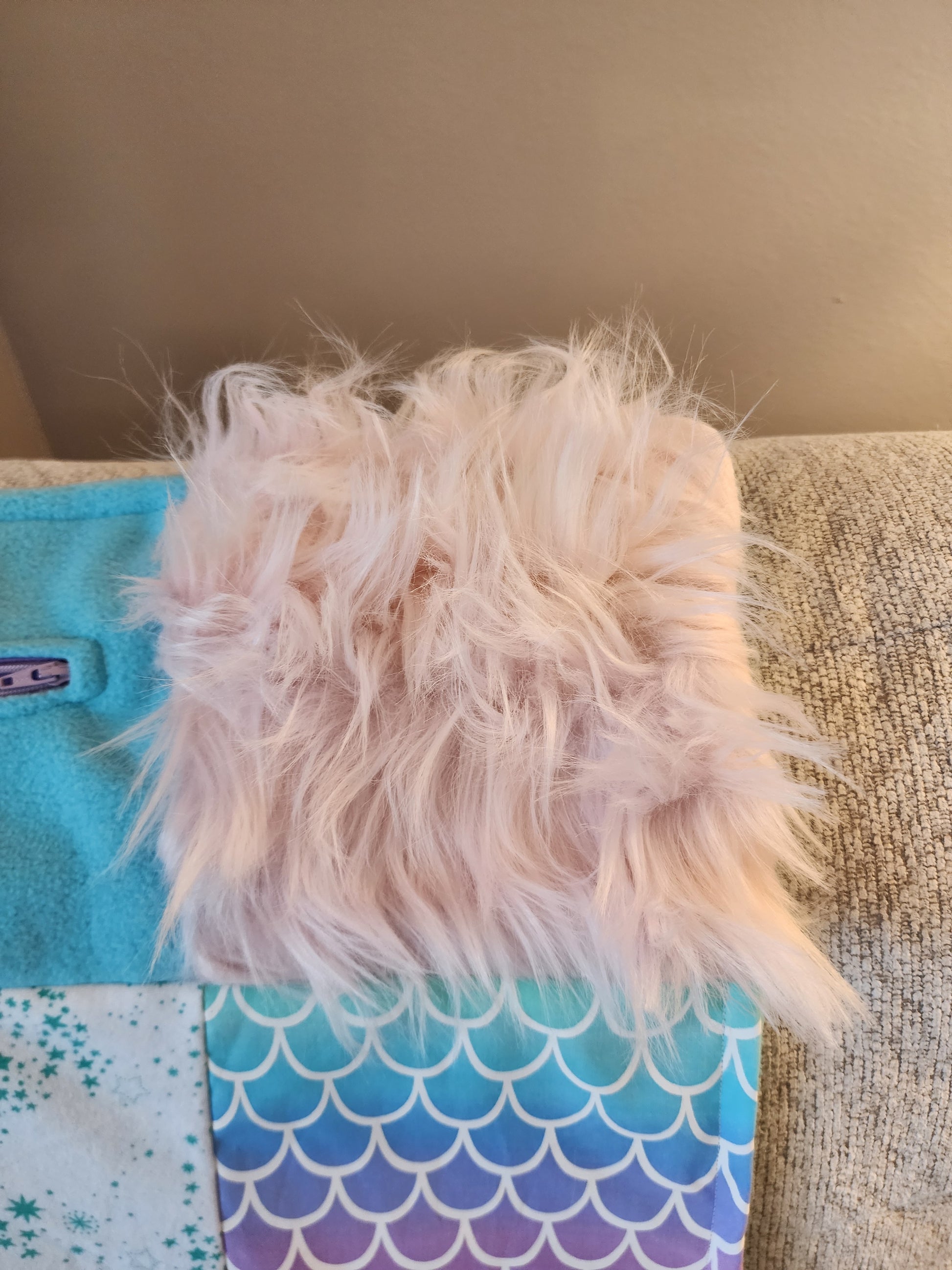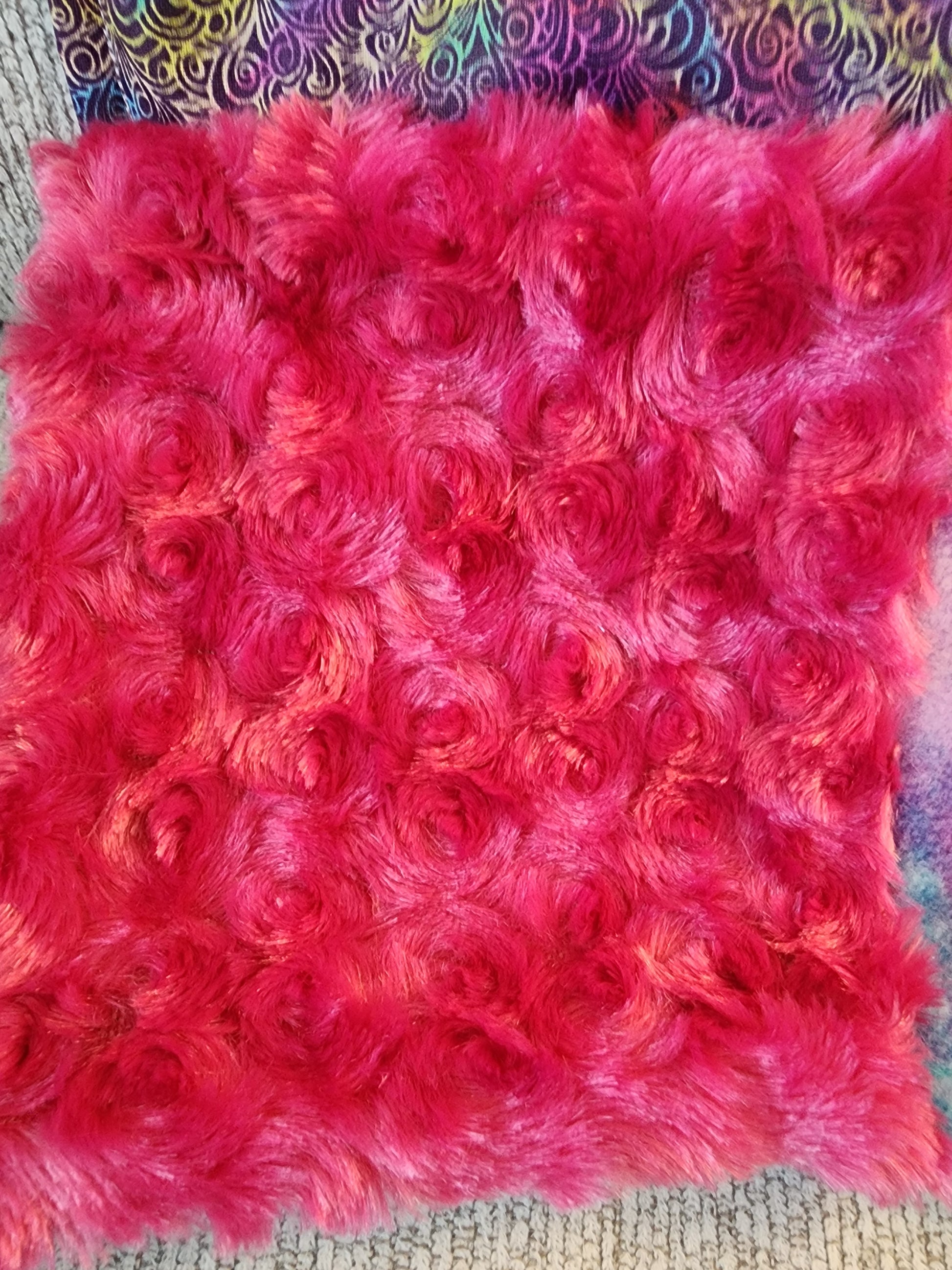 Hi everyone! This sensory blanket is perfect for all ages! It is approximately 21"x27" a perfect size for a lap. This blanket has light pink long faux fur, dimple dot minky, zipper pouch fully functional, pink rosebud fur, cotton candy color plush super soft fur, fleece, and cotton. The back is a turquoise fleece.
