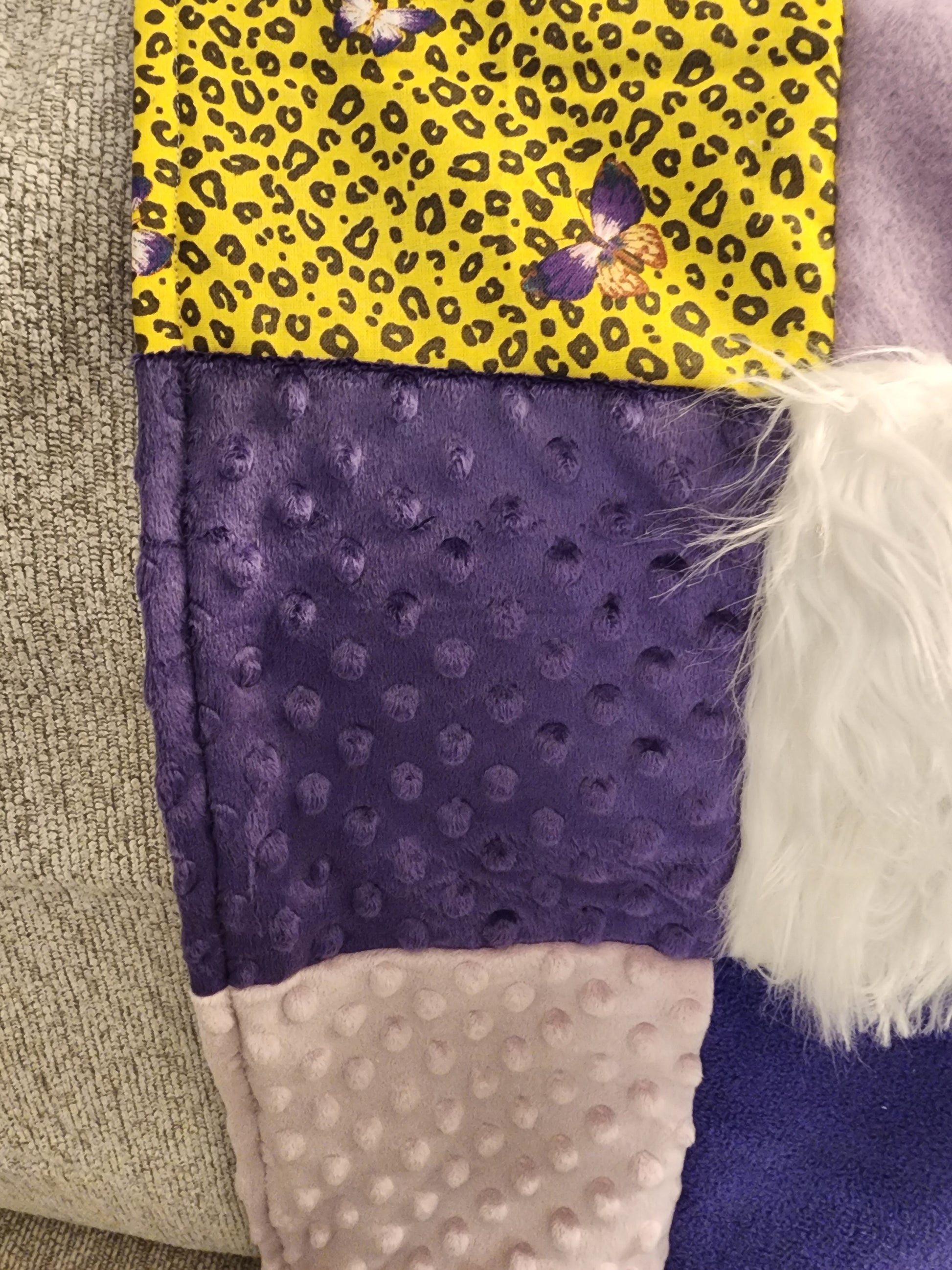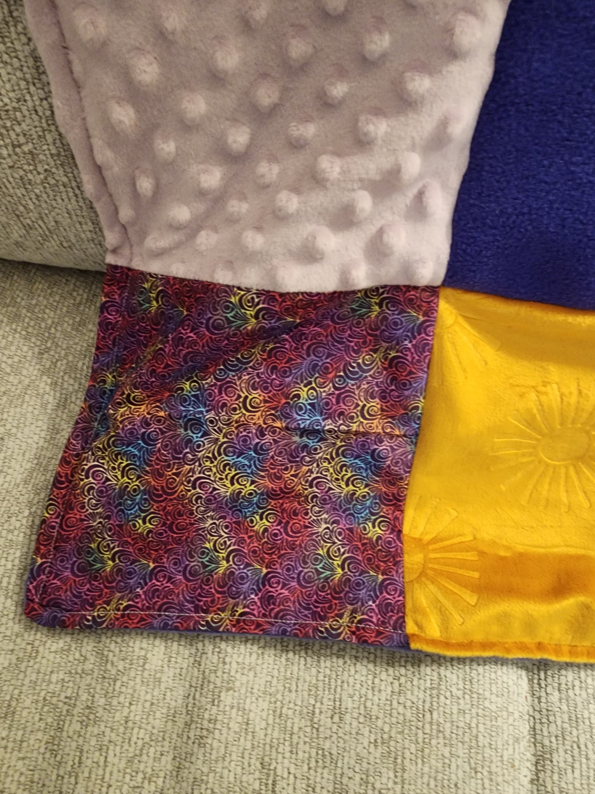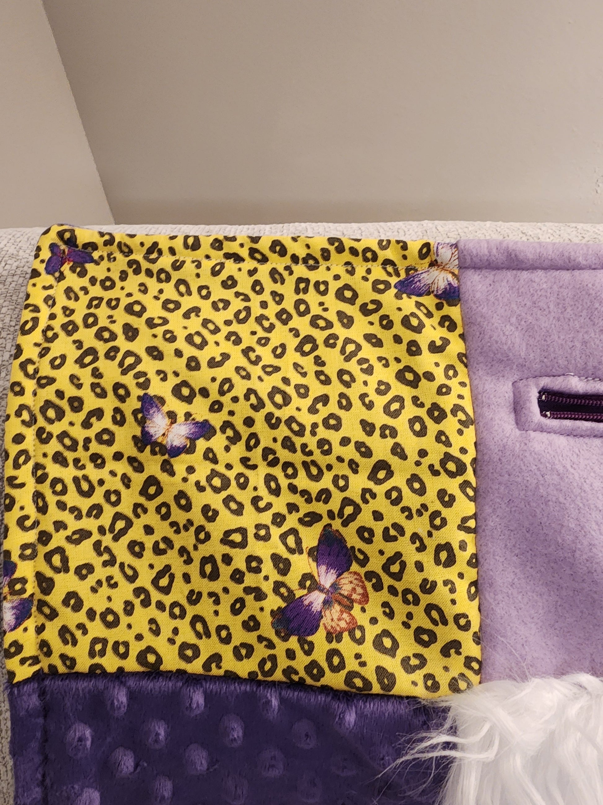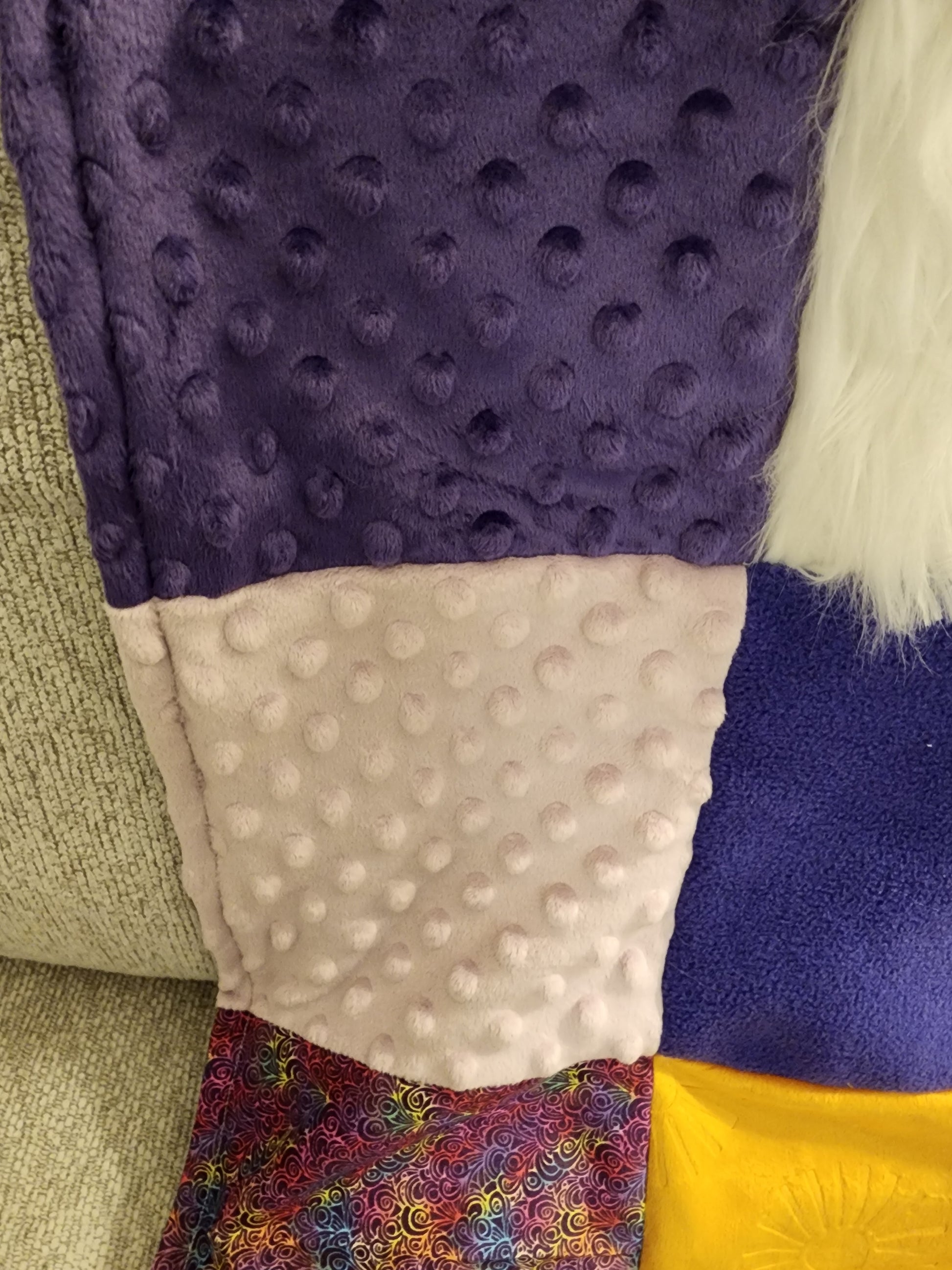 Hi everyone! This sensory blanket is perfect for all ages! It is approximately 21"x27" a perfect size for a lap. This blanket has White faux fur, Gold smooth minky, dimple dot minky, Paint Splatter fleece, fully functional zipper pouch, fleece, cotton. The back is a purple fleece.