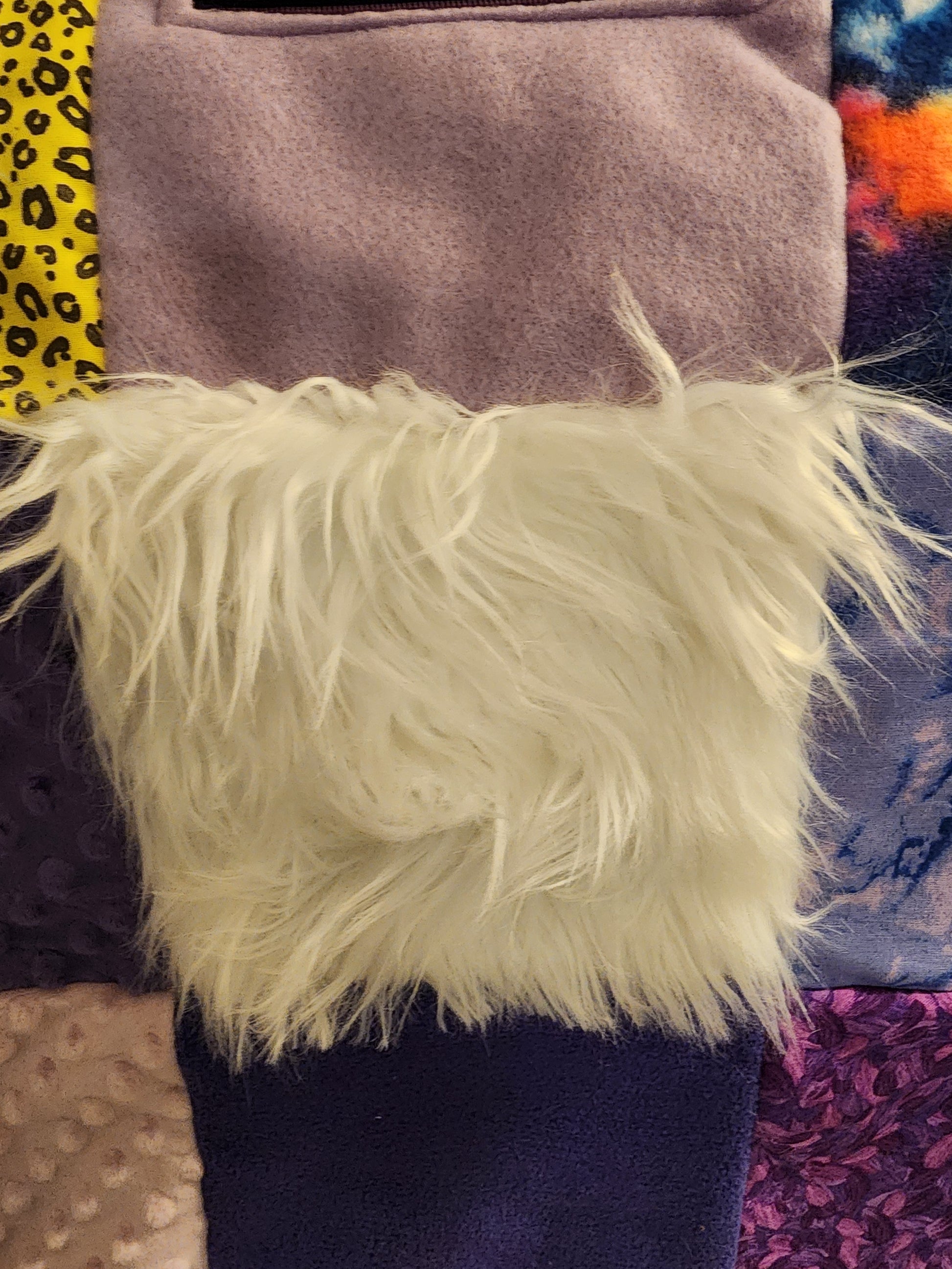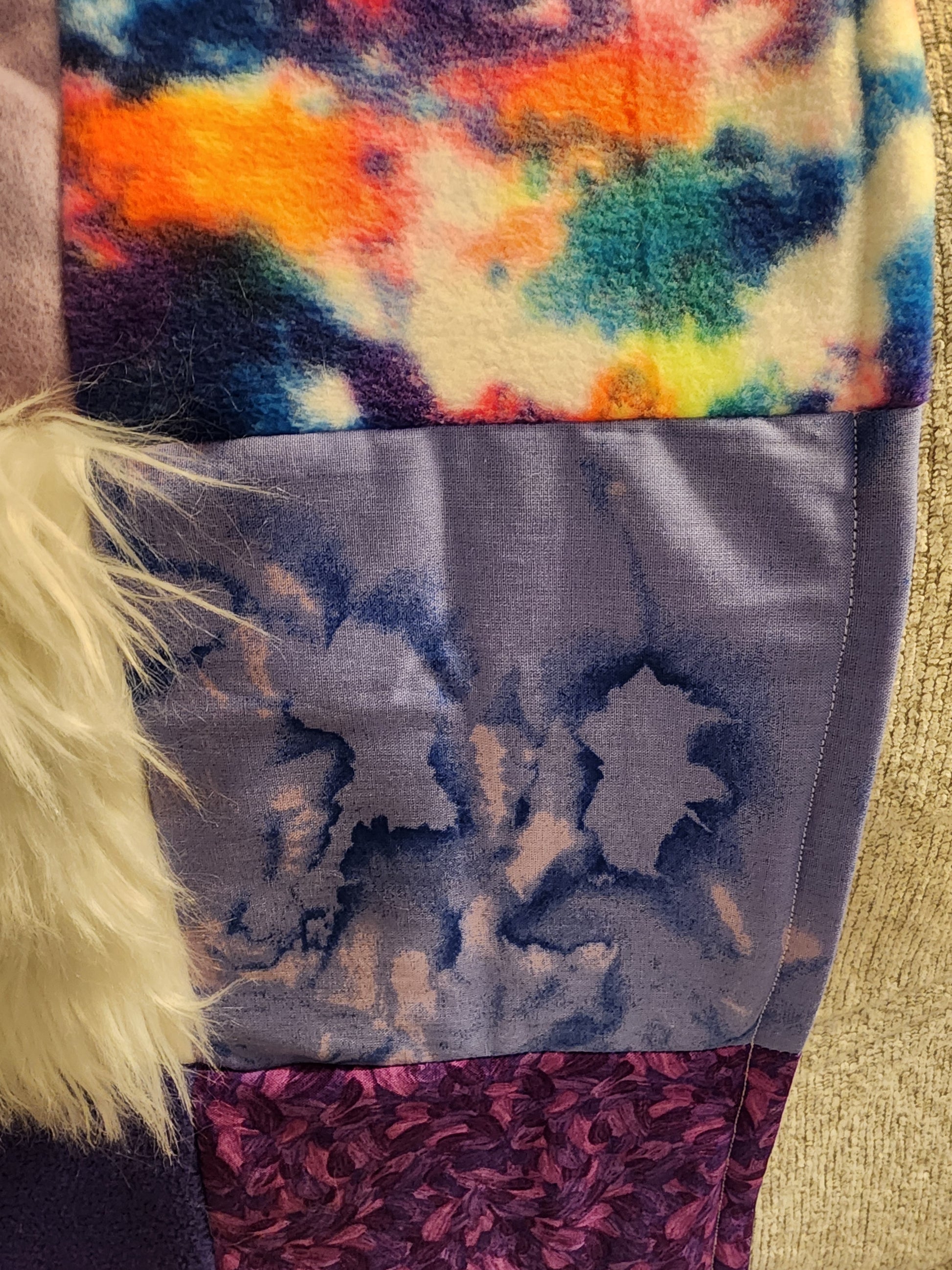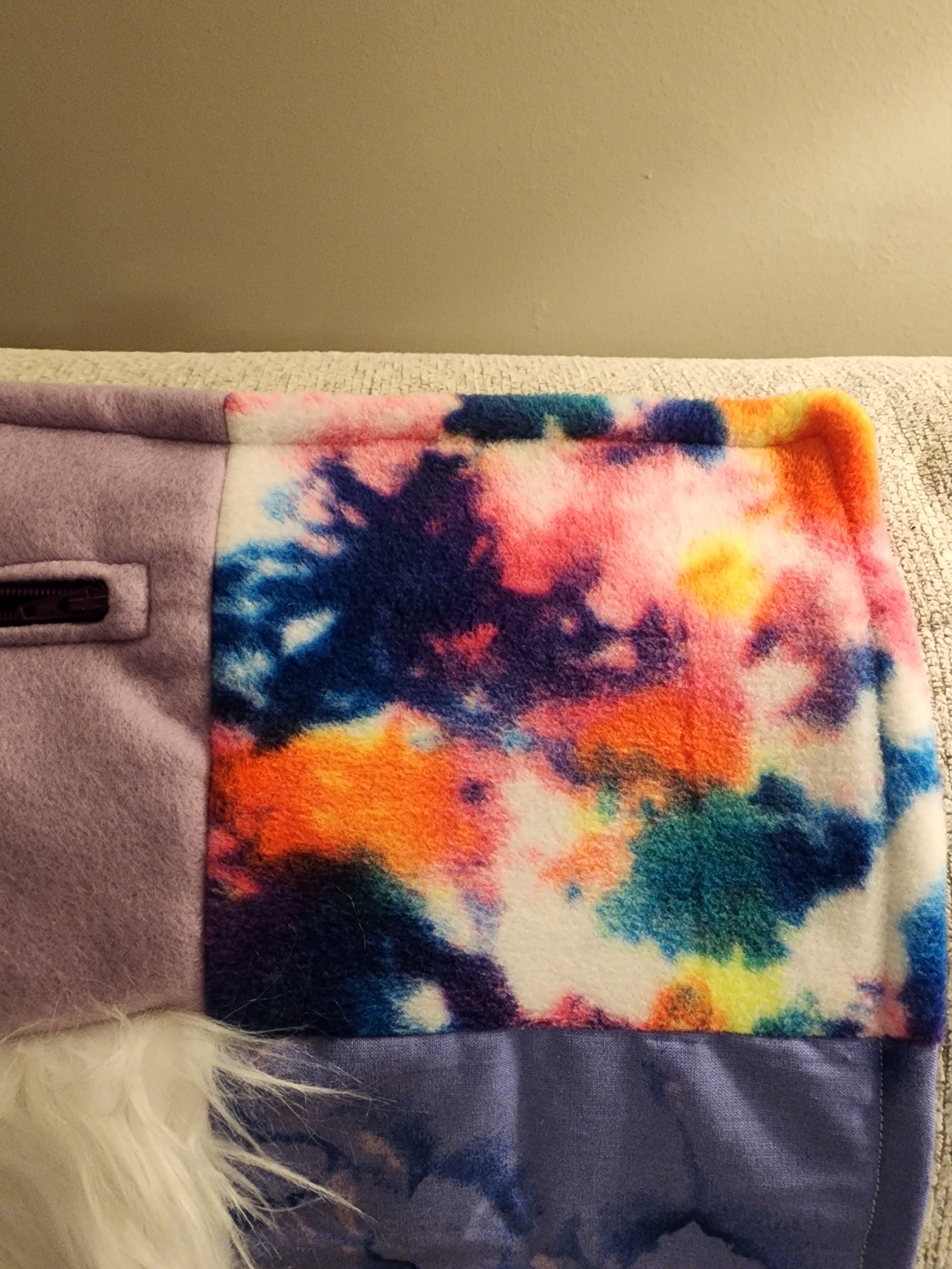 Hi everyone! This sensory blanket is perfect for all ages! It is approximately 21"x27" a perfect size for a lap. This blanket has White faux fur, Gold smooth minky, dimple dot minky, Paint Splatter fleece, fully functional zipper pouch, fleece, cotton. The back is a purple fleece.