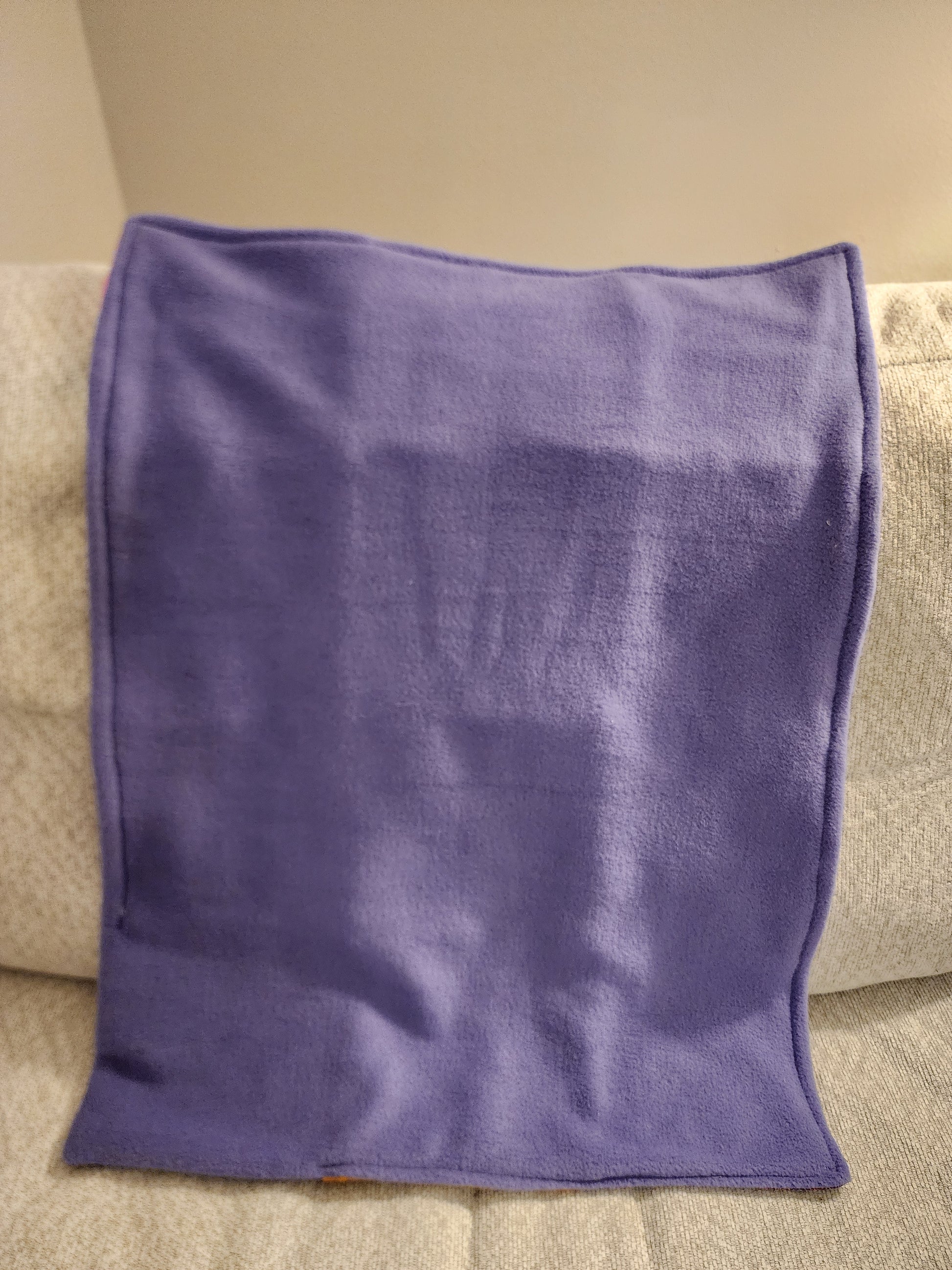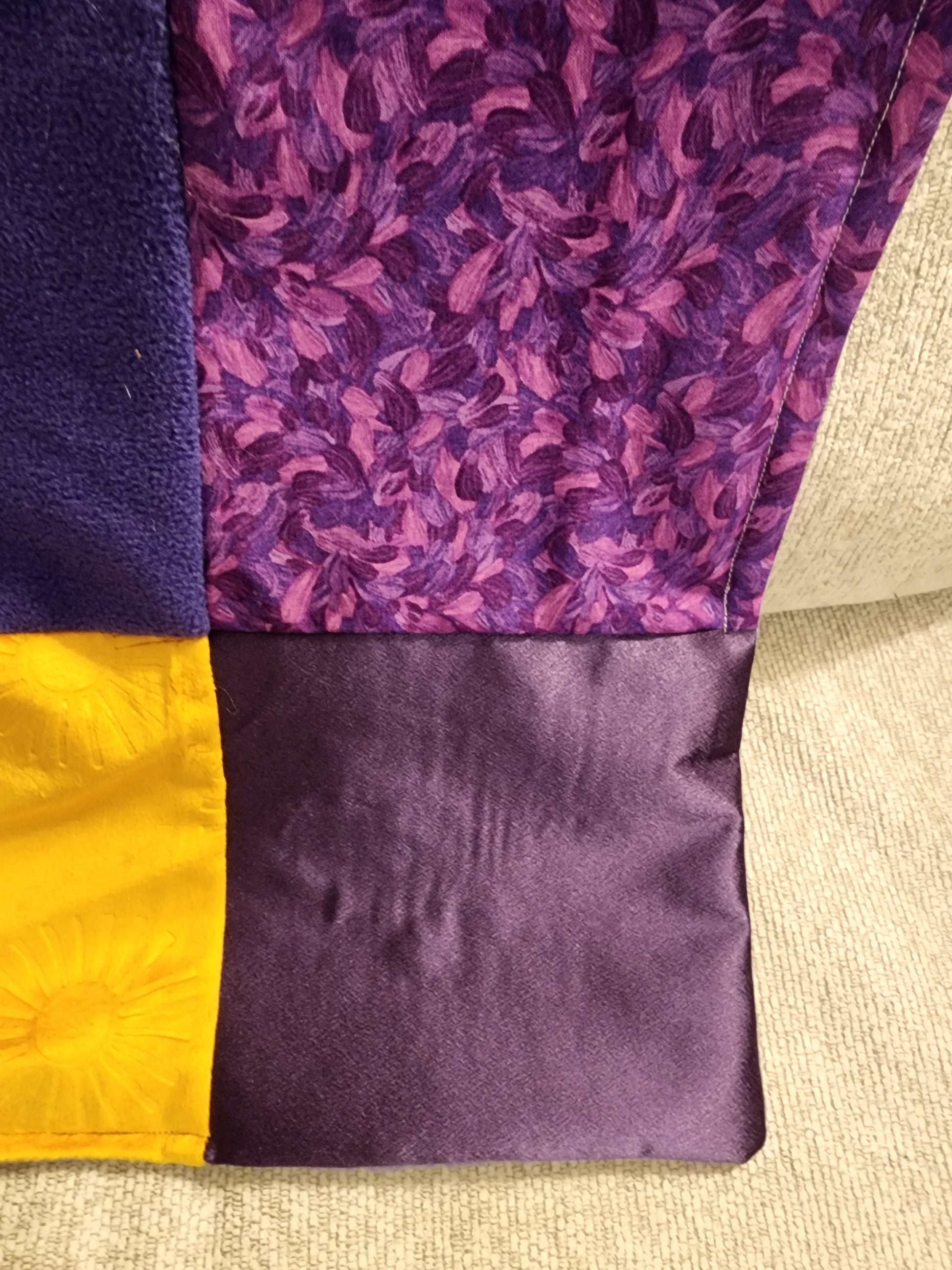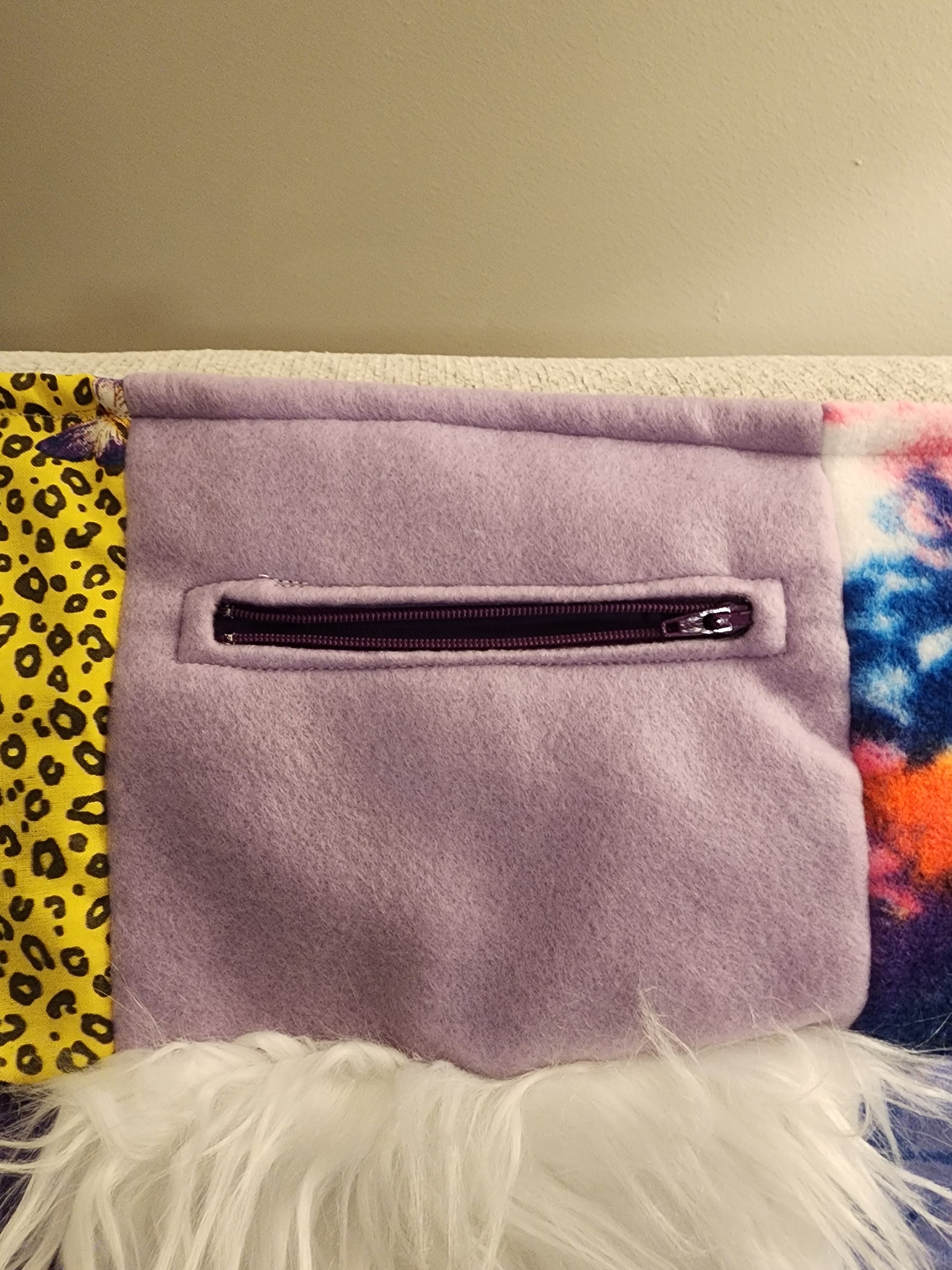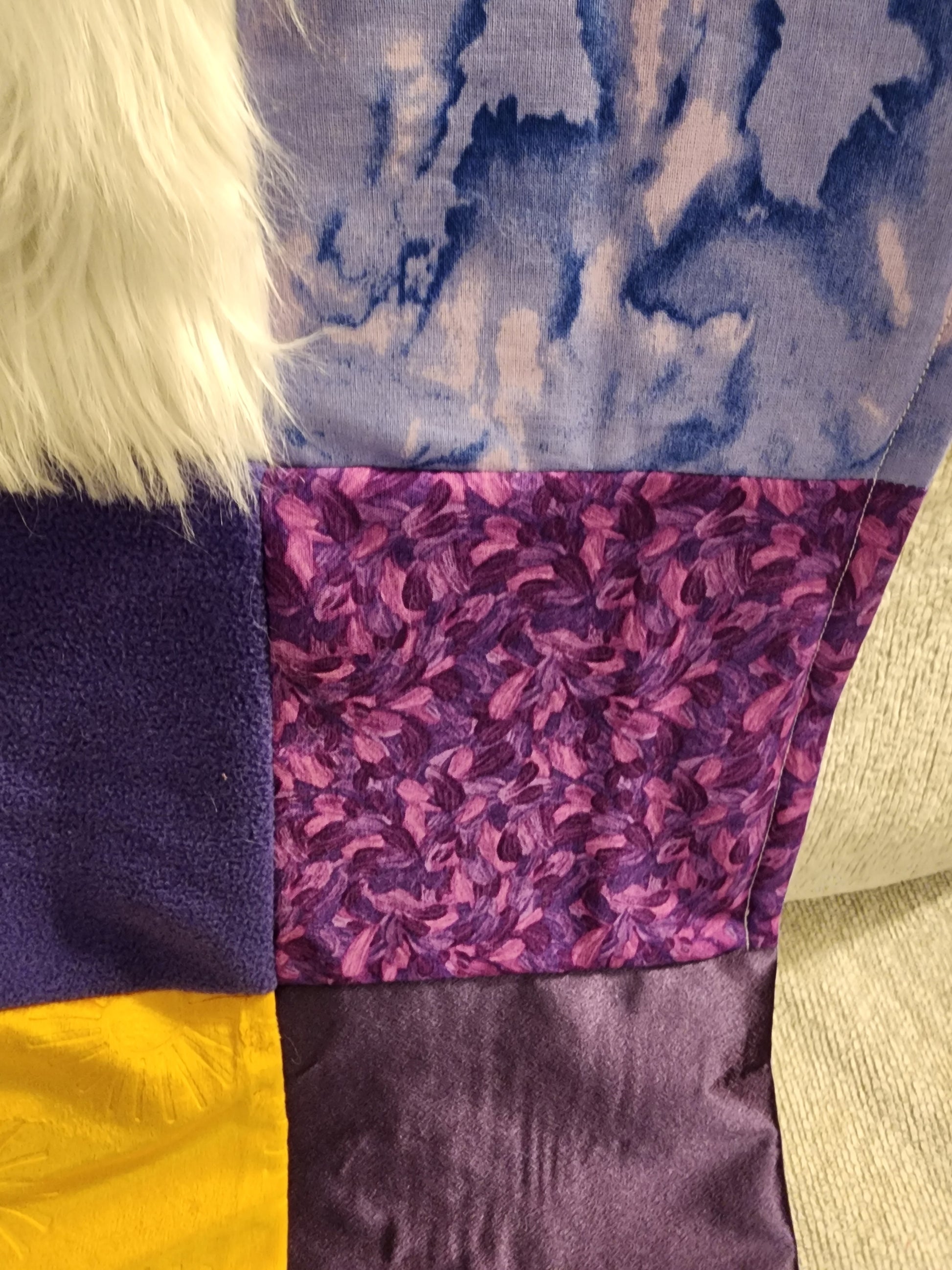 Hi everyone! This sensory blanket is perfect for all ages! It is approximately 21"x27" a perfect size for a lap. This blanket has White faux fur, Gold smooth minky, dimple dot minky, Paint Splatter fleece, fully functional zipper pouch, fleece, cotton. The back is a purple fleece.