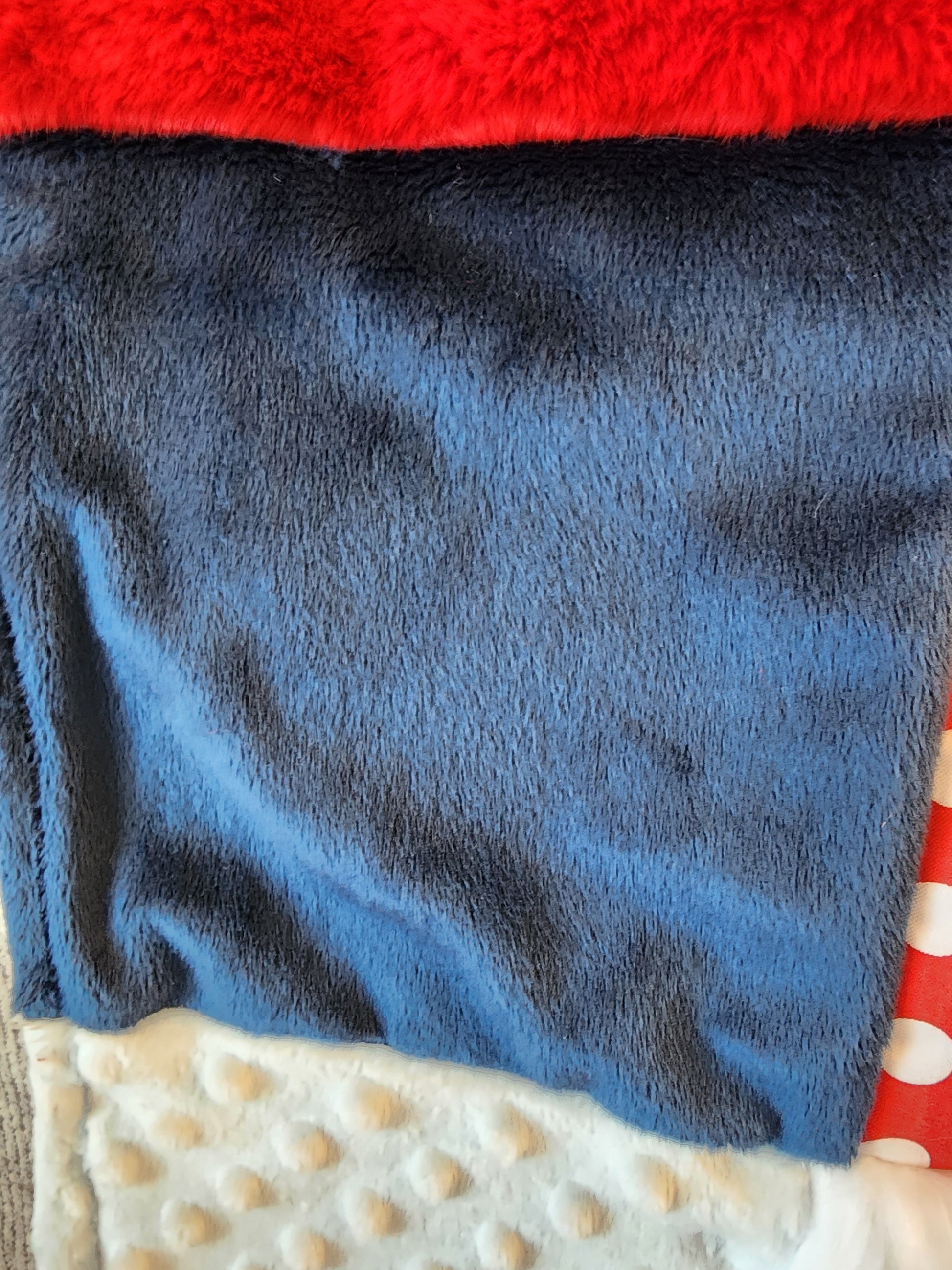Hi everyone! This sensory blanket is perfect for all ages! It is approximately 21"x27" a perfect size for a lap. This blanket has white faux fur, Red Faux fur, dimple dot minky, silver shinney fabric, fully functional zipper pouch, fleece, cotton. The back is a seafoam green fleece.