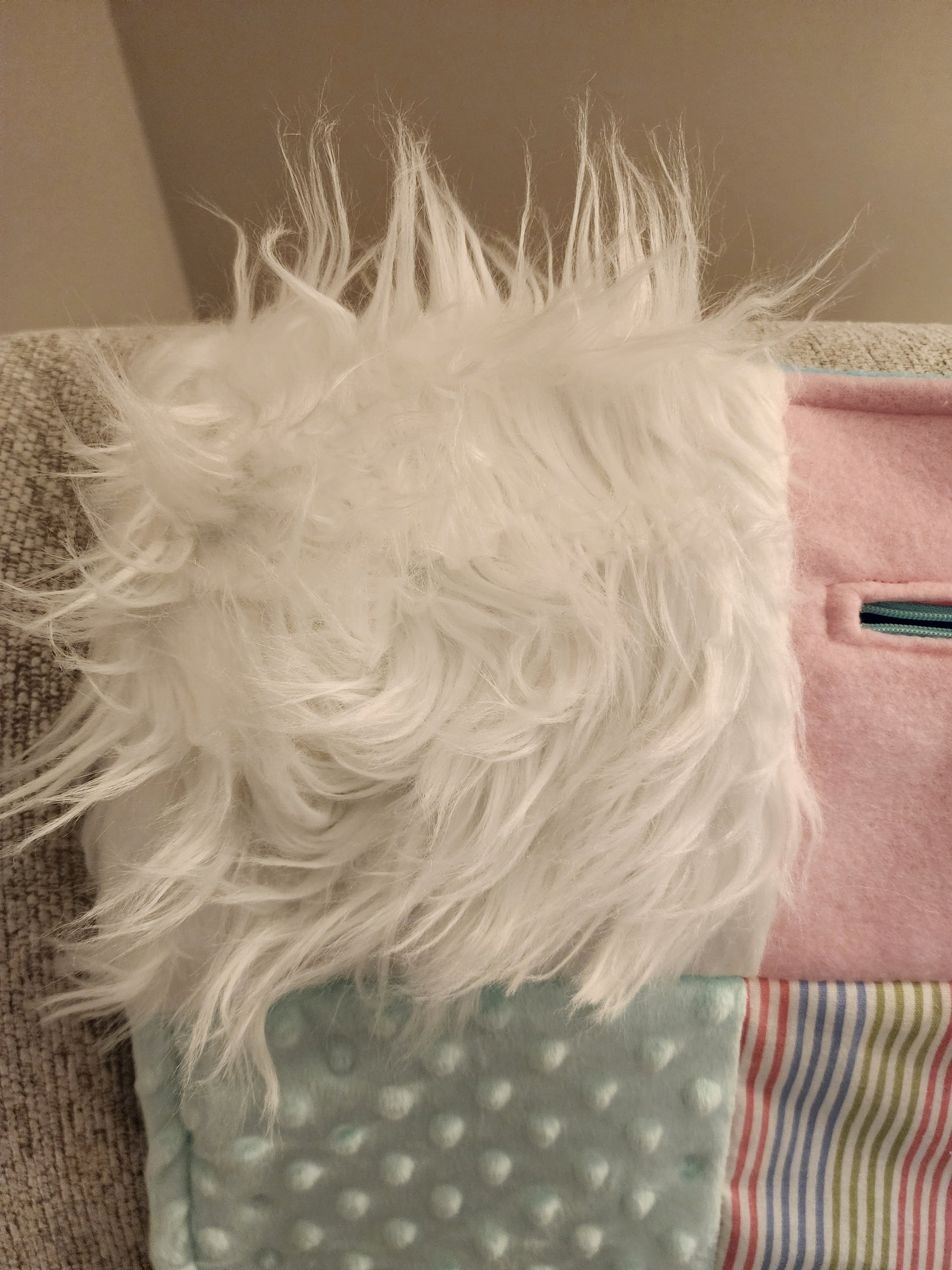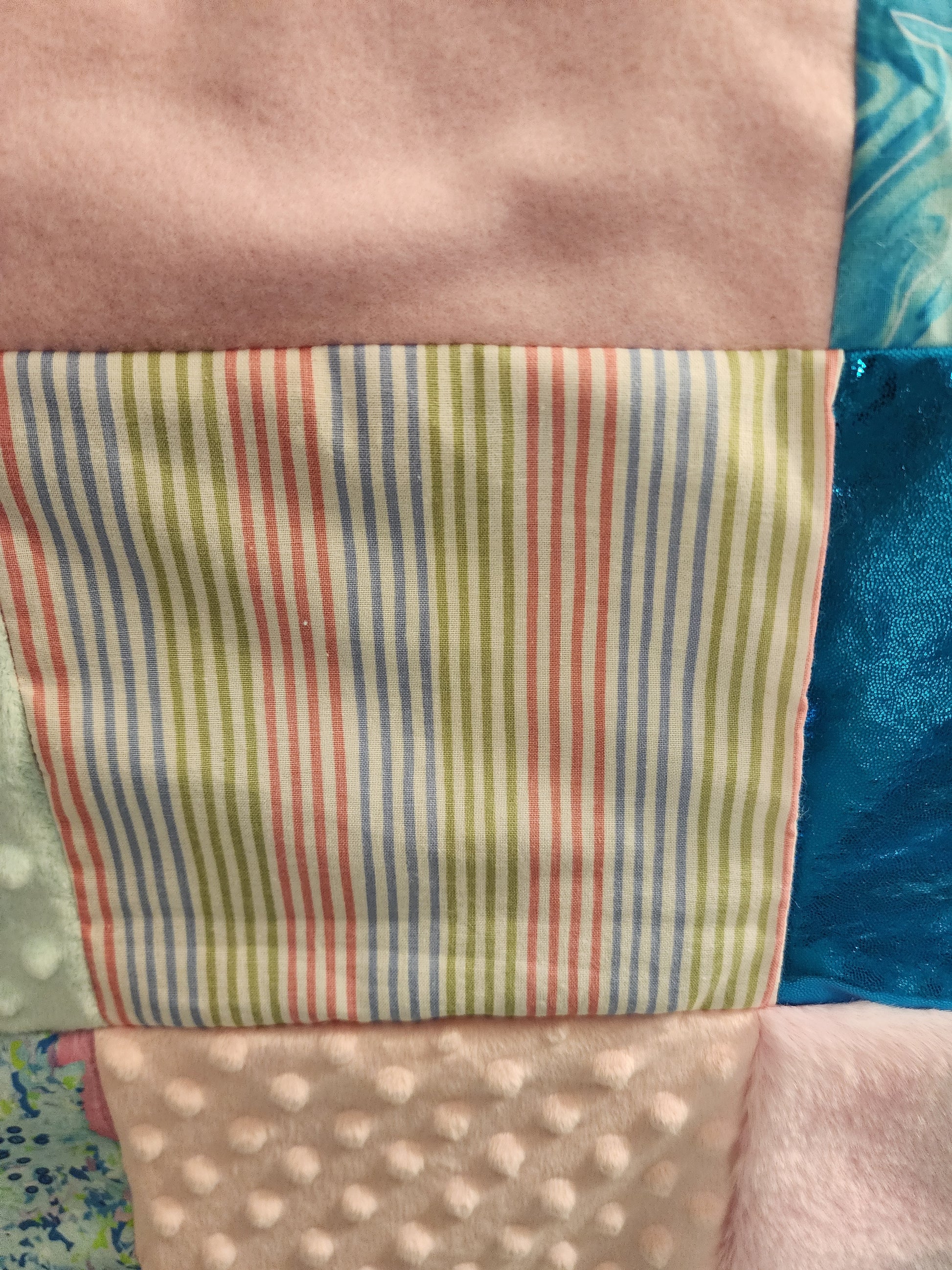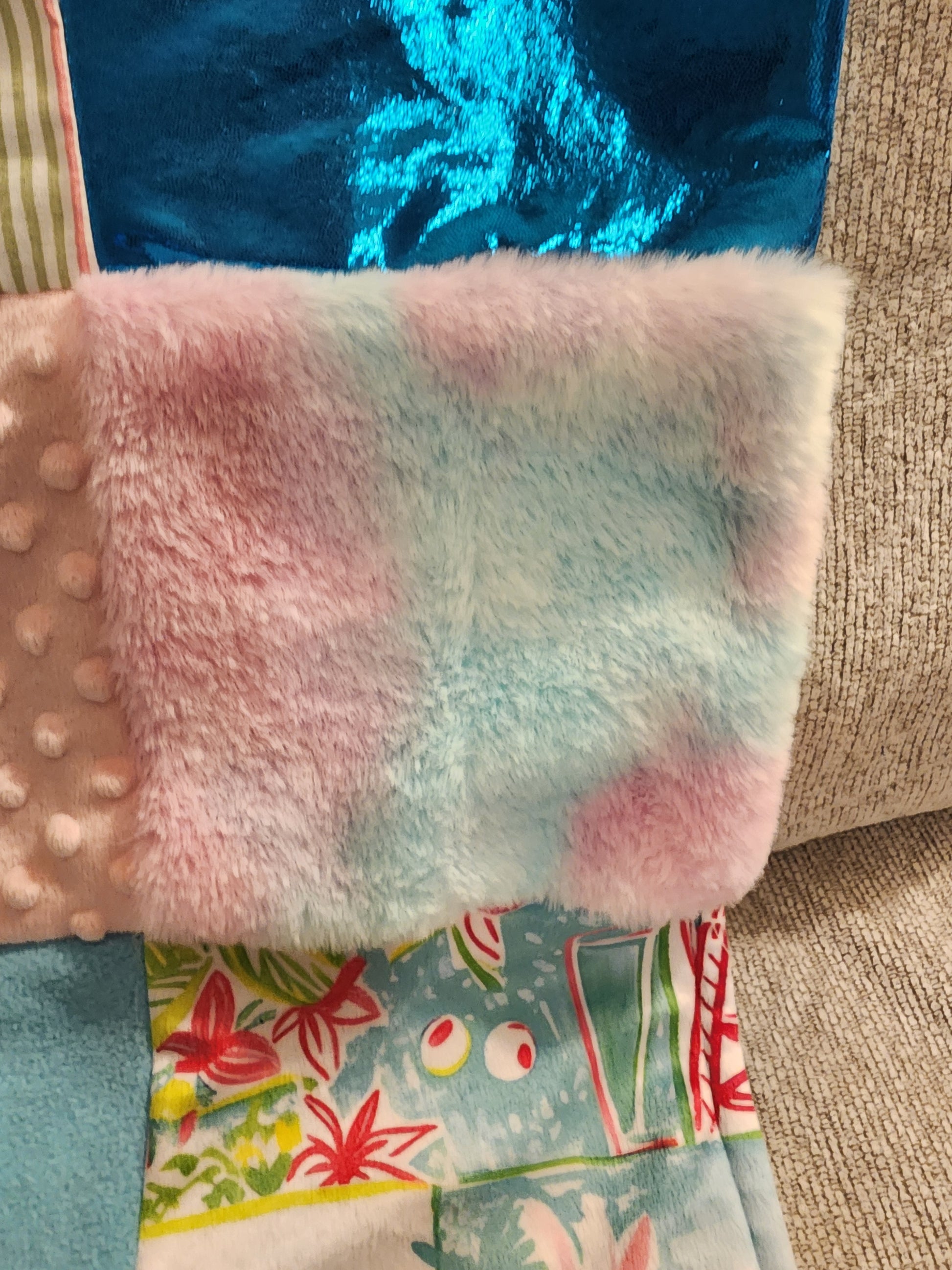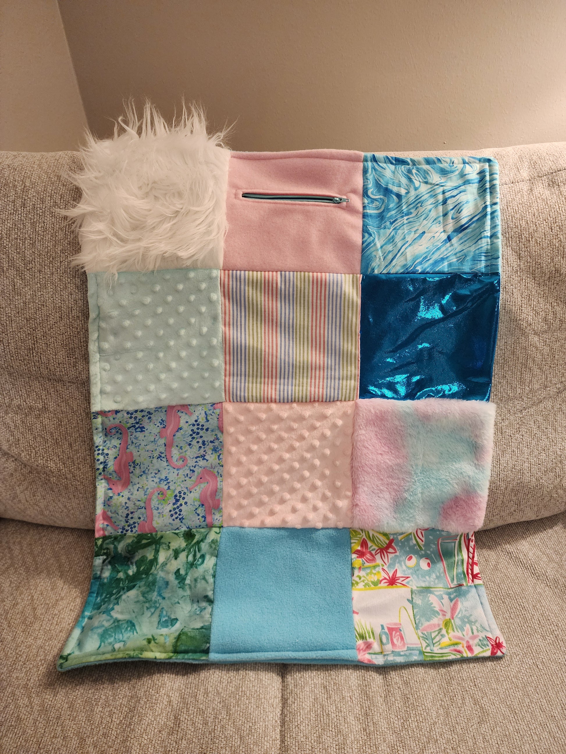 Hi everyone! This sensory blanket is perfect for all ages! It is approximately 21"x27" a perfect size for a lap. This blanket has white fur, dimple dot minky, blush fabric, fully functional zipper pouch, seahorse fabric, fleece, cotton, multi color lines fabric, cotton candy color fur, blue shimmer fabric. The back is a turquoise fleece.
