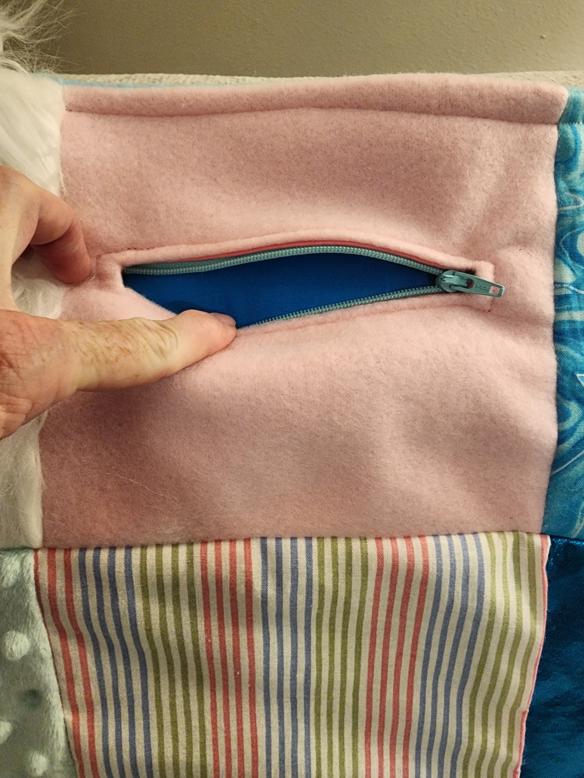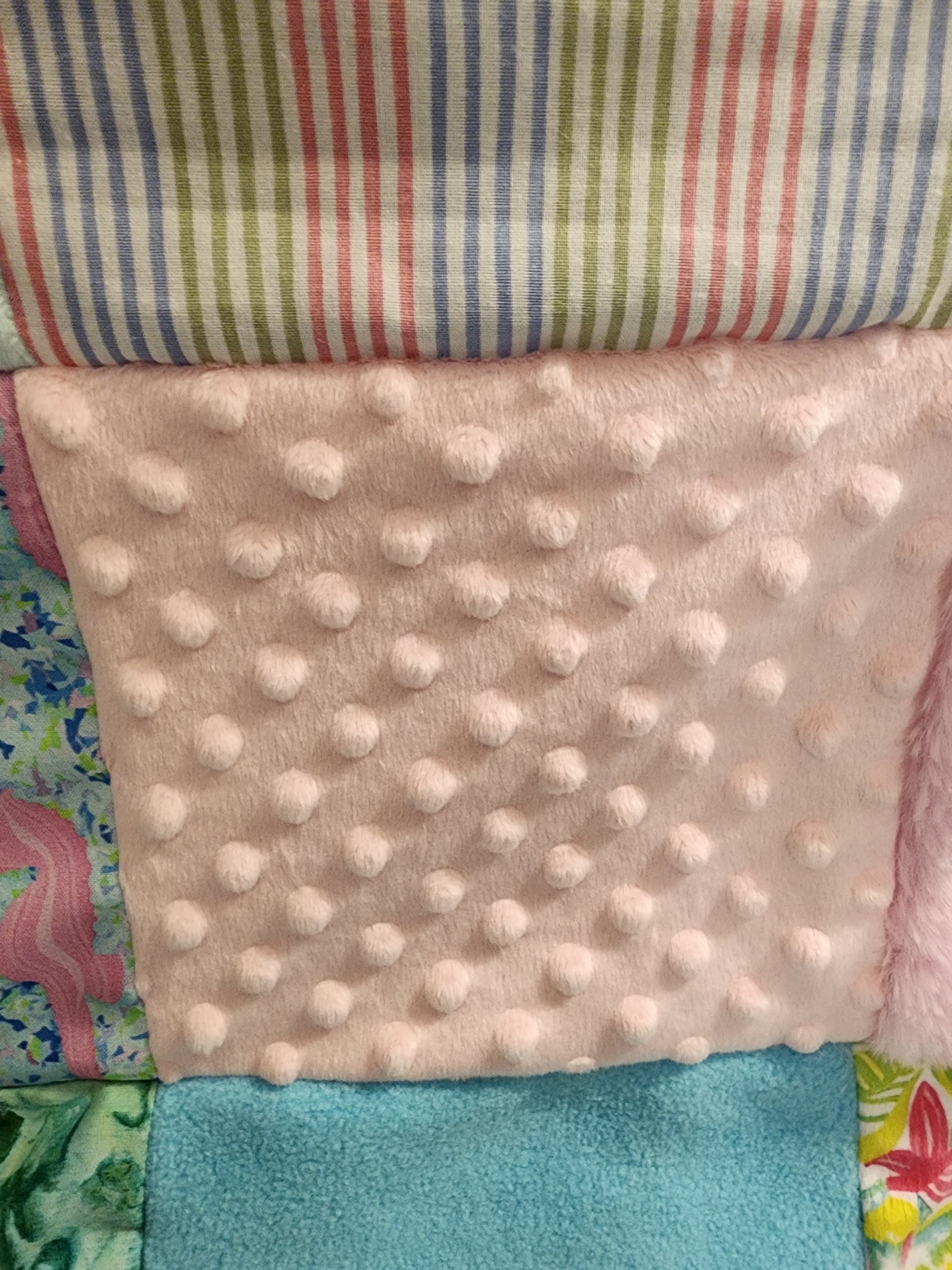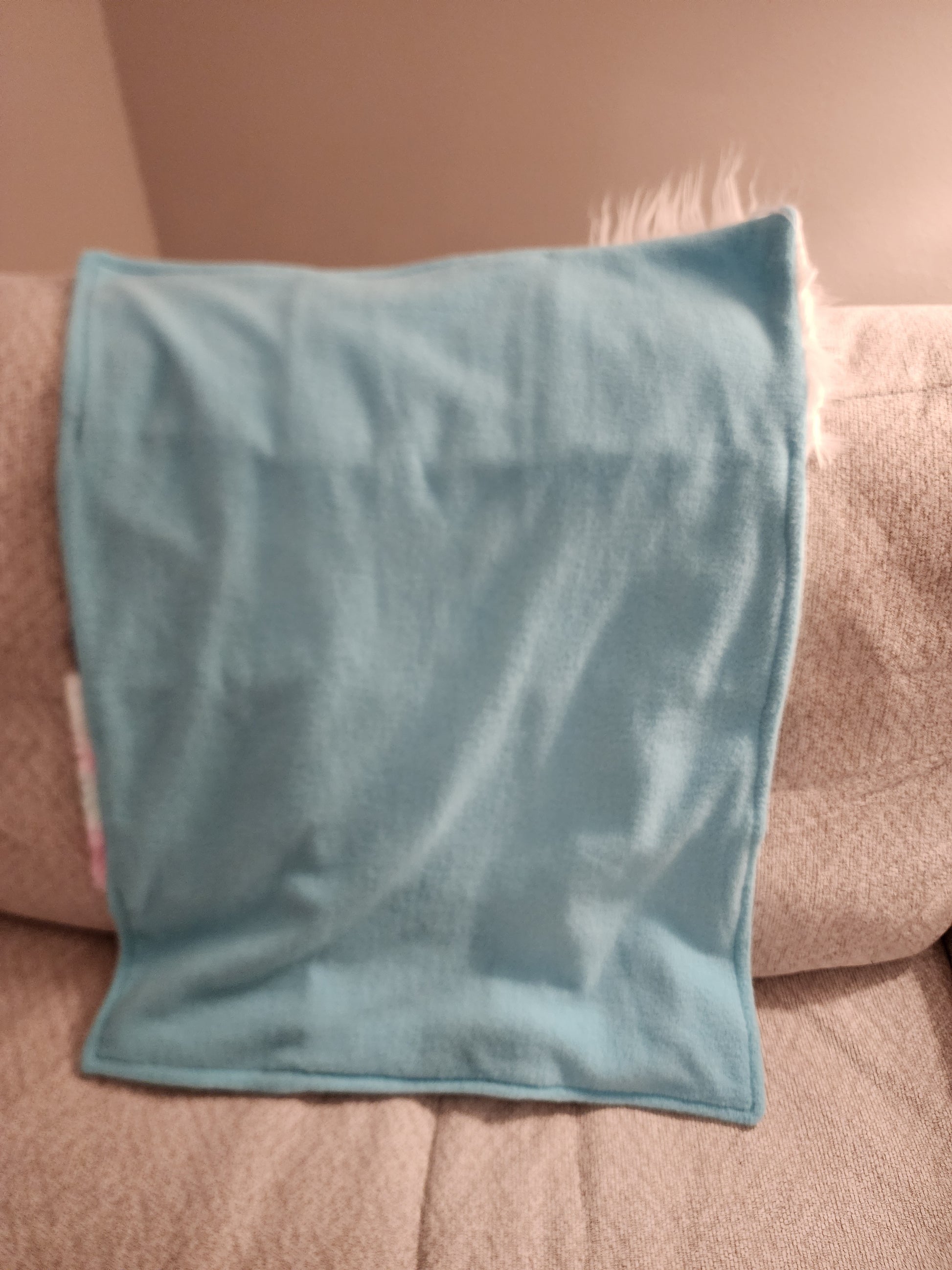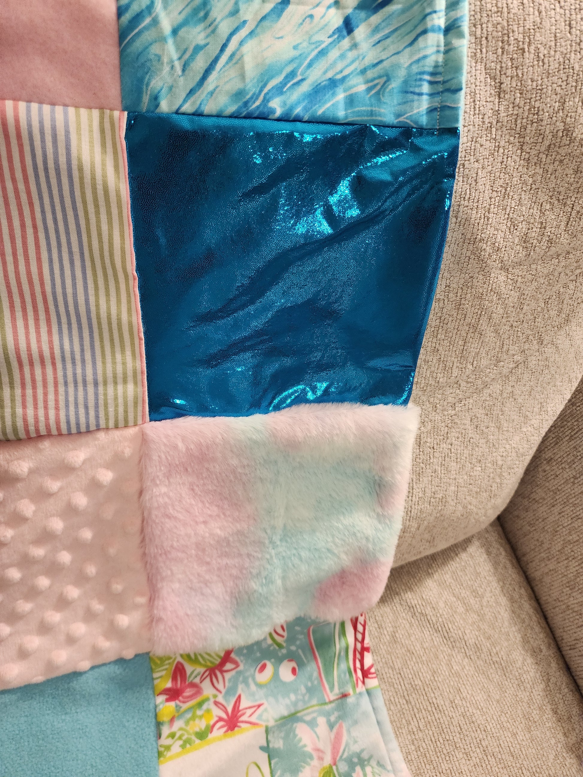 Hi everyone! This sensory blanket is perfect for all ages! It is approximately 21"x27" a perfect size for a lap. This blanket has white fur, dimple dot minky, blush fabric, fully functional zipper pouch, seahorse fabric, fleece, cotton, multi color lines fabric, cotton candy color fur, blue shimmer fabric. The back is a turquoise fleece.