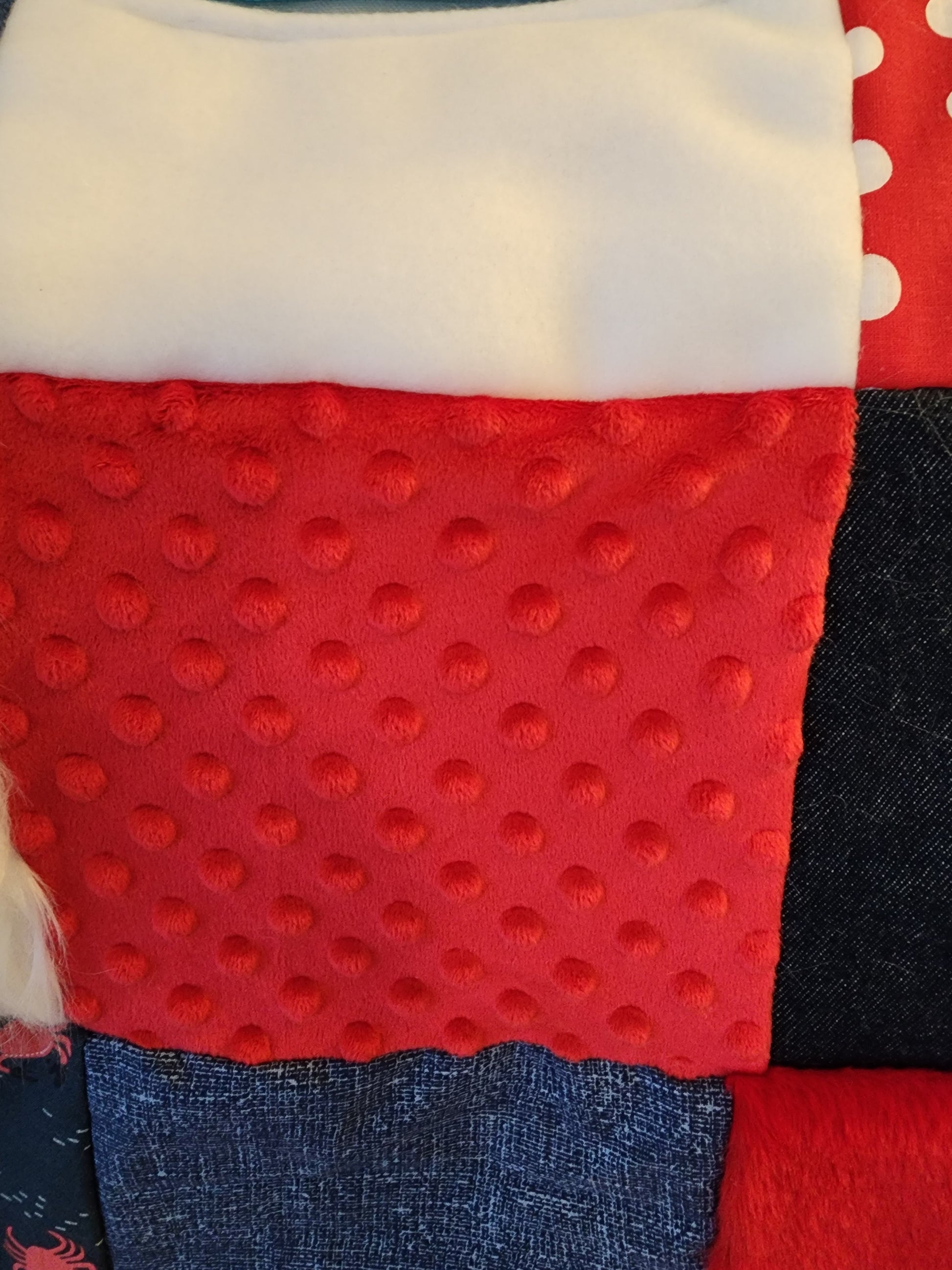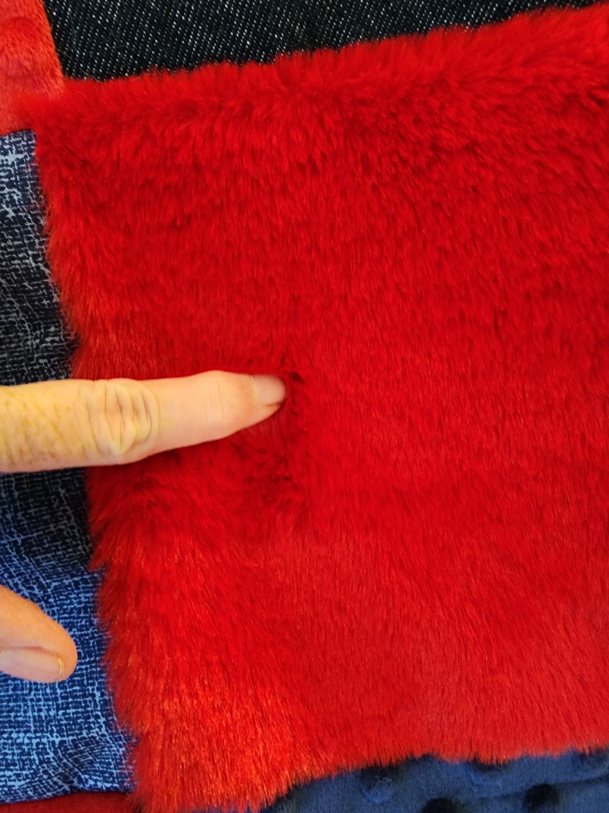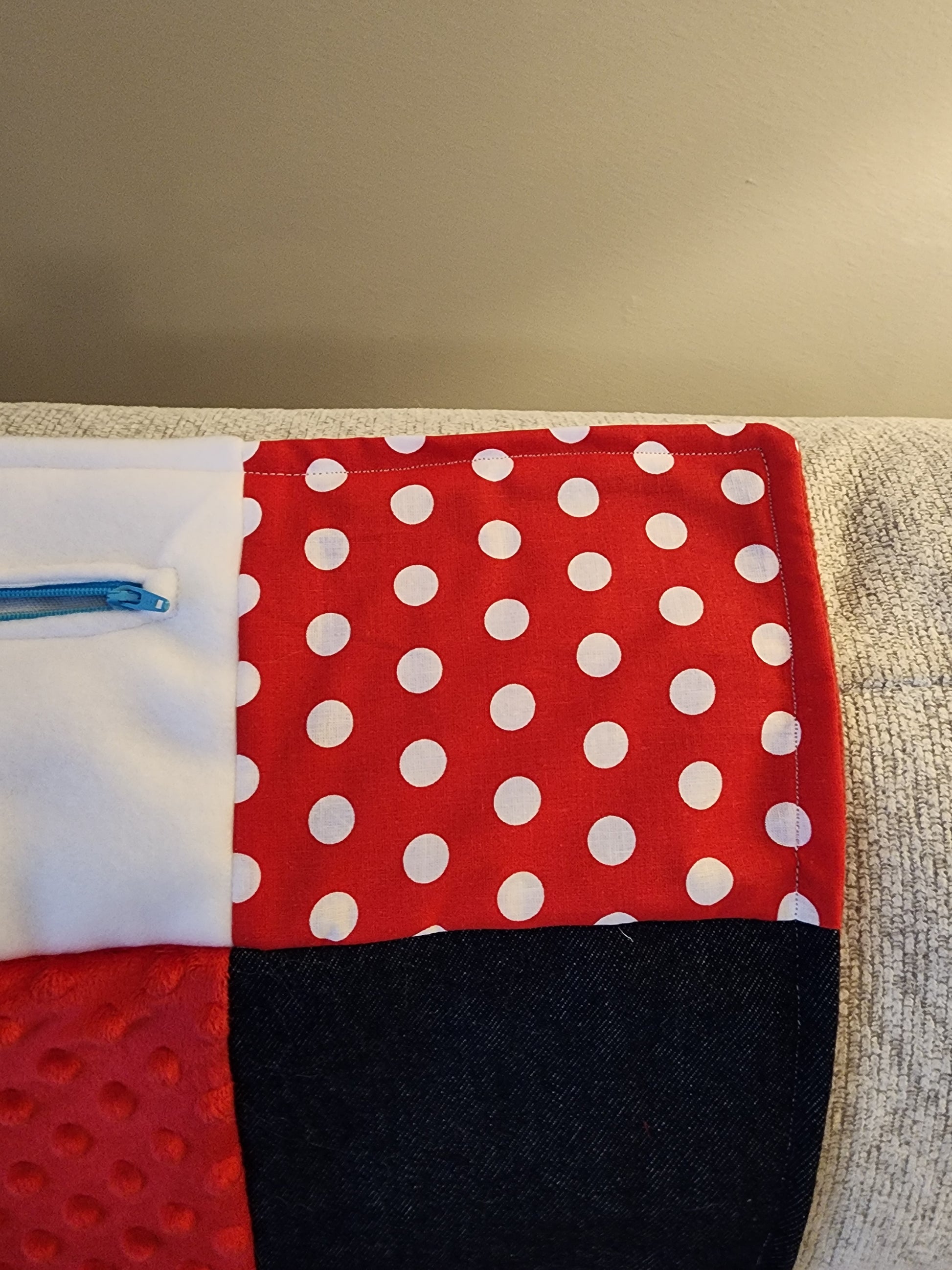 Hi everyone! This sensory blanket is perfect for all ages! It is approximately 21"x27" a perfect size for a lap. This blanket has white faux fur, red Faux fur, dimple dot minky, jean fabric, fully functional zipper pouch, eyelet fabric, fleece, cotton. The back is a red fleece.
