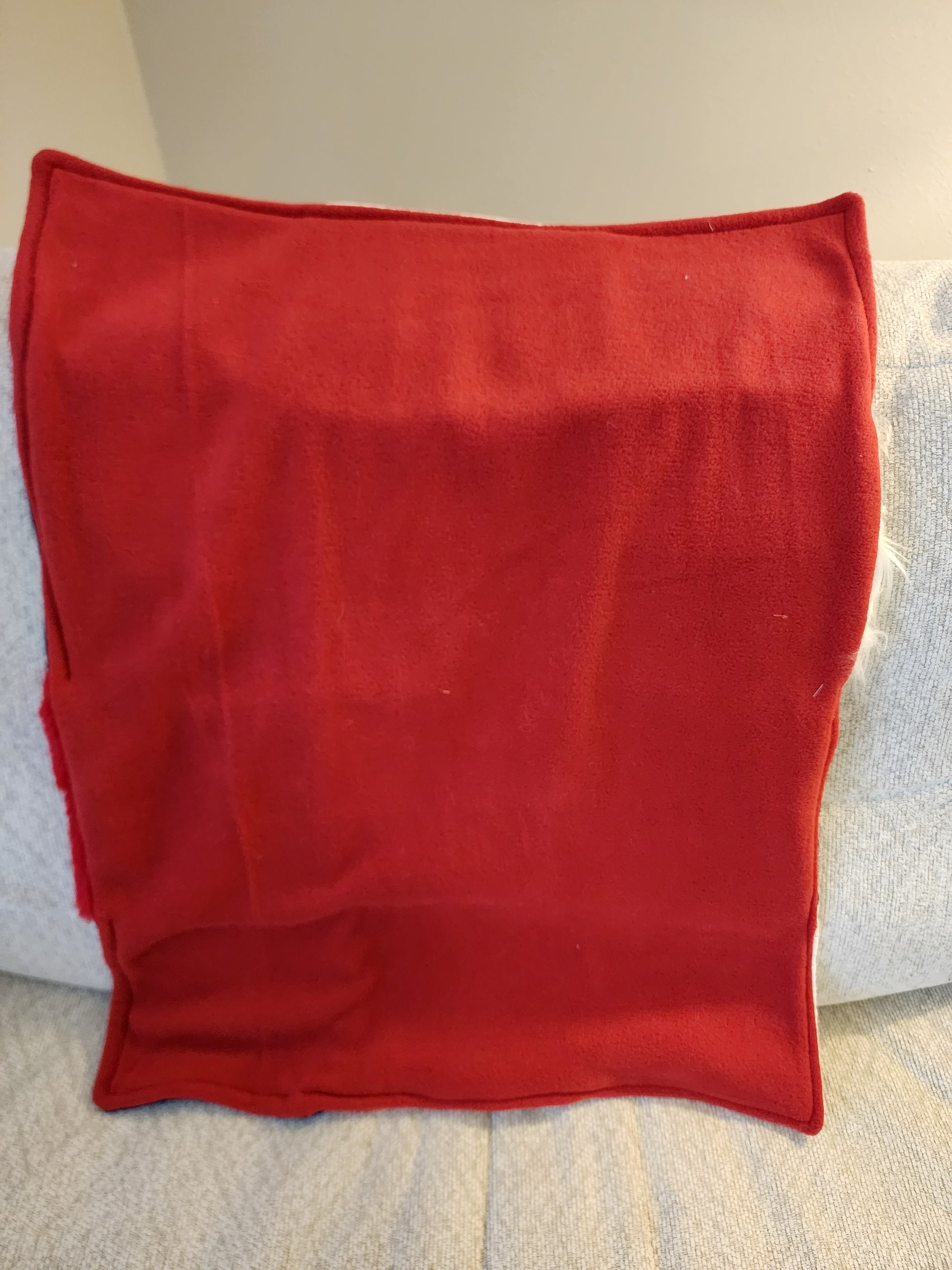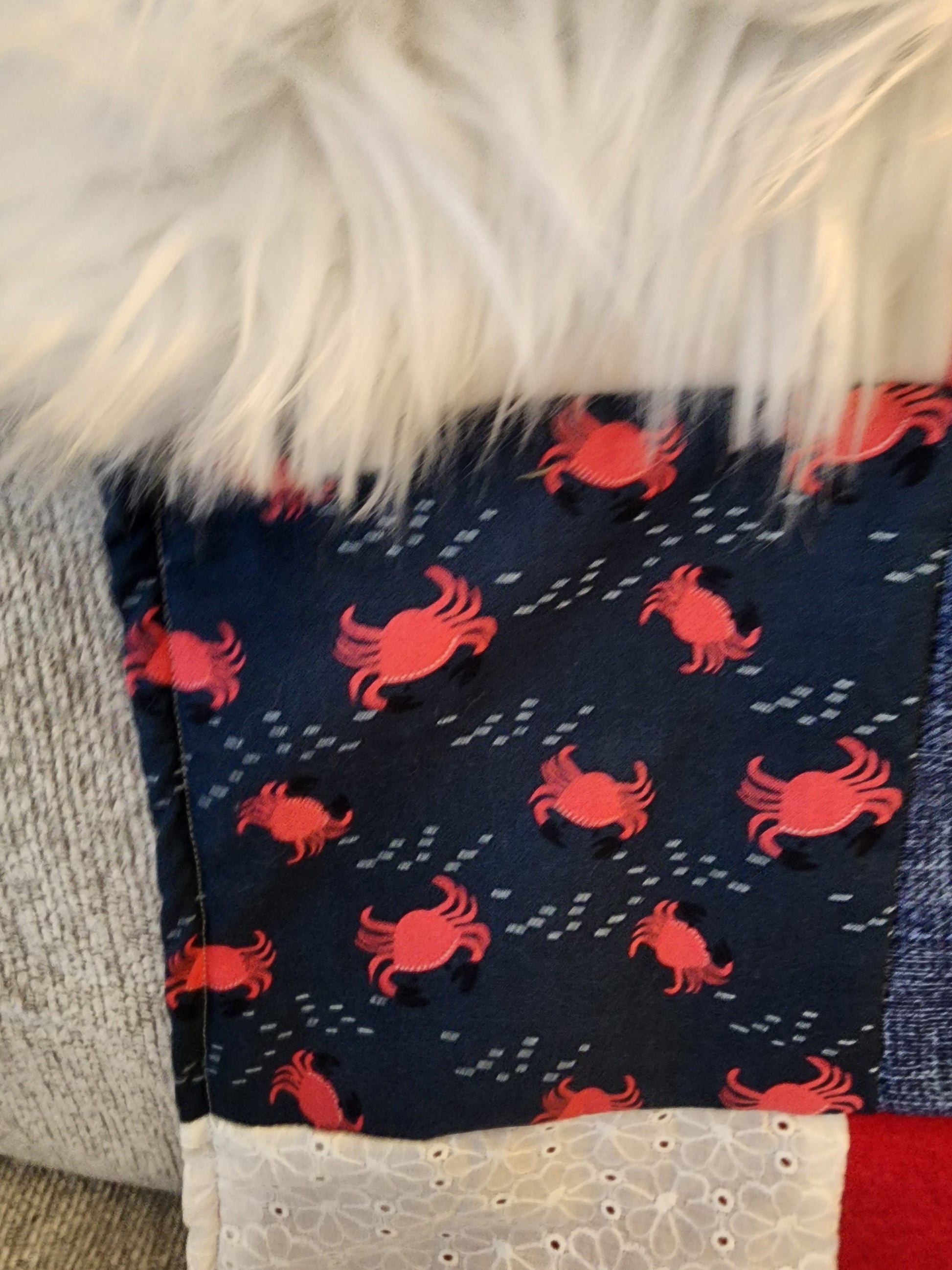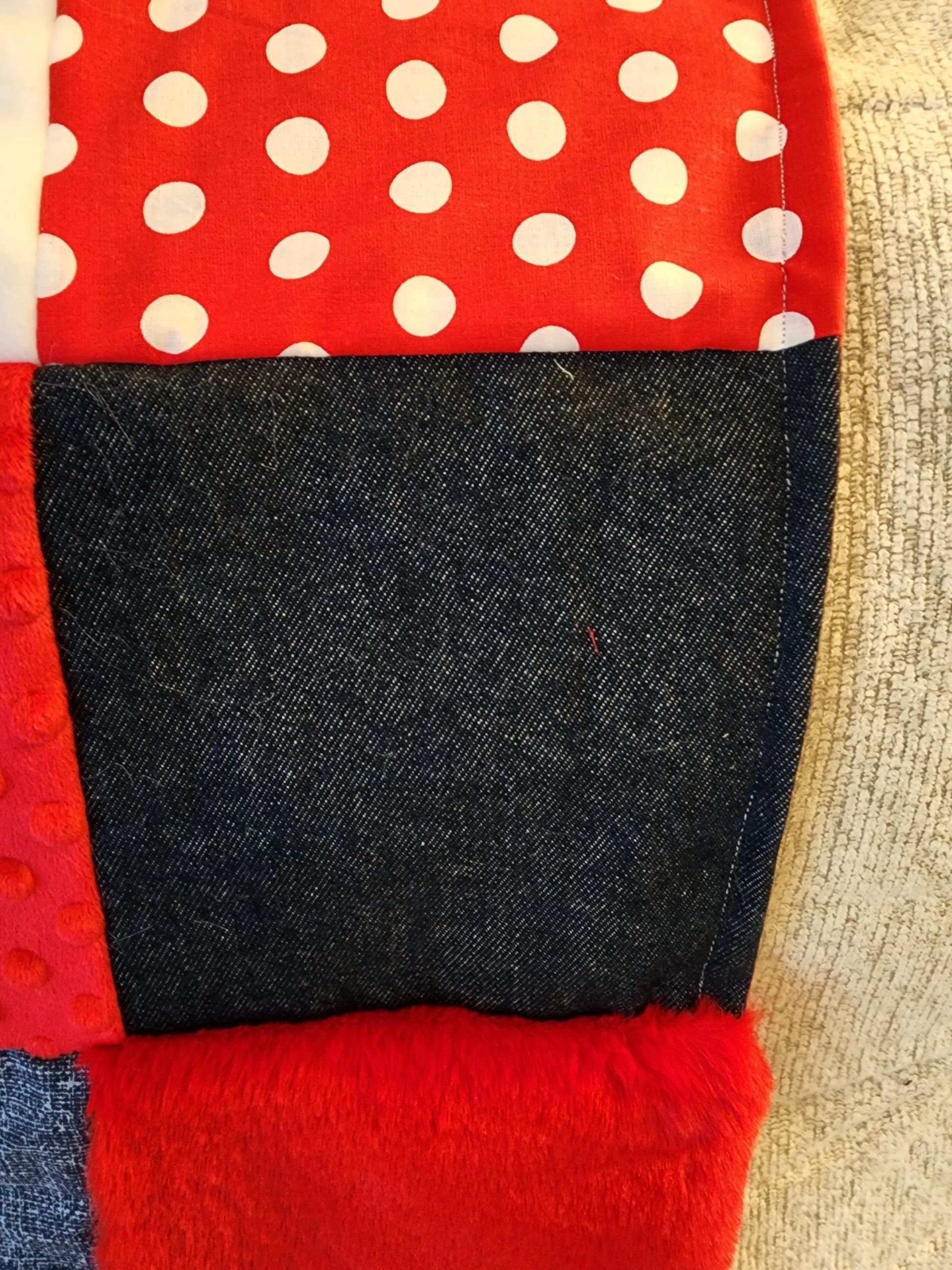 Hi everyone! This sensory blanket is perfect for all ages! It is approximately 21"x27" a perfect size for a lap. This blanket has white faux fur, red Faux fur, dimple dot minky, jean fabric, fully functional zipper pouch, eyelet fabric, fleece, cotton. The back is a red fleece.