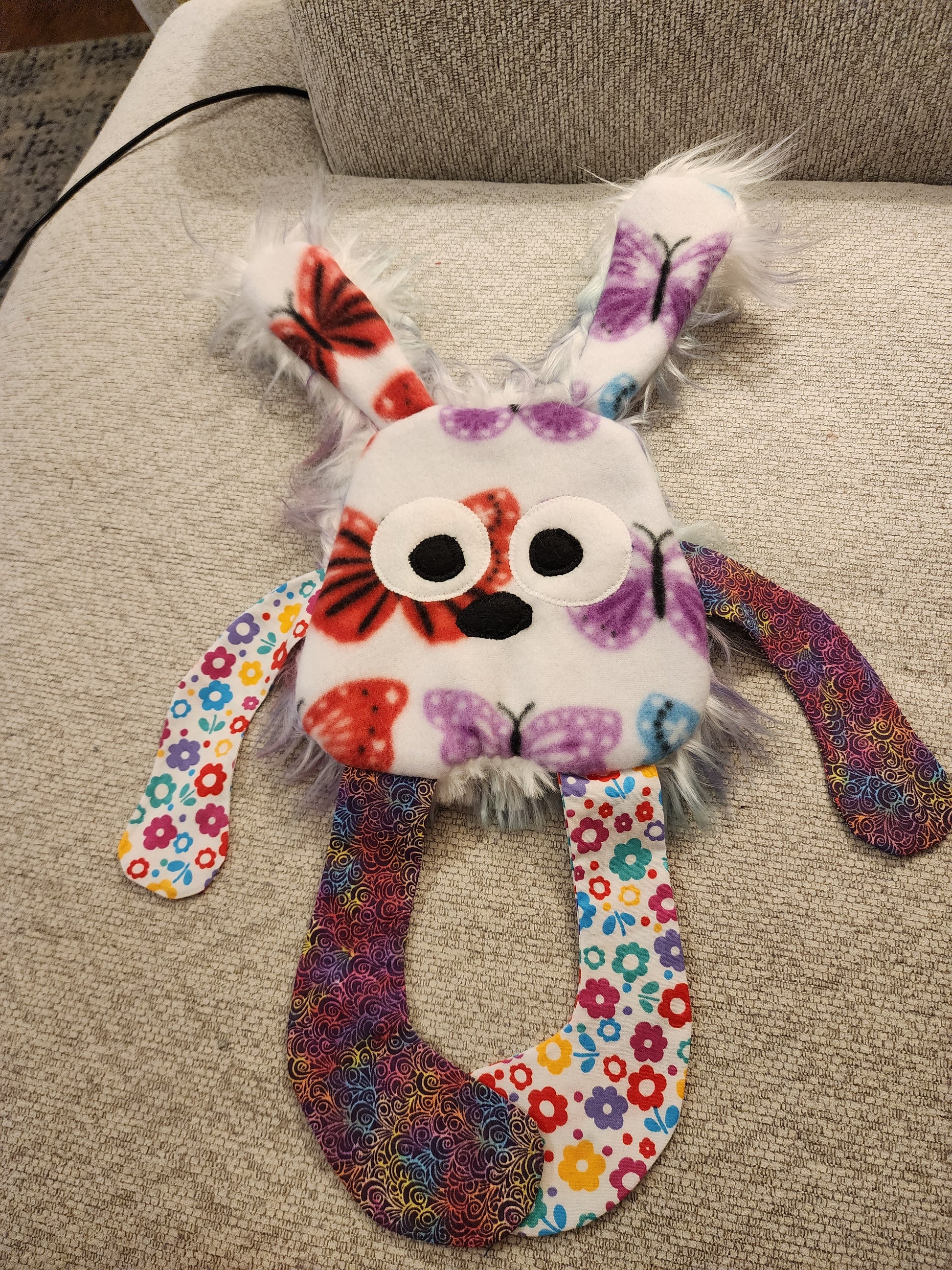 Hi everyone! Thank you for looking at my products! This is a new creation i made for little ones.. it has crinkle material in the body. Its completely make of multi color long plush fur, cotton and butterfly fleece fabrics. Perfect for someone that likes to fidget or needs that sensory. The minky is dimple dot. There is the crinkle material in the body of this one.