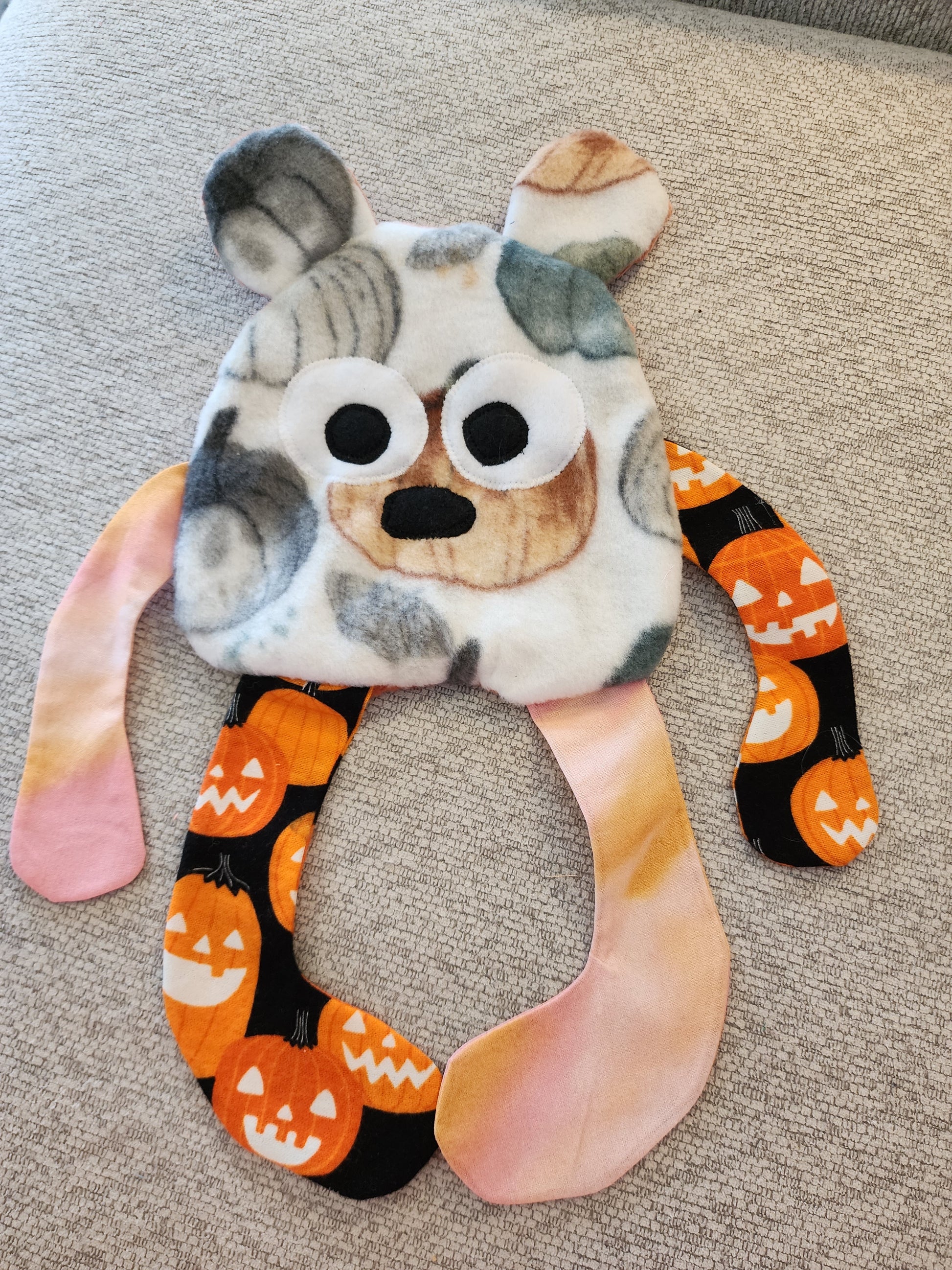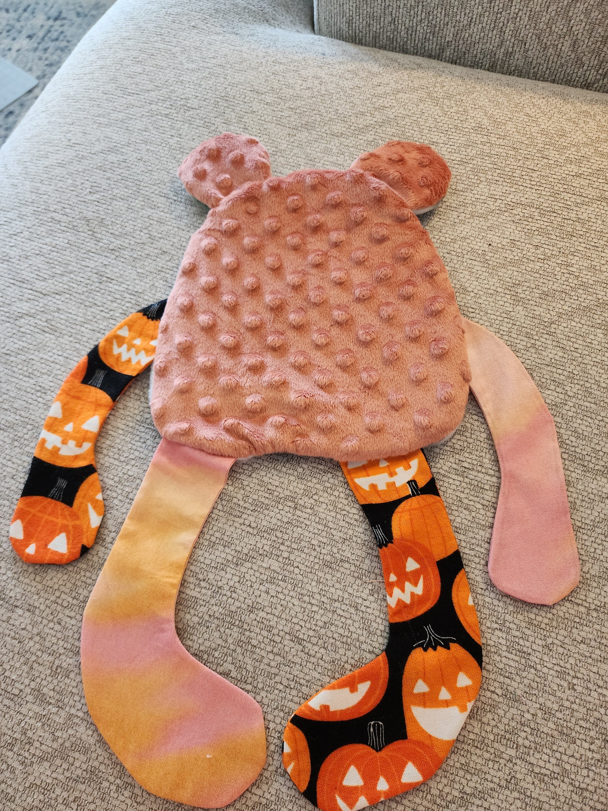Hi everyone! Thank you for looking at my products! This is a new creation i made for little ones.. it has crinkle material in the body. Its completely make of Pumpkins Fall fleece, cotton and dimple dot minky fabrics. Perfect for someone that likes to fidget or needs that sensory. The minky is dimple dot. There is the crinkle material in the body of this one.