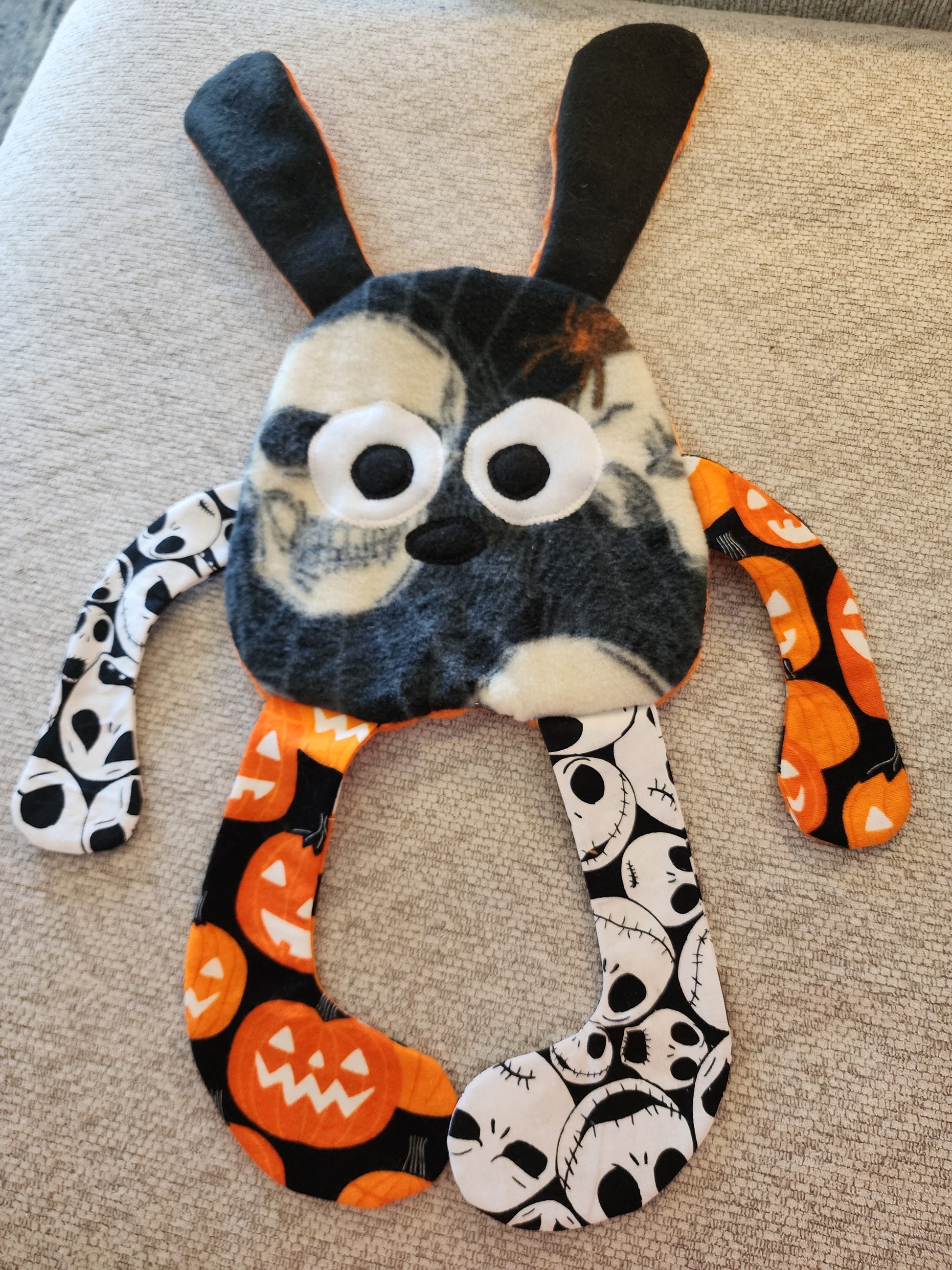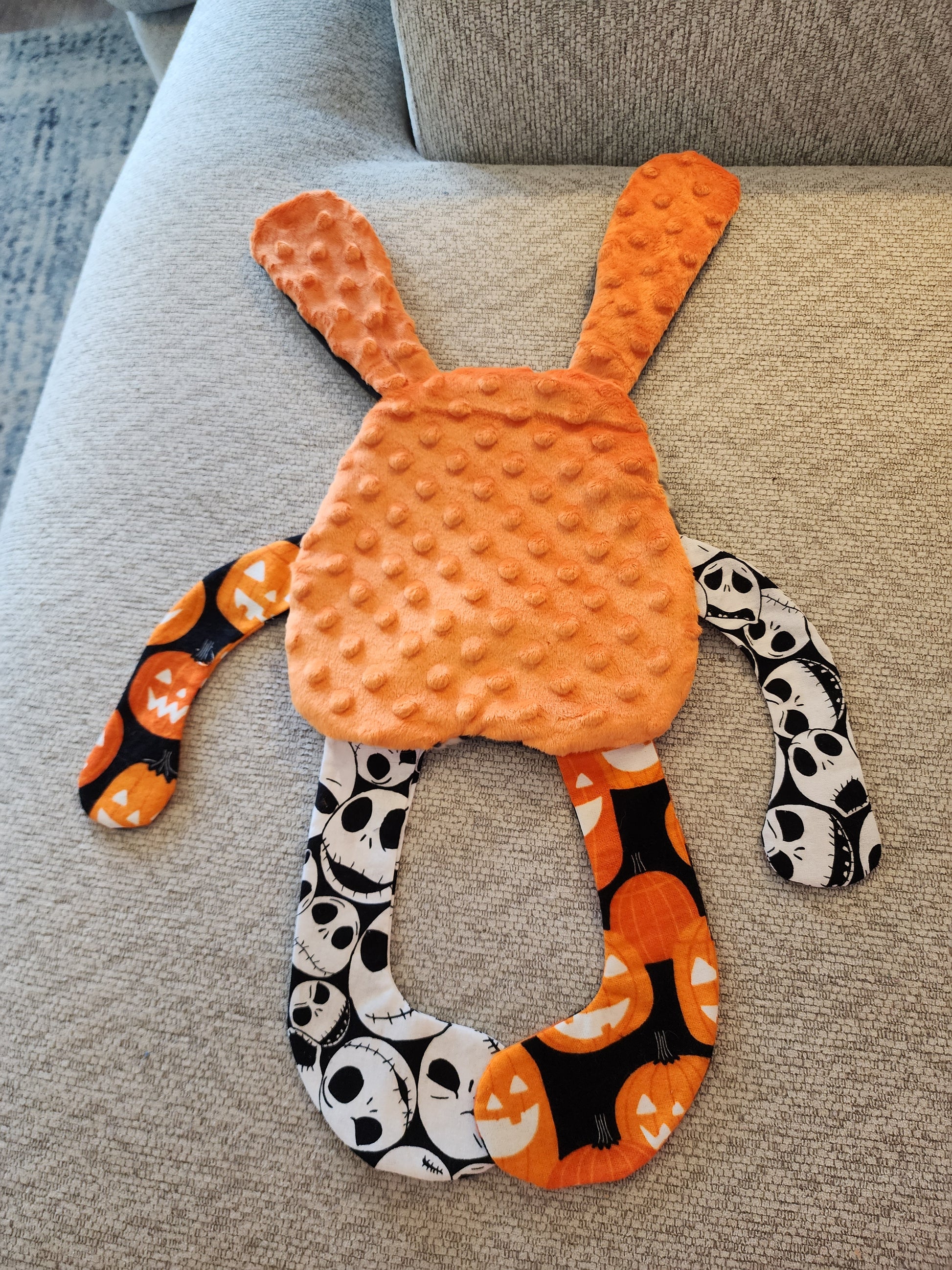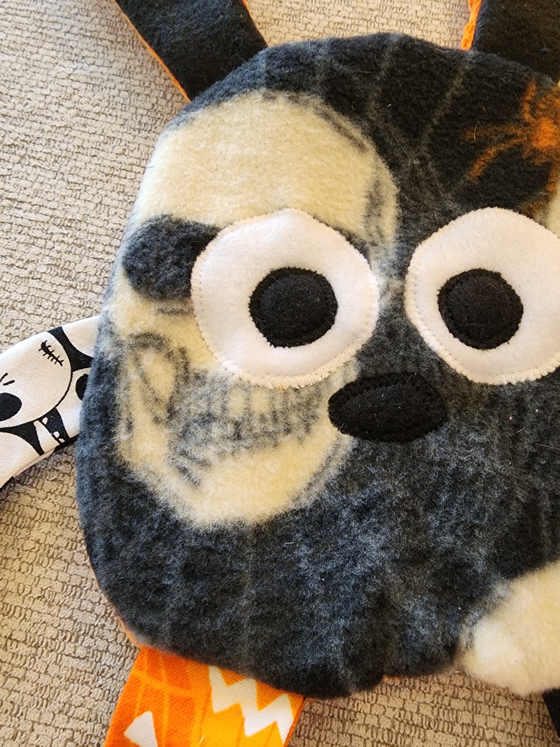 Hi everyone! Thank you for looking at my products! This is a new creation i made for little ones.. it has crinkle material in the body. Its completely make of skulls halloween fleece, cotton and dimple dot minky fabrics. Perfect for someone that likes to fidget or needs that sensory. The minky is dimple dot. There is the crinkle material in the body of this one.