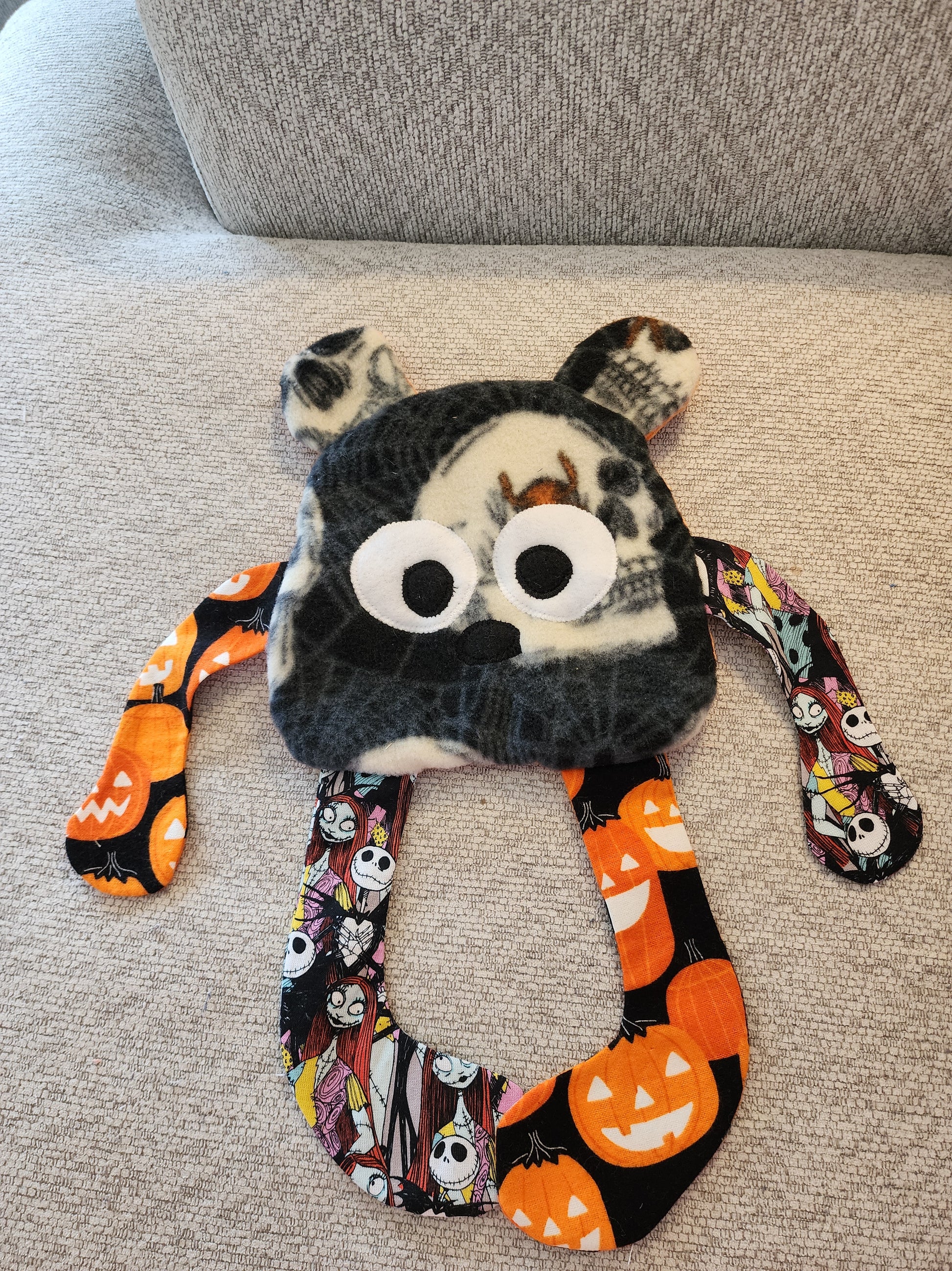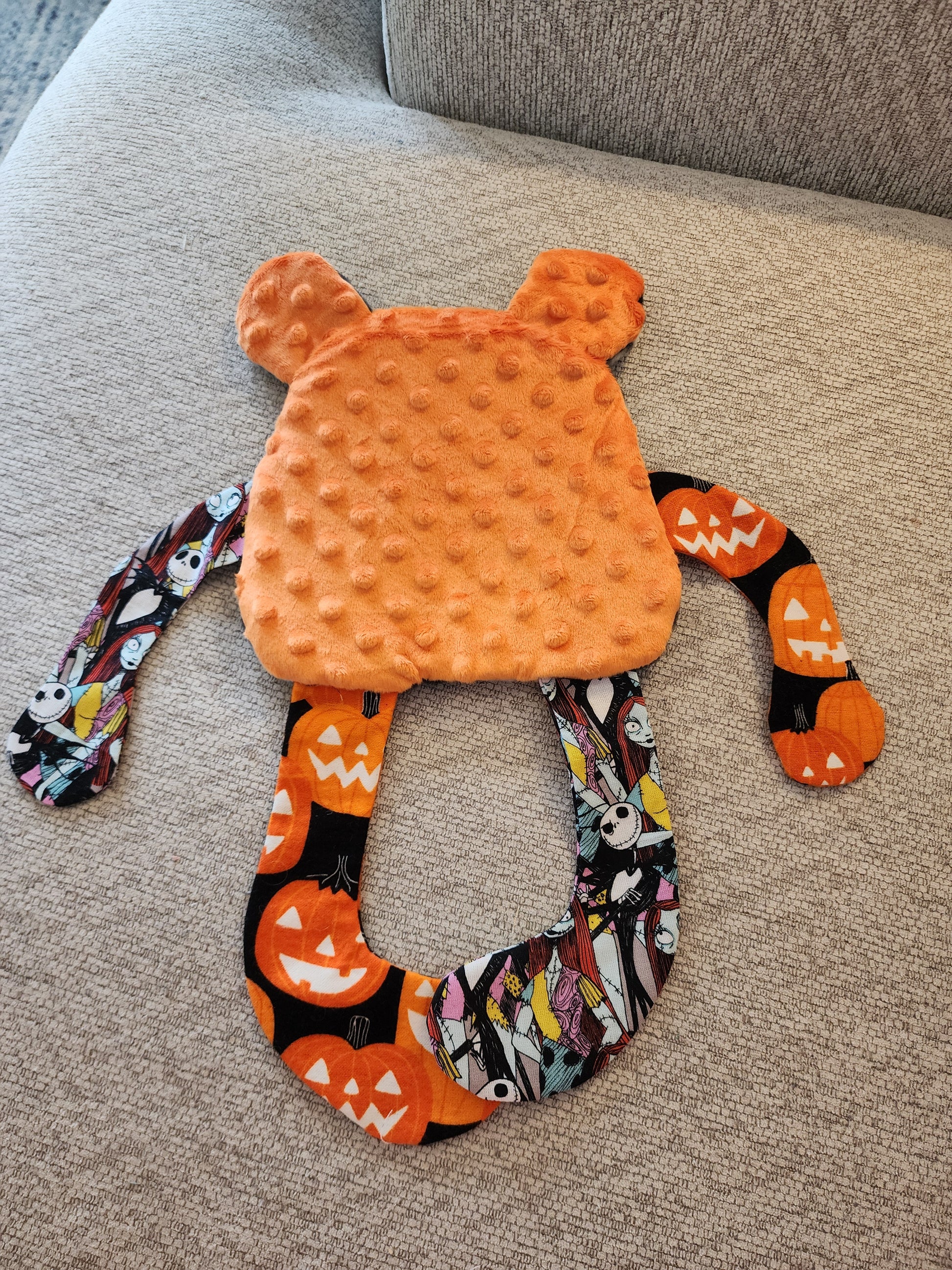 Hi everyone! Thank you for looking at my products! This is a new creation i made for little ones.. it has crinkle material in the body. Its completely make of skulls spiders Halloween fleece, cotton and dimple dot minky fabrics. Perfect for someone that likes to fidget or needs that sensory. The minky is dimple dot. There is the crinkle material in the body of this one.