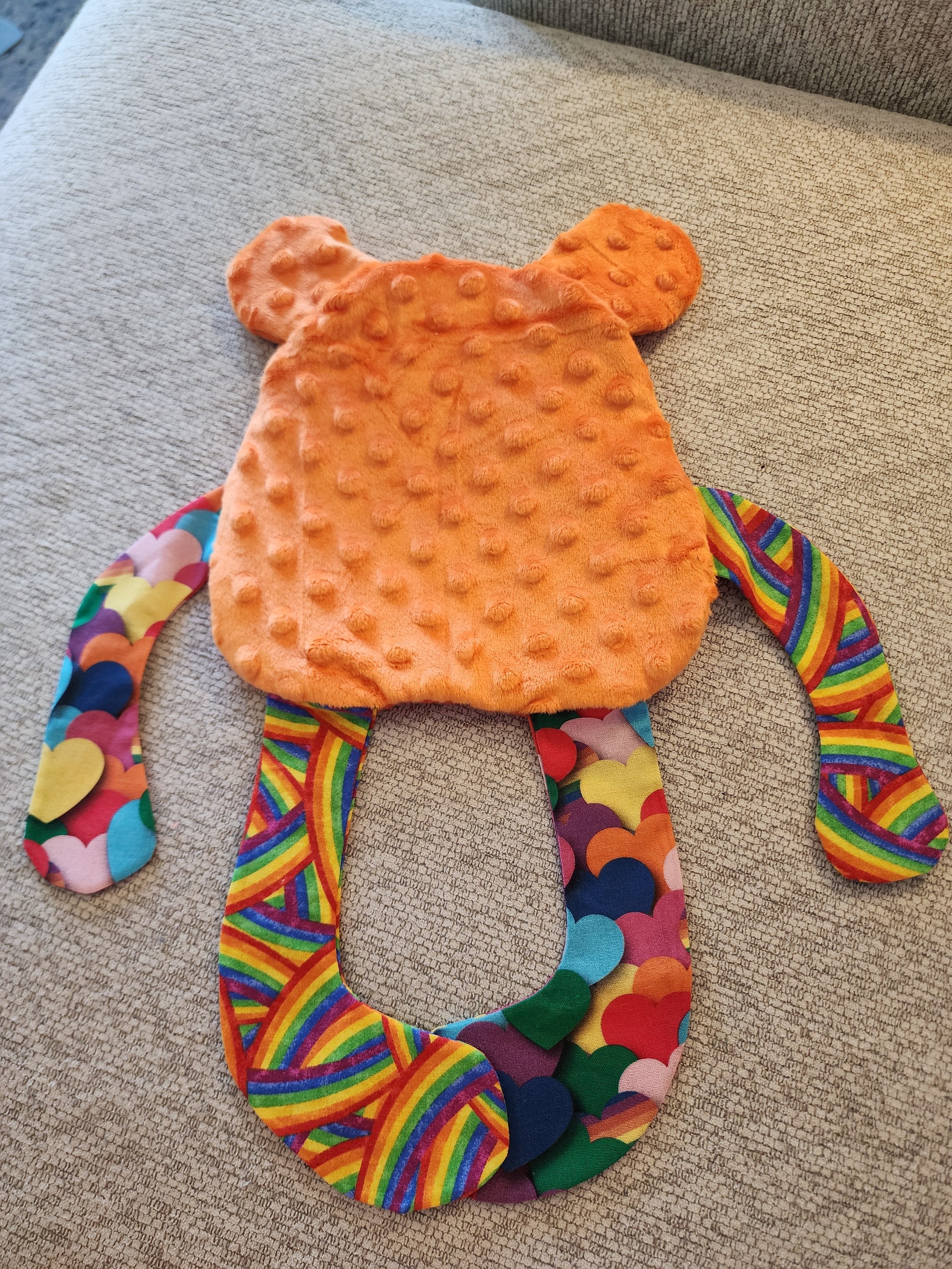Hi everyone! Thank you for looking at my products! This is a new creation i made for little ones.. it has crinkle material in the body. Its completely make of sunset stripes fleece, cotton and orange dimple dot minky fabrics. Perfect for someone that likes to fidget or needs that sensory. The minky is dimple dot. There is the crinkle material in the body of this one.