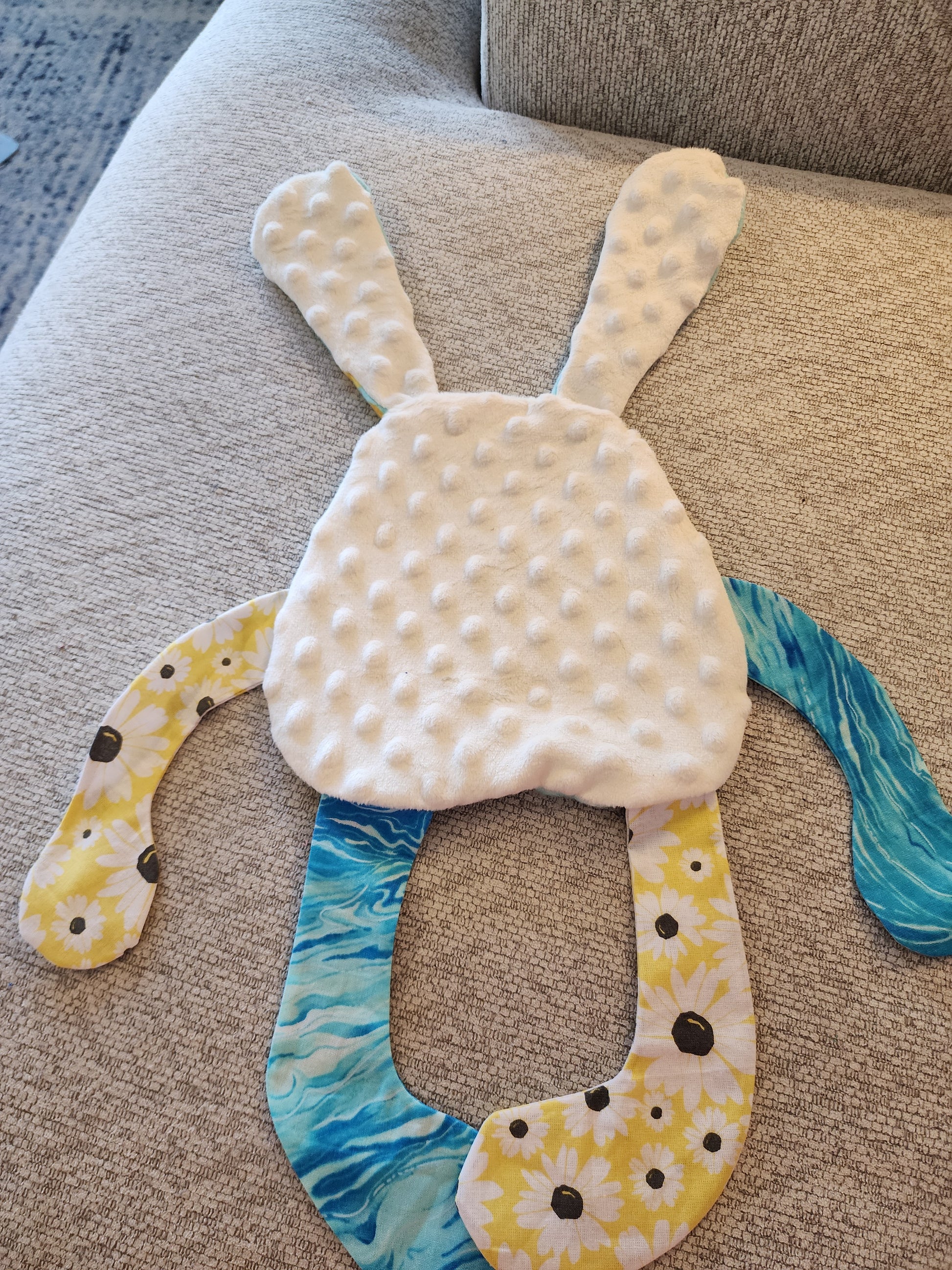 Hi everyone! Thank you for looking at my products! This is a new creation i made for little ones.. it has crinkle material in the body. Its completely make of Yellow Rubber Duckies fleece, cotton and dimple dot minky fabrics. Perfect for someone that likes to fidget or needs that sensory. The minky is dimple dot. There is the crinkle material in the body of this one.