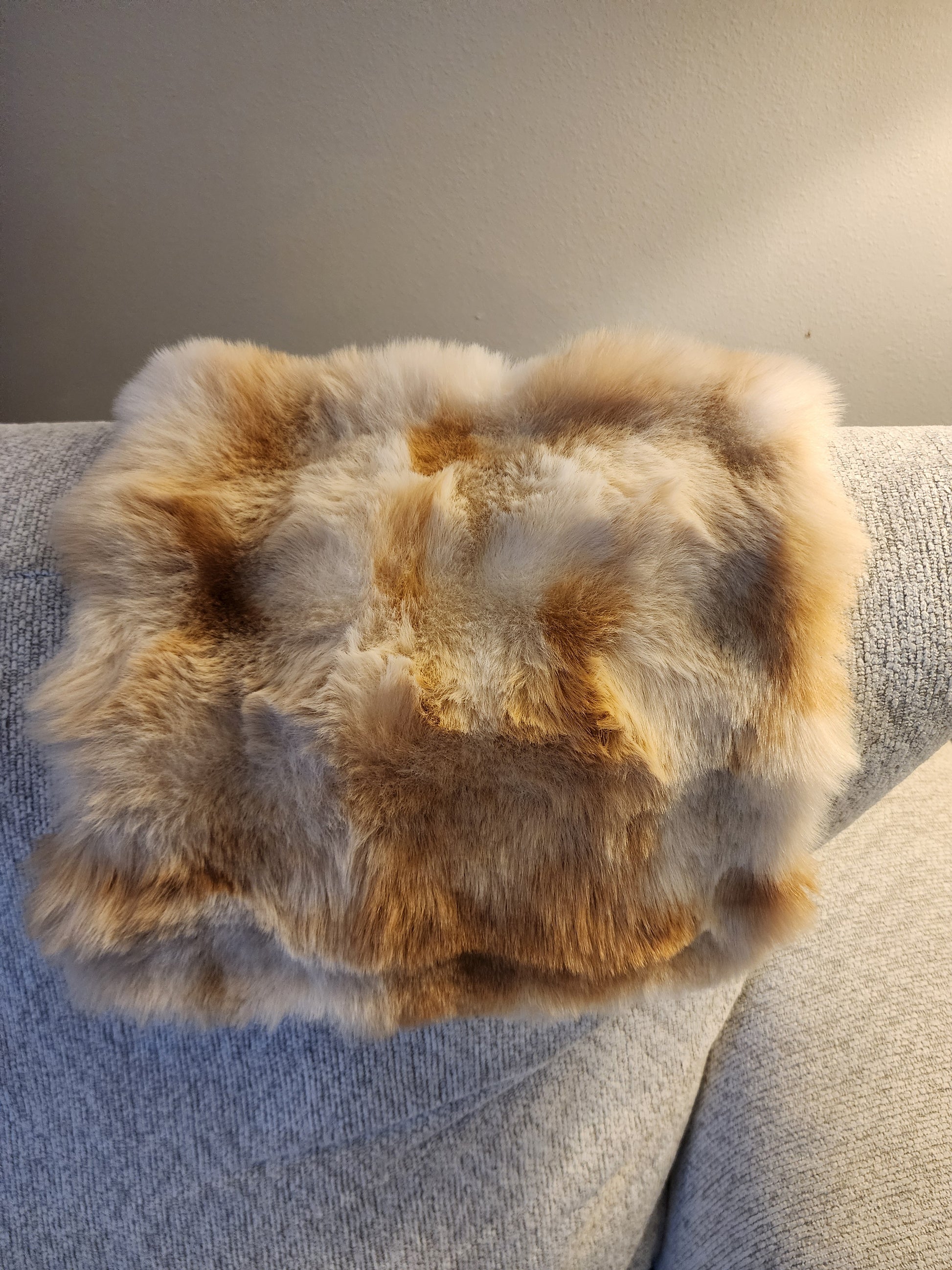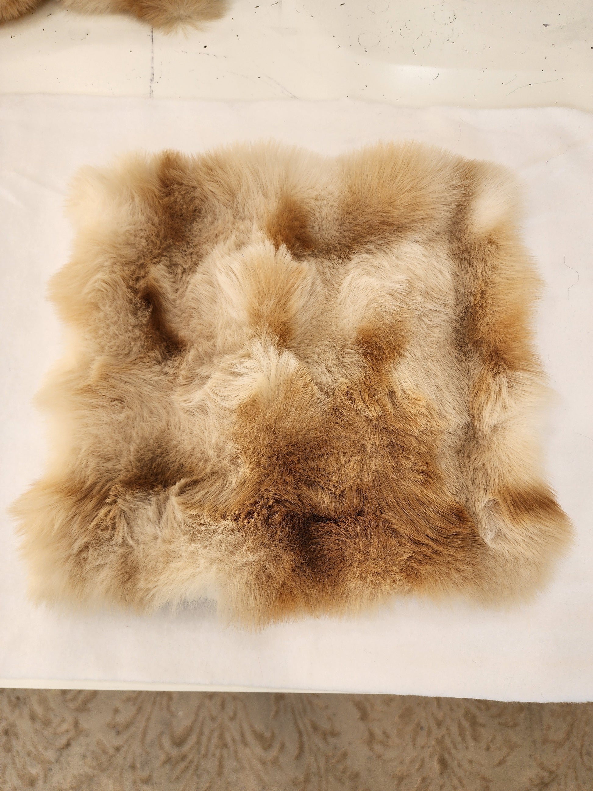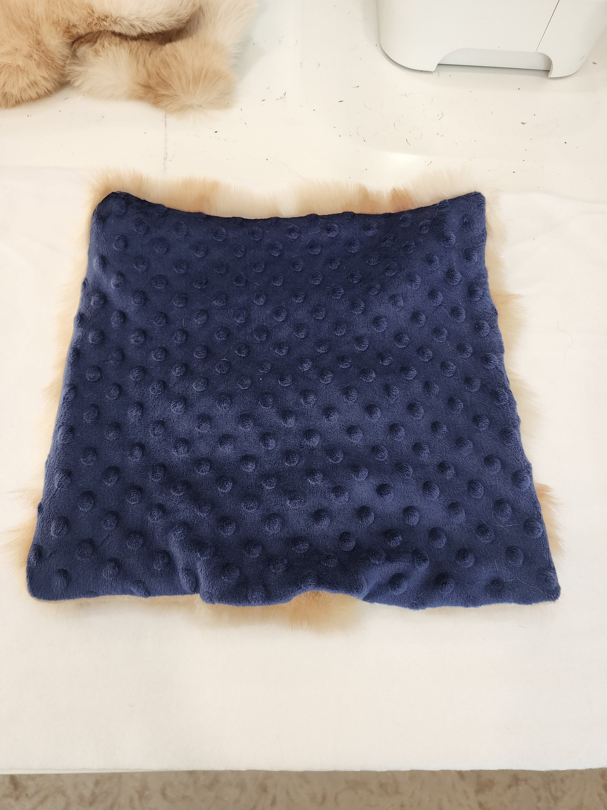 This Long pile Plush tan with the navy blue dimple dot on the other side. This one is approximately 12"x12" square